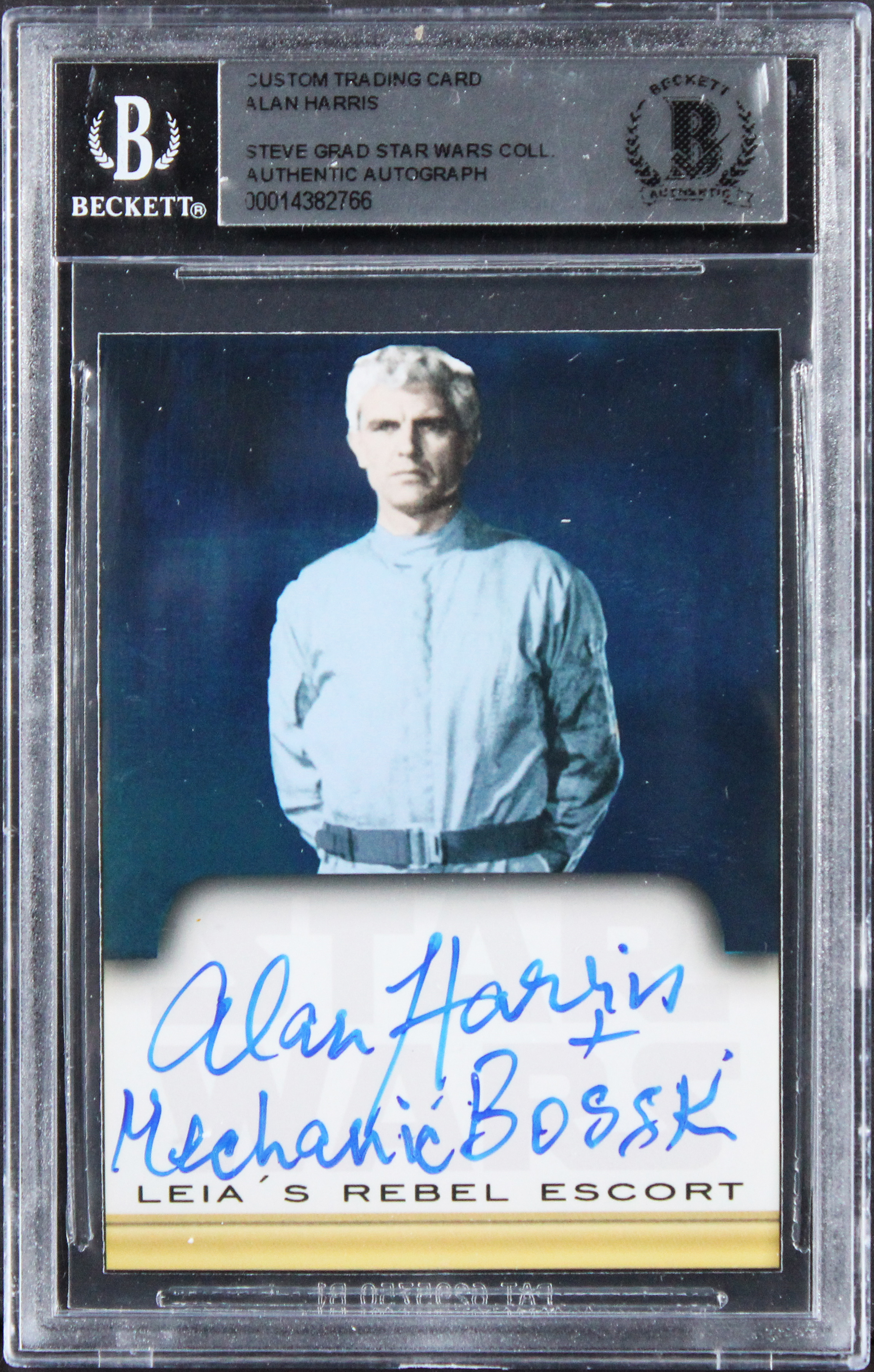 This Autographed Custom Trading Card with the inscription of "Mechanic & Bossk" has been Personally Signed by Alan Harris of Star Wars. This item is 100% Authentic, it comes slabbed and authenticated by Beckett Authentication Services. The authenticity can be verified on Beckett Authentication Services website.