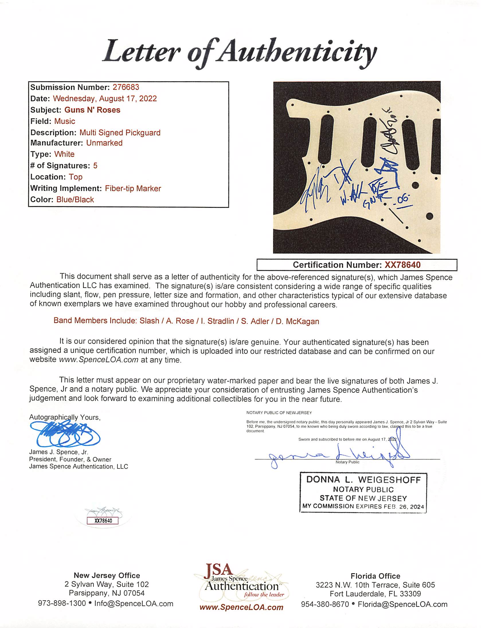 This Autographed Left Handed Fender Squier Guitar has been Personally Signed by Axl Rose, Slash, Izzy Stradlin, Steven Adler & Duff McKagan of Guns N' Roses. This item is 100% Authentic to include a Certificate of Authenticity (COA) / hologram by JSA. The authenticity can be verified on JSA website.
