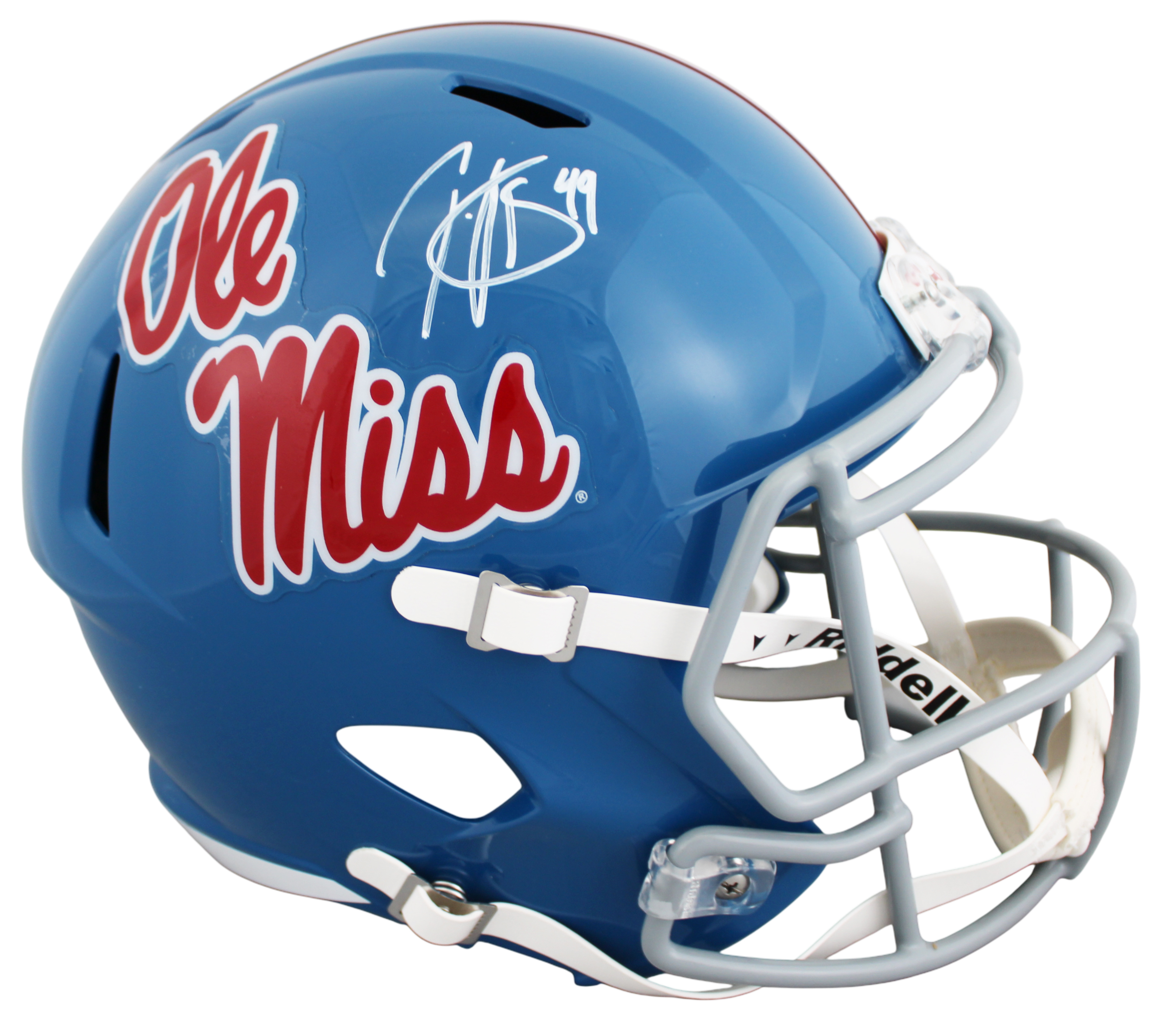 This Autographed Powder Blue Riddell Full Size Speed Rep Helmet has been Personally Signed by Patrick Willis of the Mississippi Rebels. This item is 100% Authentic to include a hologram by Beckett Authentication Services. This item will come with an affixed Beckett Authentication Services (BAS) authentication sticker, which includes a scannable QR code to verify authenticity. Please note that Beckett no longer provides serial-numbered COA cards, and the attached BAS sticker will serve as the complete authentication for this item. This is a BAS Witnessed Protection Program item which means a Beckett Authentication Service representative was present when this item was being signed. We conducted an autograph signing with Patrick Willis where multiples of the same item were signed. While the photographs are representative of this item, the size, placement and strength of the signature may vary. Each item is hand signed, therefore, each autograph is unique. This item can be verified through BAS Witnessed.