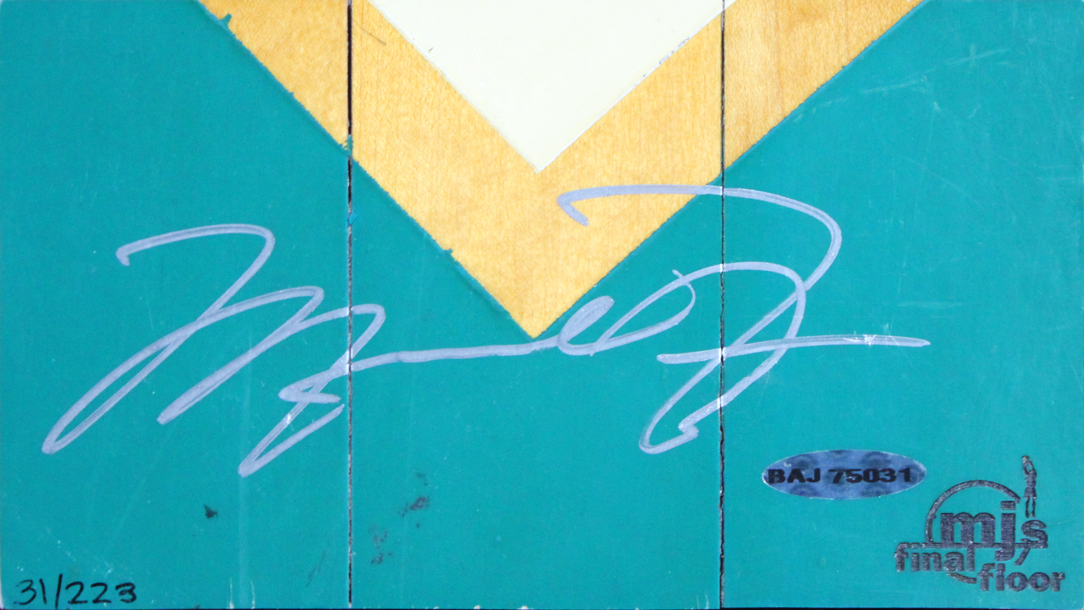 This Autographed Limited Edition #31/233 & Framed 4x6.5 1998 Finals Game 6 Game Used Delta Center Final Game Floor Piece Floorboard has been Personally Signed by Michael Jordan of the Chicago Bulls. This item is 100% Authentic to include a Certificate of Authenticity (COA) / hologram by UDA. The authenticity can be verified on Upper Deck Authentic website. This item has been professionally framed to overall dimensions of approximately 15.5 x 23.5 inches. The Frame has been replaced on this item, also it does not come with the matching UDA COA, only the hologram on the floor.