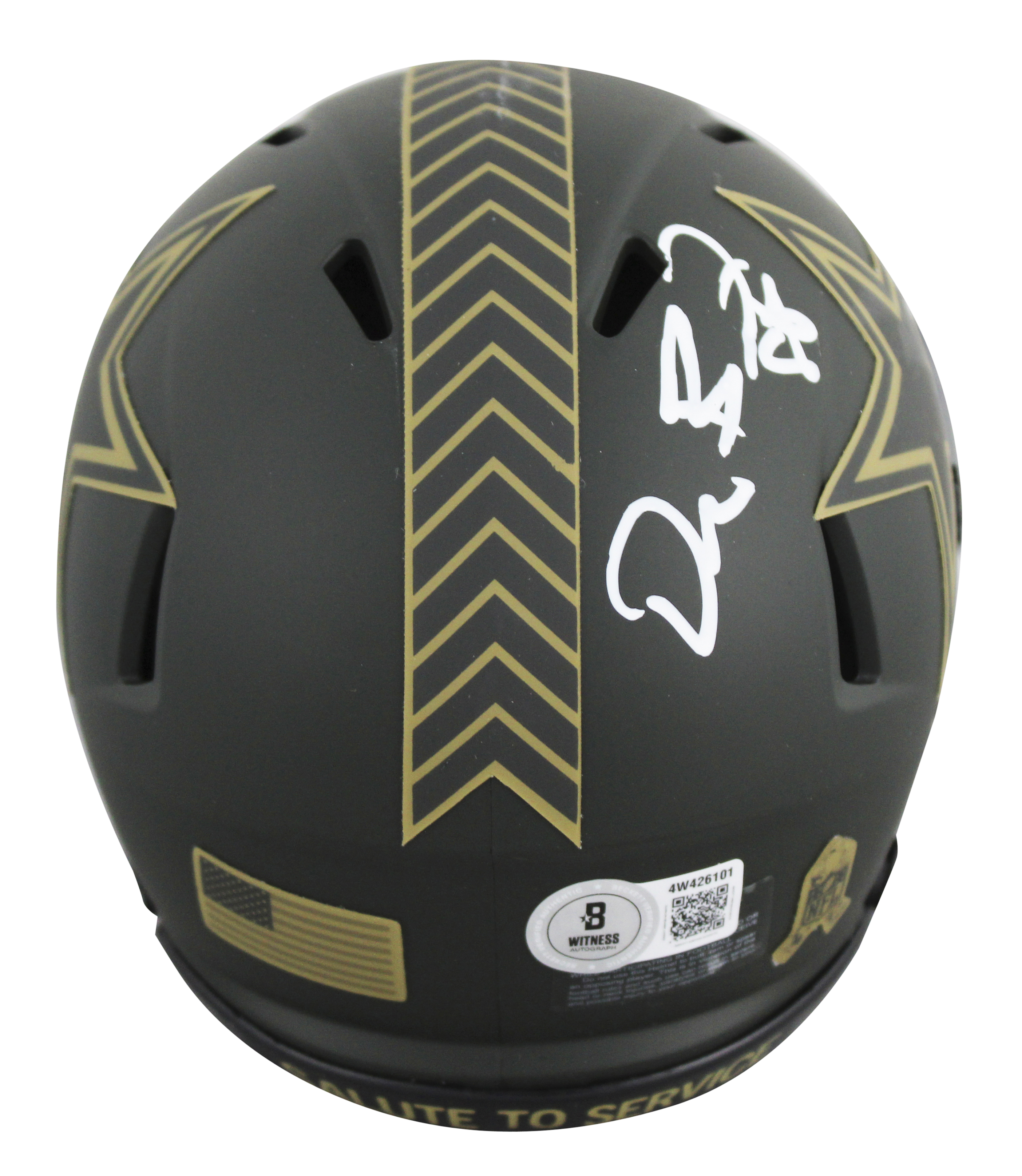 This Autographed Alternate 2025 Salute to Service IV Speed Mini Helmet W/ Uv Mirrored Back Acrylic Display Case has been Personally Signed by Dez Bryant of the Dallas Cowboys. This item is 100% Authentic to include a hologram by Beckett Authentication Services. This item will come with an affixed Beckett Authentication Services (BAS) authentication sticker, which includes a scannable QR code to verify authenticity. Please note that Beckett no longer provides serial-numbered COA cards, and the attached BAS sticker will serve as the complete authentication for this item. This is a BAS Witnessed Protection Program item which means a Beckett Authentication Service representative was present when this item was being signed. We conducted an autograph signing with Dez Bryant where multiples of the same item were signed. While the photographs are representative of this item, the size, placement and strength of the signature may vary. Each item is hand signed, therefore, each autograph is unique. This item can be verified through BAS Witnessed.