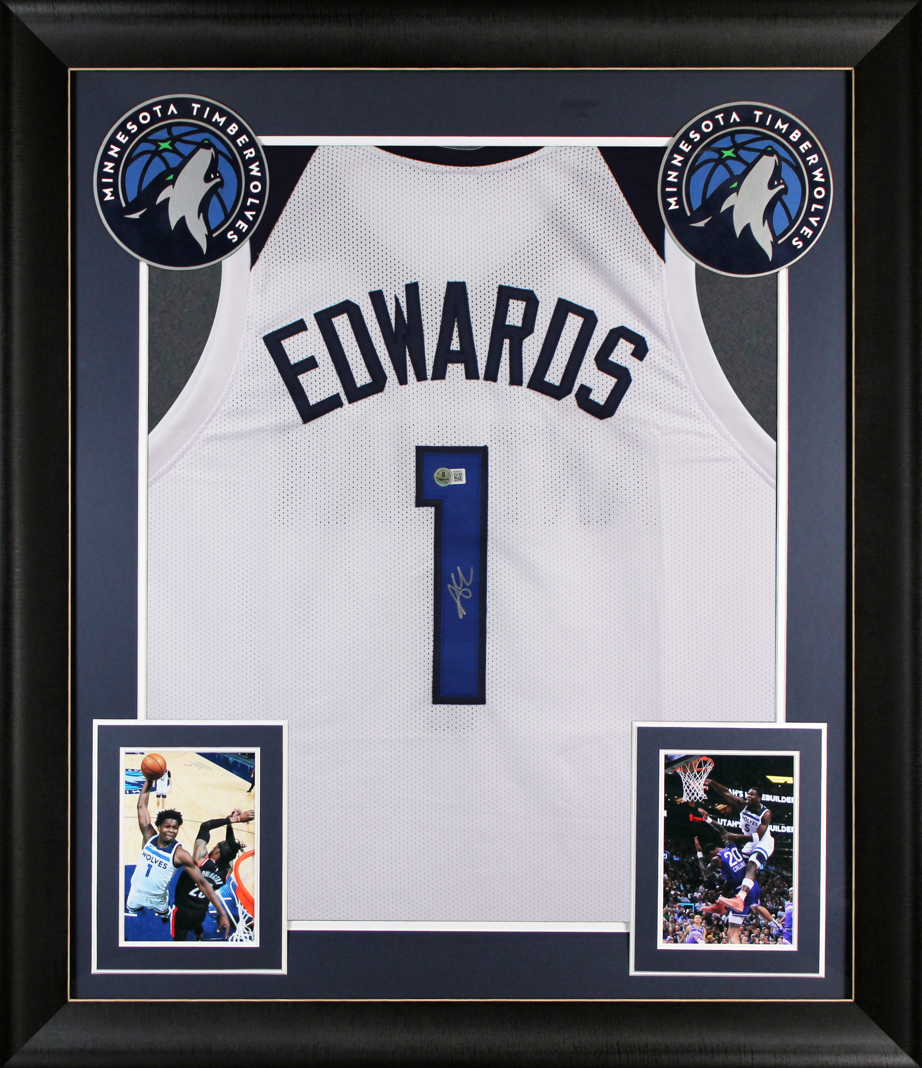 This Autographed White Pro Style Framed Jersey has been Personally Signed by Anthony Edwards of the Minnesota Timberwolves. This item is 100% Authentic to include a hologram by Beckett Authentication Services. This item will come with an affixed Beckett Authentication Services (BAS) authentication sticker, which includes a scannable QR code to verify authenticity. Please note that Beckett no longer provides serial-numbered COA cards, and the attached BAS sticker will serve as the complete authentication for this item. We have multiples of this same item. While the photographs are representative of this item, the size, placement and strength of the signature may vary. Each item is hand signed, therefore, each autograph is unique. This item has been professionally framed to overall dimensions of approximately 32 x 37 inches. This is a X-Large sized, non-branded, custom-stitched Framed Jersey. This jersey will be framed to order, it will take approximately 4-5 business days from purchase date for it to ship.