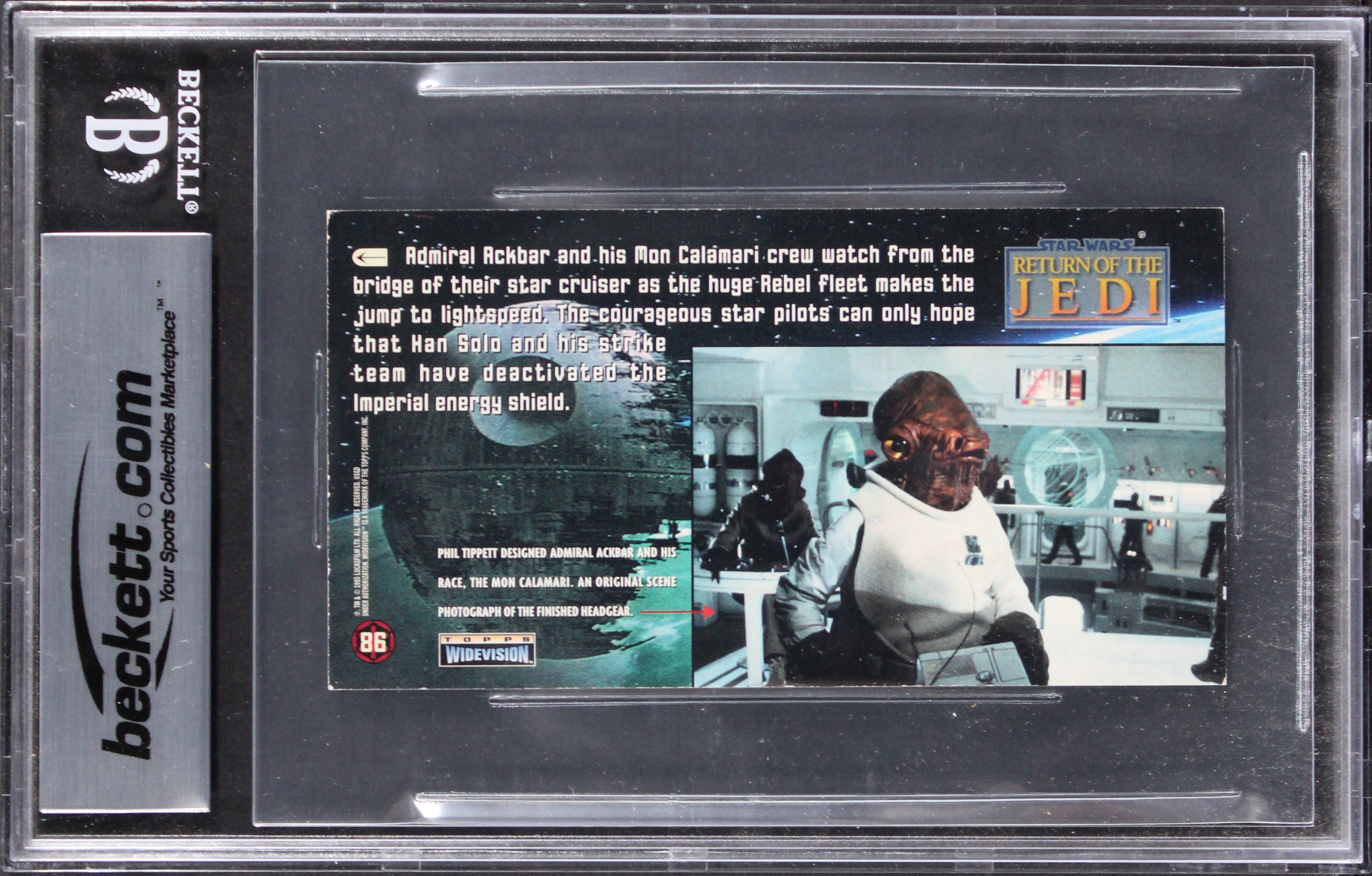 This Autographed 1996 SW Return Of The Jedi Widevision #86 Auto Grade Gem Mint 10! Card with the inscription of "Admiral Ackbar & Tessek" has been Personally Signed by Tim Rose & Gerald Home of Star Wars. This item is 100% Authentic, it comes slabbed and authenticated by Beckett Authentication Services. The authenticity can be verified on Beckett Authentication Services website.