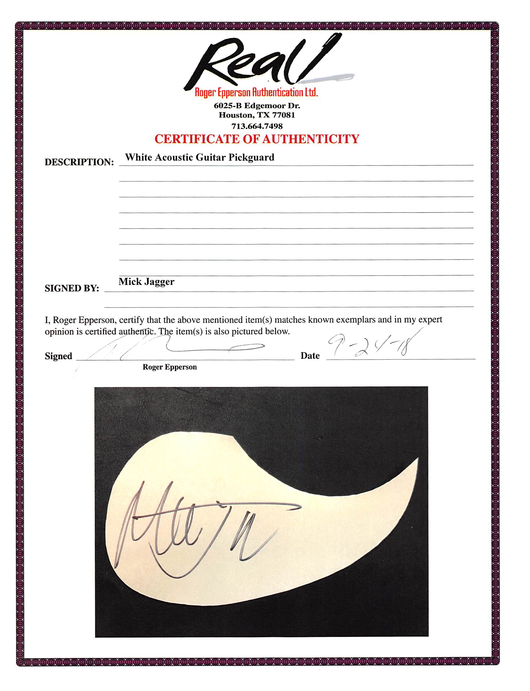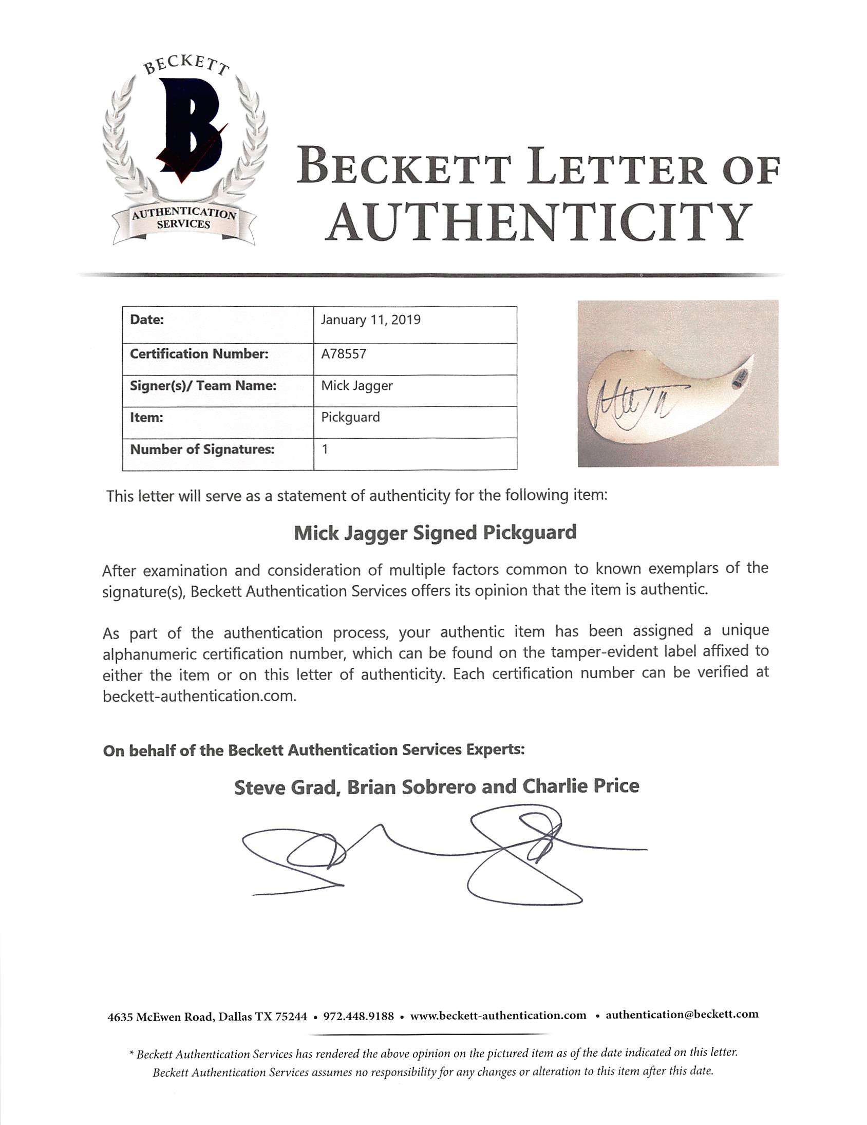 This Autographed Natural Acoustic Guitar has been Personally Signed by Mick Jagger of The Rolling Stones. This item is 100% Authentic to include a Certificate of Authenticity (COA) / hologram by Beckett Authentication Services. The authenticity can be verified on Beckett Authentication Services website.