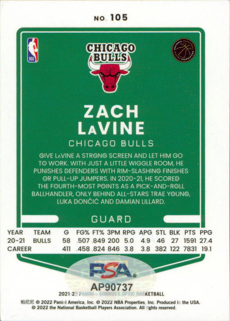 Bulls Zach LaVine Authentic Signed 2021 Donruss Optic #105 Card PSA/DNA #AP90737