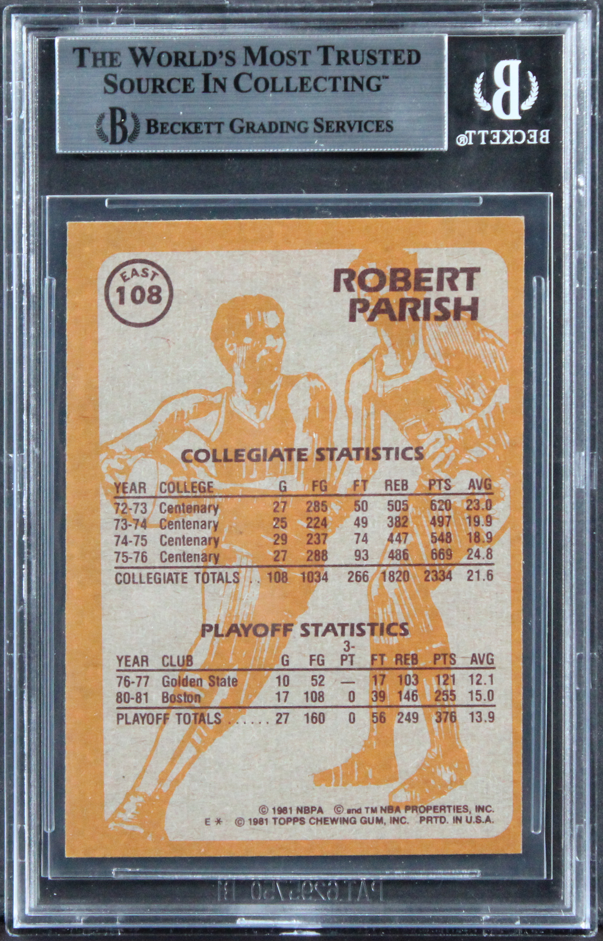 This Autographed 1990 Hoops Action Photos #108 Card has been Personally Signed by Robert Parish of the Boston Celtics. This item is 100% Authentic, it comes slabbed and authenticated by Beckett Authentication Services. The authenticity can be verified on Beckett Authentication Services website.