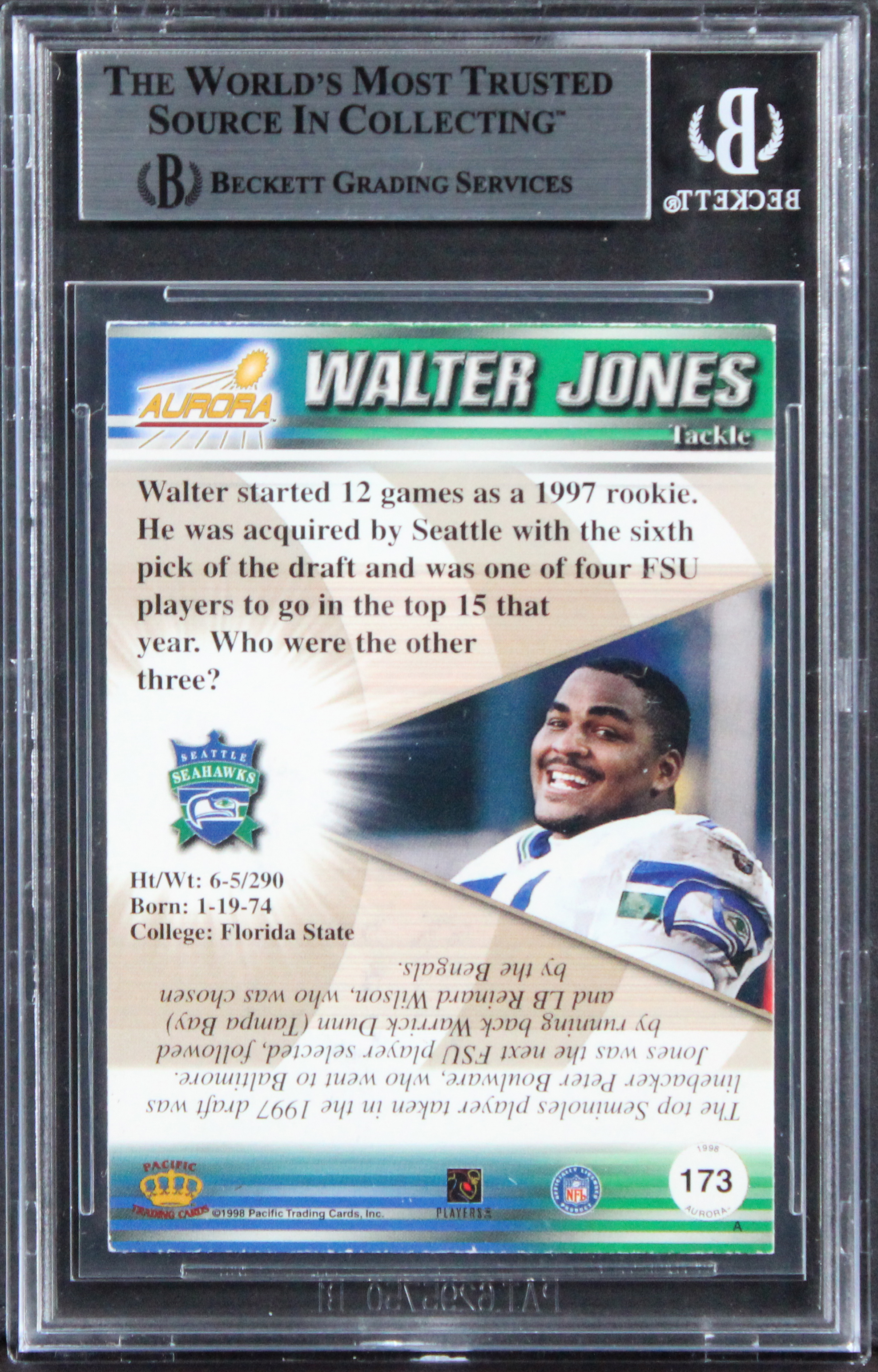 This Autographed 1998 Aurora #173 Card with the inscription of "HOF 14" has been Personally Signed by Walter Jones of the Seattle Seahawks. This item is 100% Authentic, it comes slabbed and authenticated by Beckett Authentication Services. The authenticity can be verified on Beckett Authentication Services website.