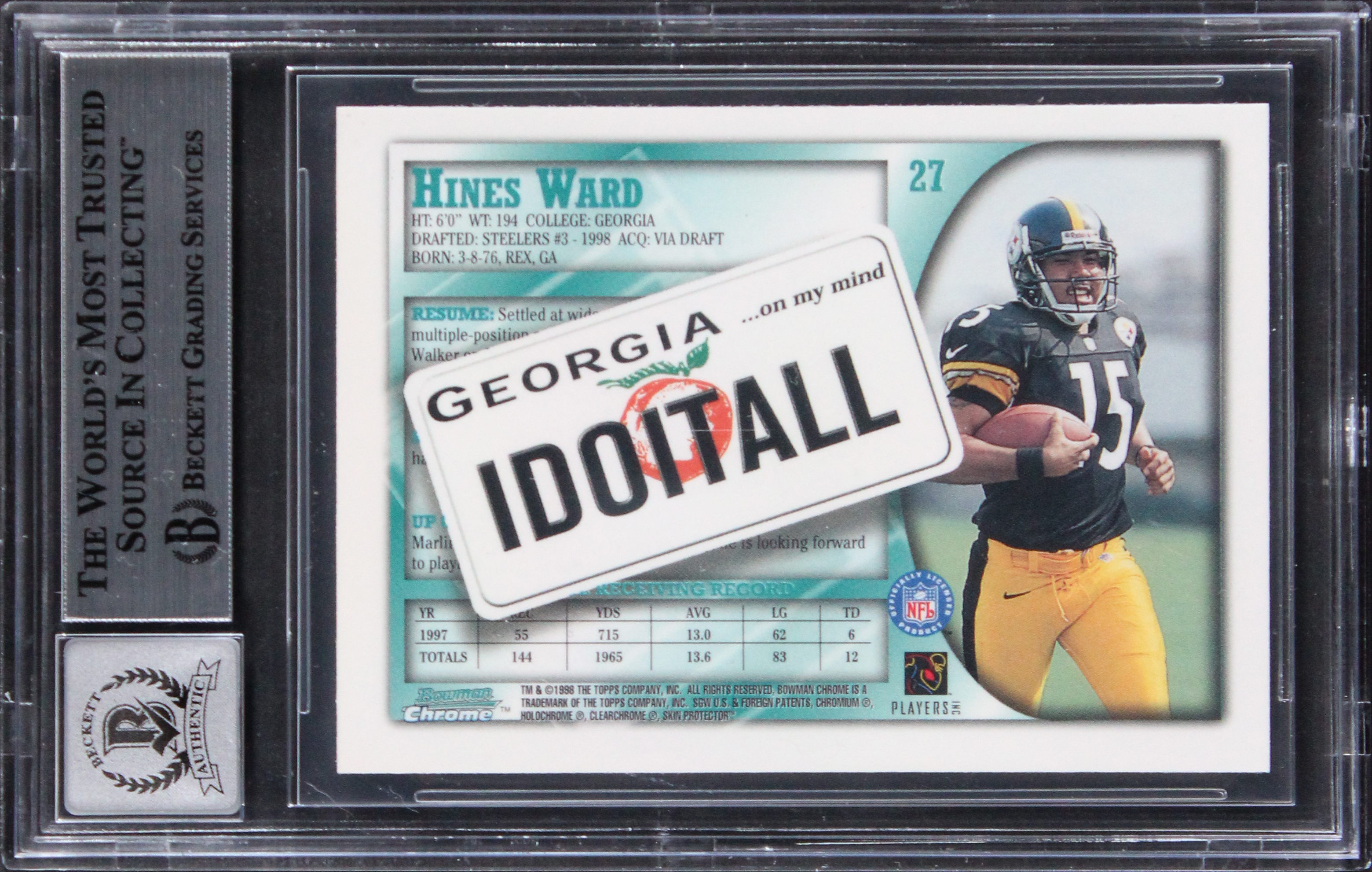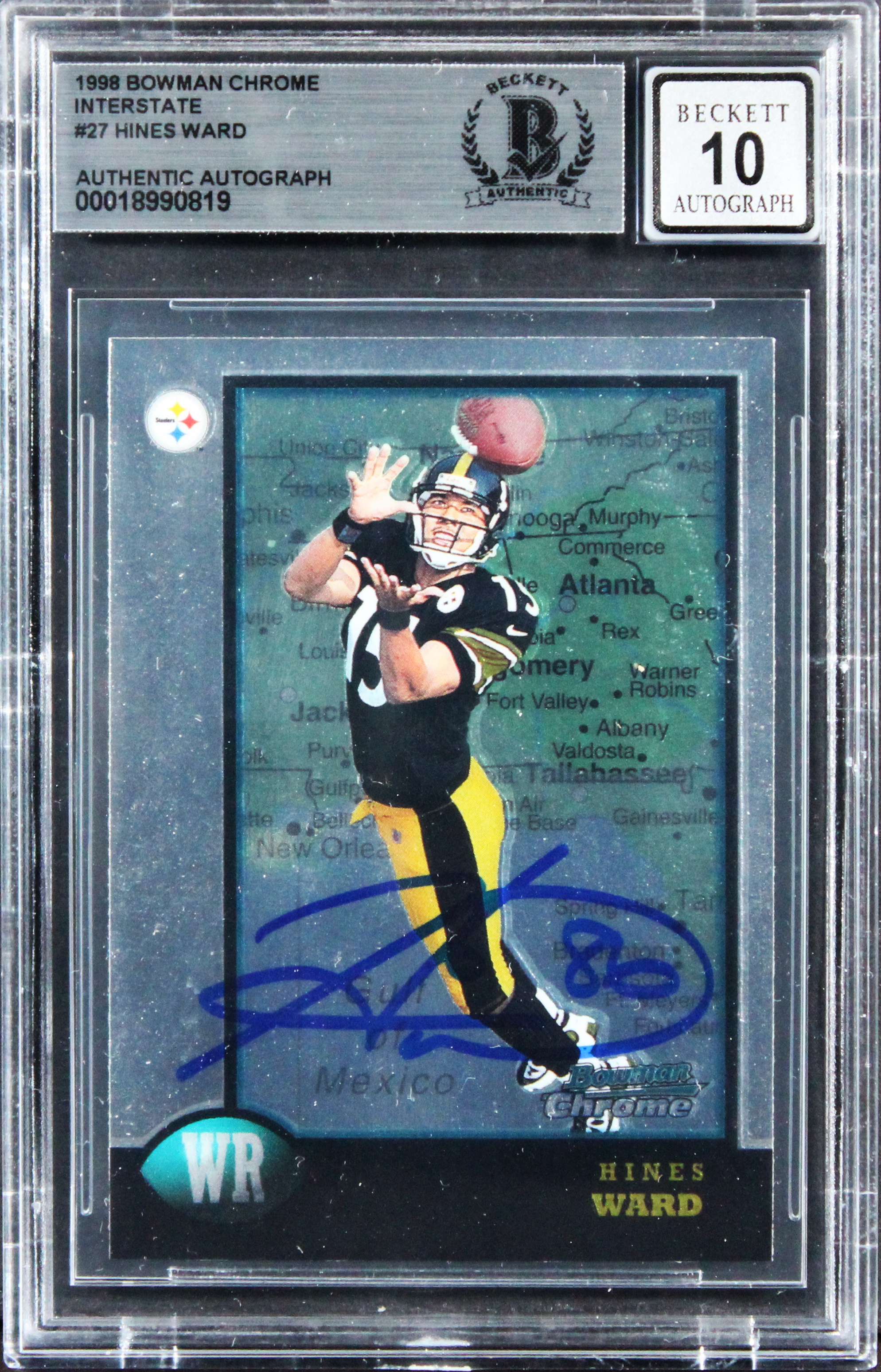 This Autographed Auto Grade Gem Mint 10! 1998 Bowman Chrome Interstate #27 Rookie Card has been Personally Signed by Hines Ward of the Pittsburgh Steelers. This item is 100% Authentic, it comes slabbed and authenticated by Beckett Authentication Services. The authenticity can be verified on Beckett Authentication Services website.