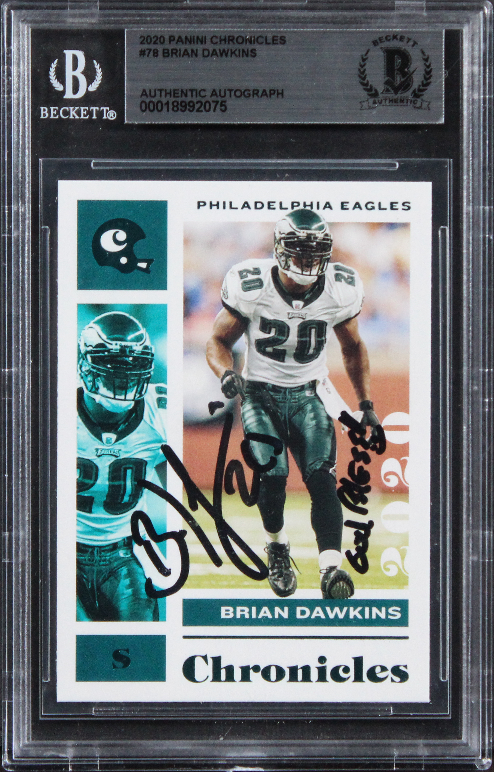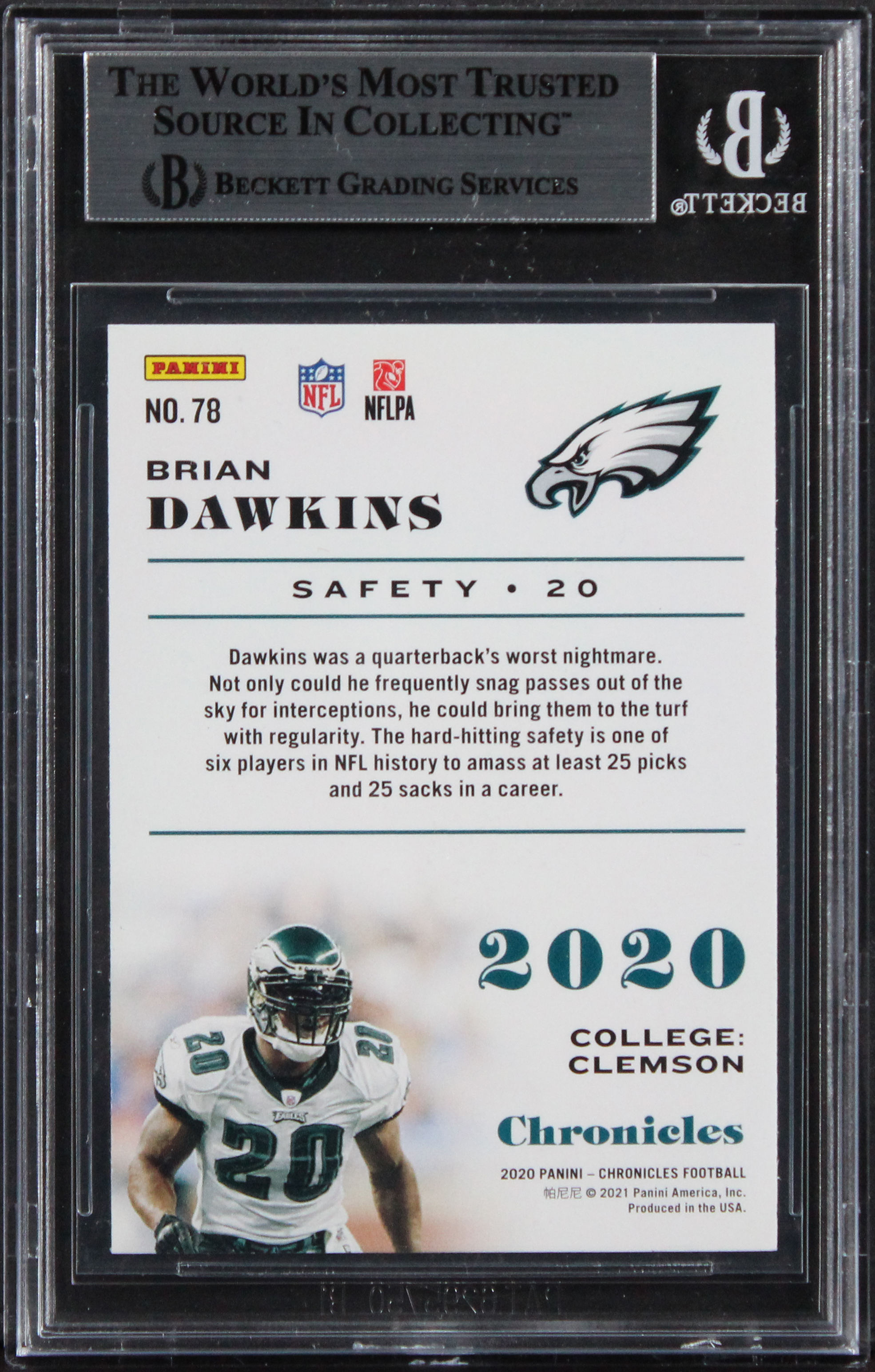 This Autographed 2020 Panini Chronicles #78 Card with the inscription of "God Bless!" has been Personally Signed by Brian Dawkins of the Philadelphia Eagles. This item is 100% Authentic, it comes slabbed and authenticated by Beckett Authentication Services. The authenticity can be verified on Beckett Authentication Services website.