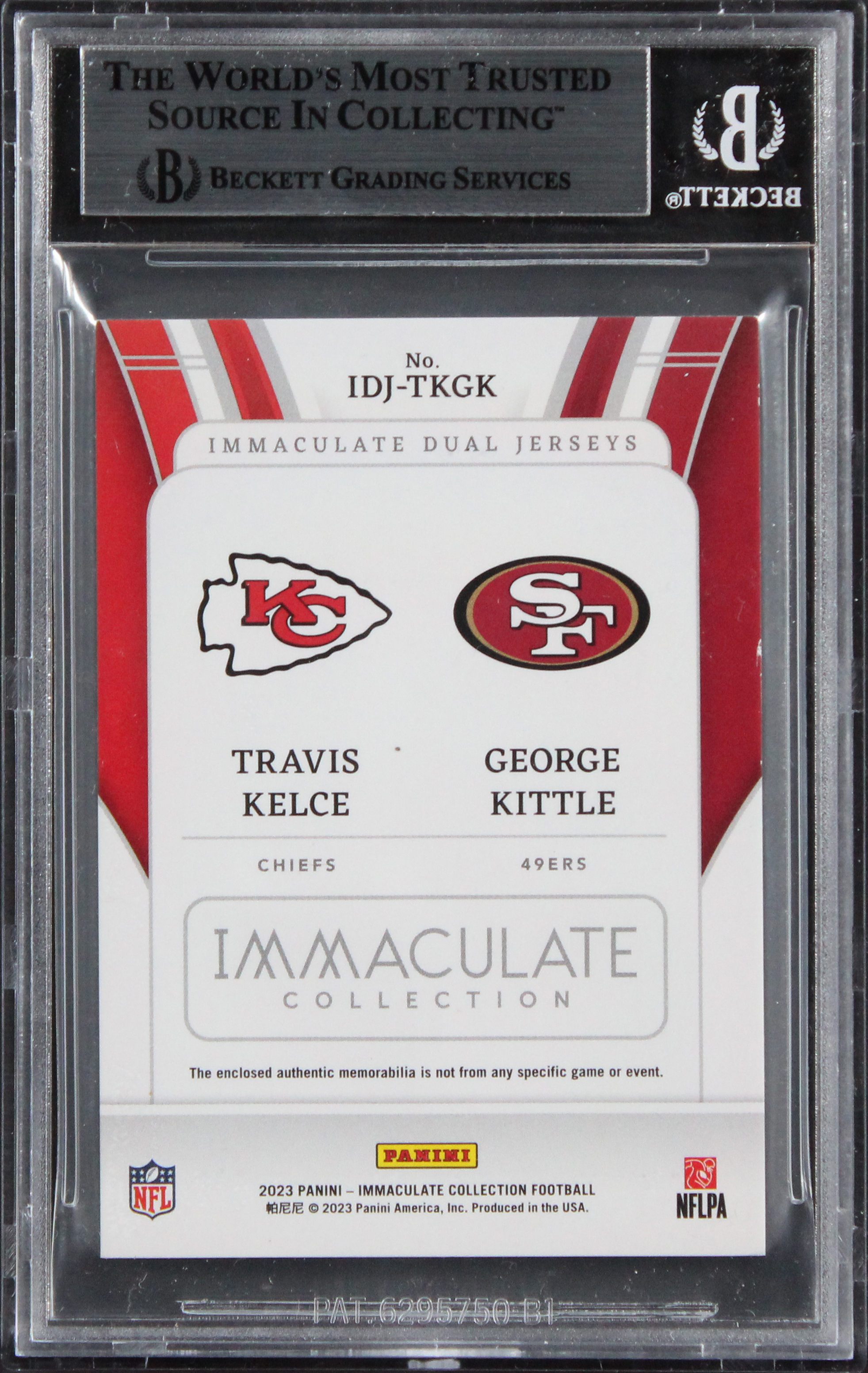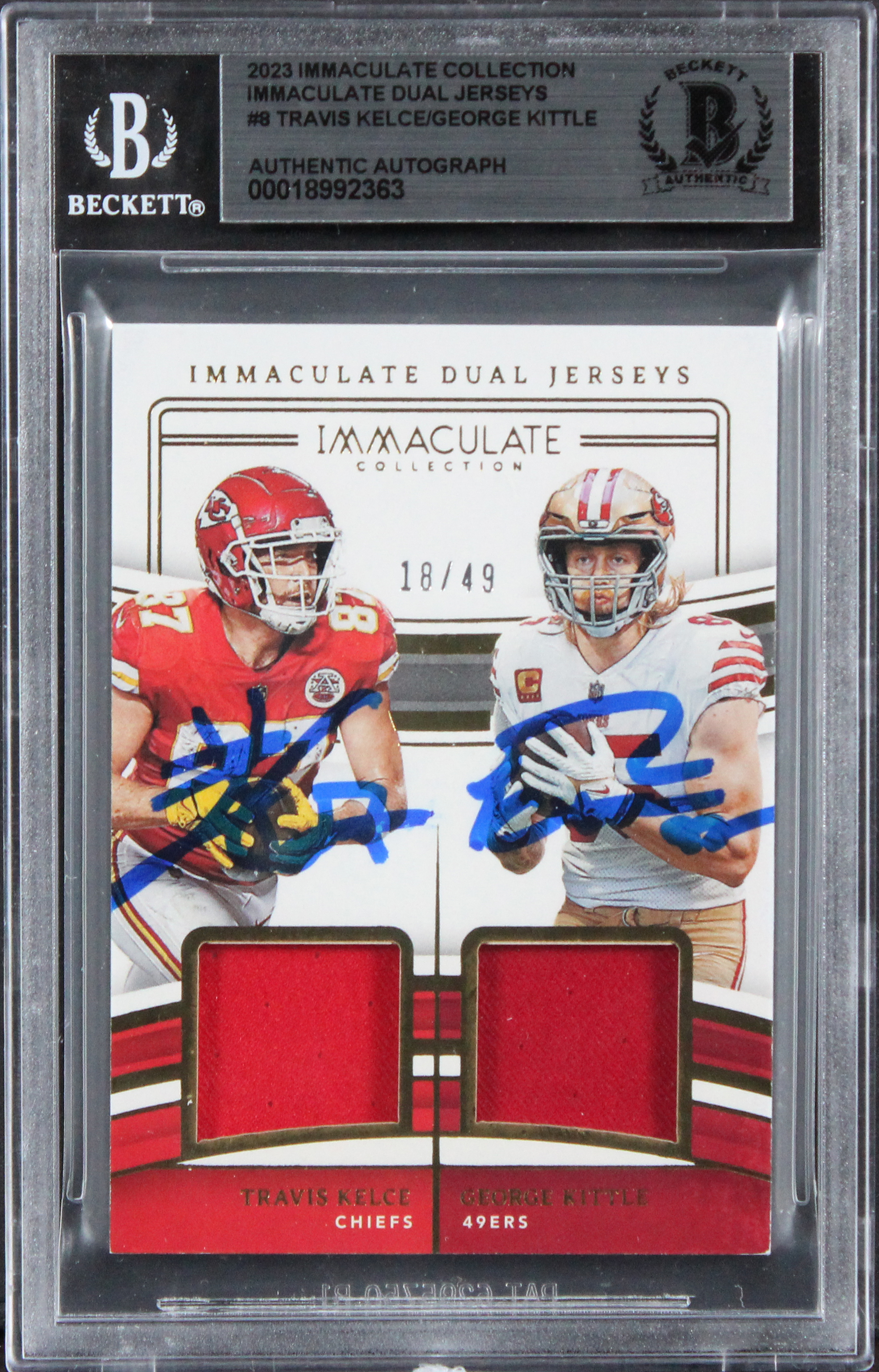 This Autographed 2023 Immaculate Collection Immaculate Dual Jerseys #8 18/49 Card has been Personally Signed by Travis Kelce & George Kittle. This item is 100% Authentic, it comes slabbed and authenticated by Beckett Authentication Services. The authenticity can be verified on Beckett Authentication Services website.