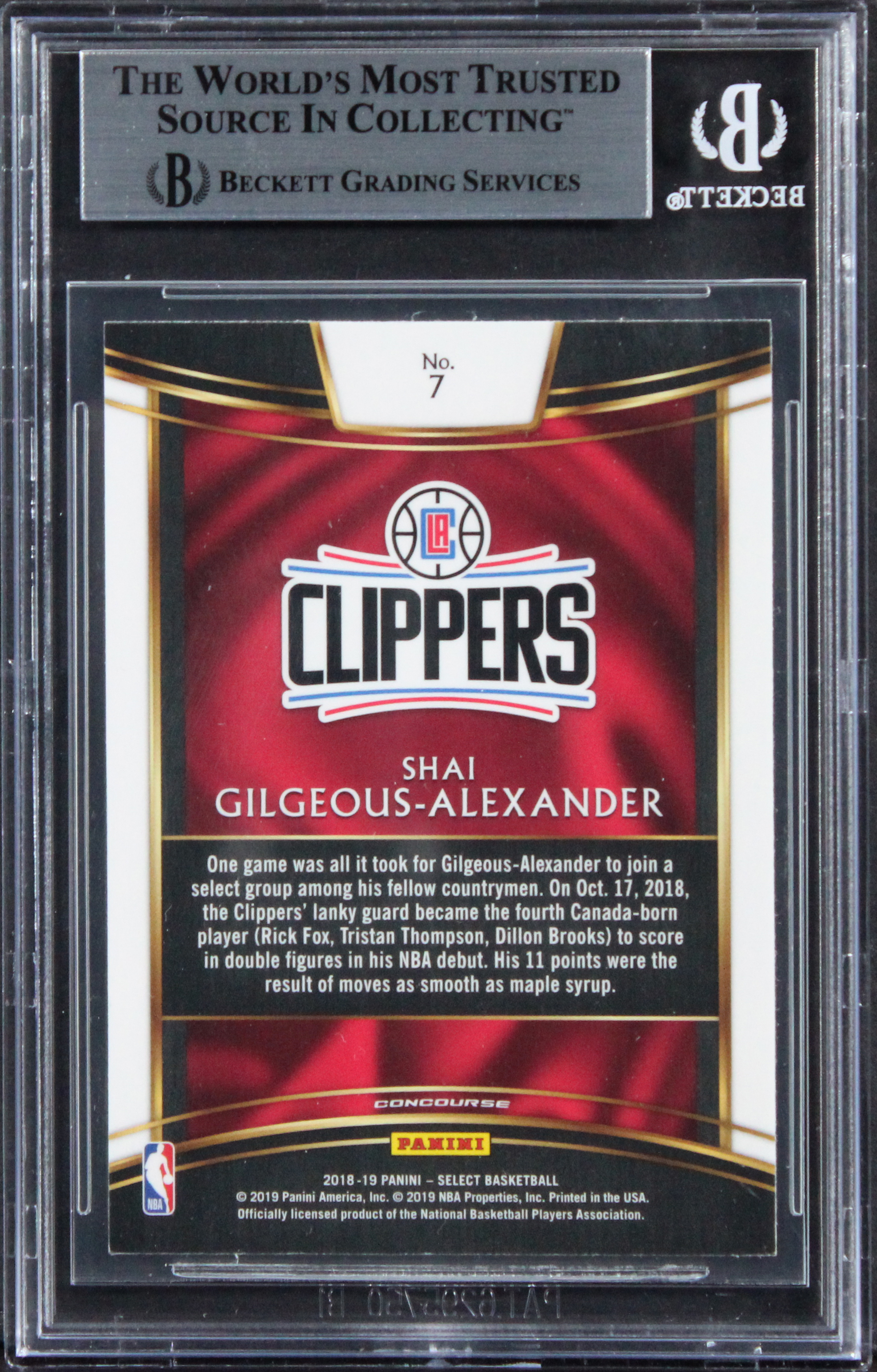 This Autographed 2018 Select #7 Rookie Card has been Personally Signed by Shai Gilgeous-Alexander of the Los Angeles Clippers. This item is 100% Authentic, it comes slabbed and authenticated by Beckett Authentication Services. The authenticity can be verified on Beckett Authentication Services website.