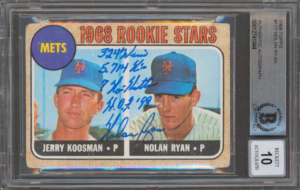 This Autographed Auto Graded Gem Mint 10! 1968 Topps #177 Rookie Card with the inscription of "324 Wins, 5,714 K's, 7 No Hitters, HOF 99" has been Personally Signed by Nolan Ryan of the New York Mets. This item is 100% Authentic, it comes slabbed and authenticated by Beckett Authentication Services. The authenticity can be verified on Beckett Authentication Services website.