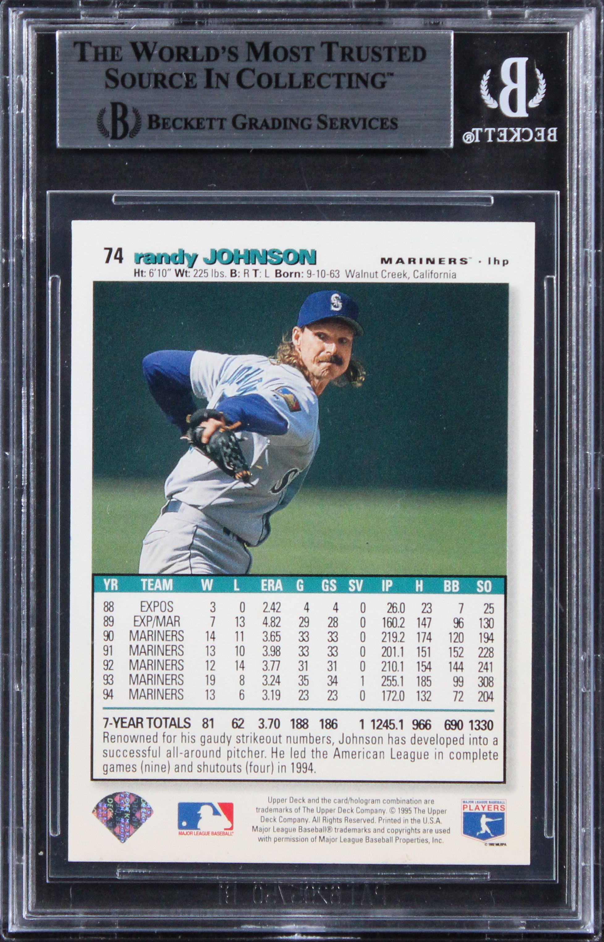 This Autographed 1995 Collector's Choice #74 Card has been Personally Signed by Randy Johnson of the Seattle Mariners. This item is 100% Authentic, it comes slabbed and authenticated by Beckett Authentication Services. The authenticity can be verified on Beckett Authentication Services website.