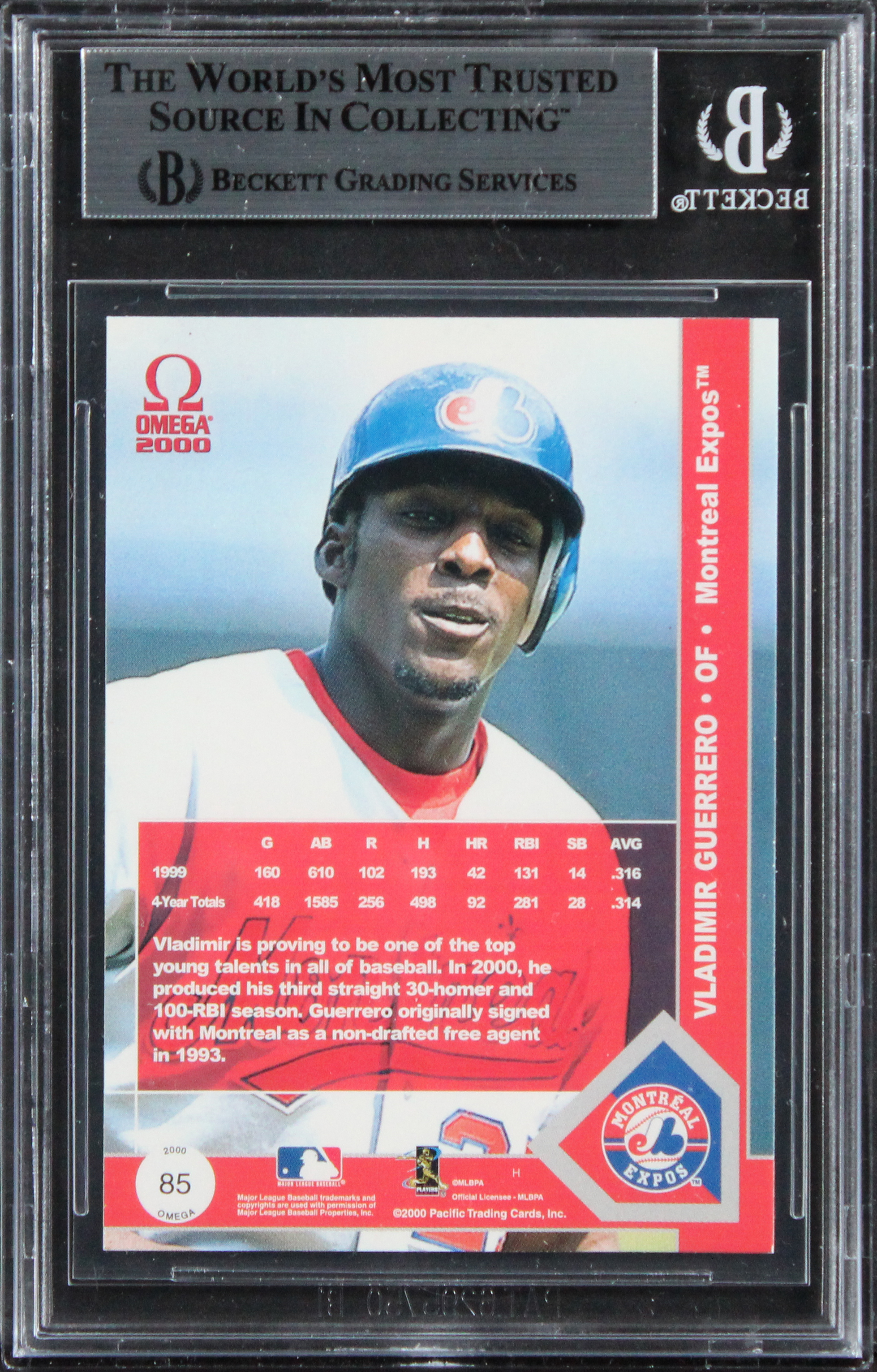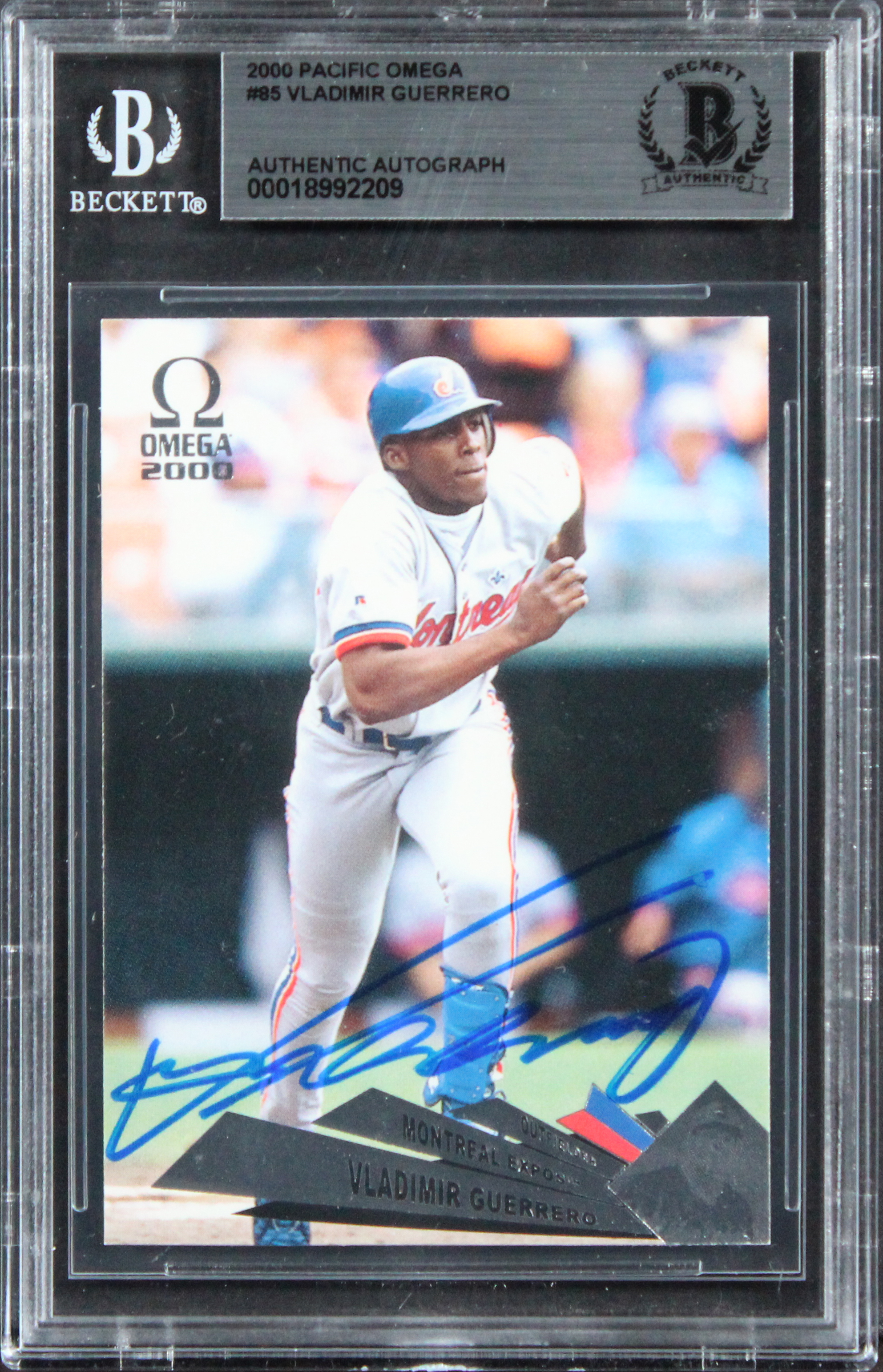 This Autographed 2000 Pacific Omega #85 Card has been Personally Signed by Vladimir Guerrero of the Montreal Expos. This item is 100% Authentic, it comes slabbed and authenticated by Beckett Authentication Services. The authenticity can be verified on Beckett Authentication Services website.