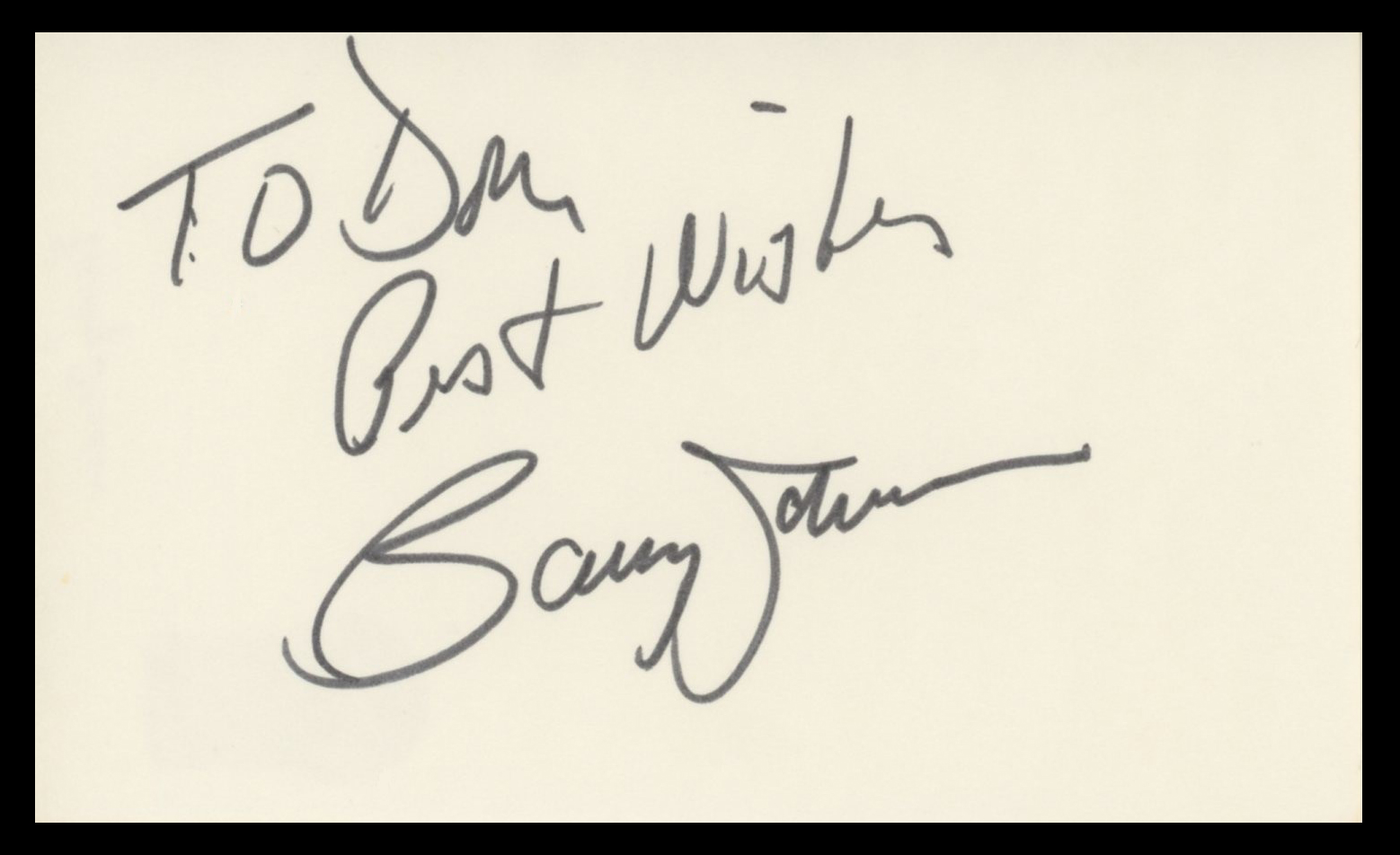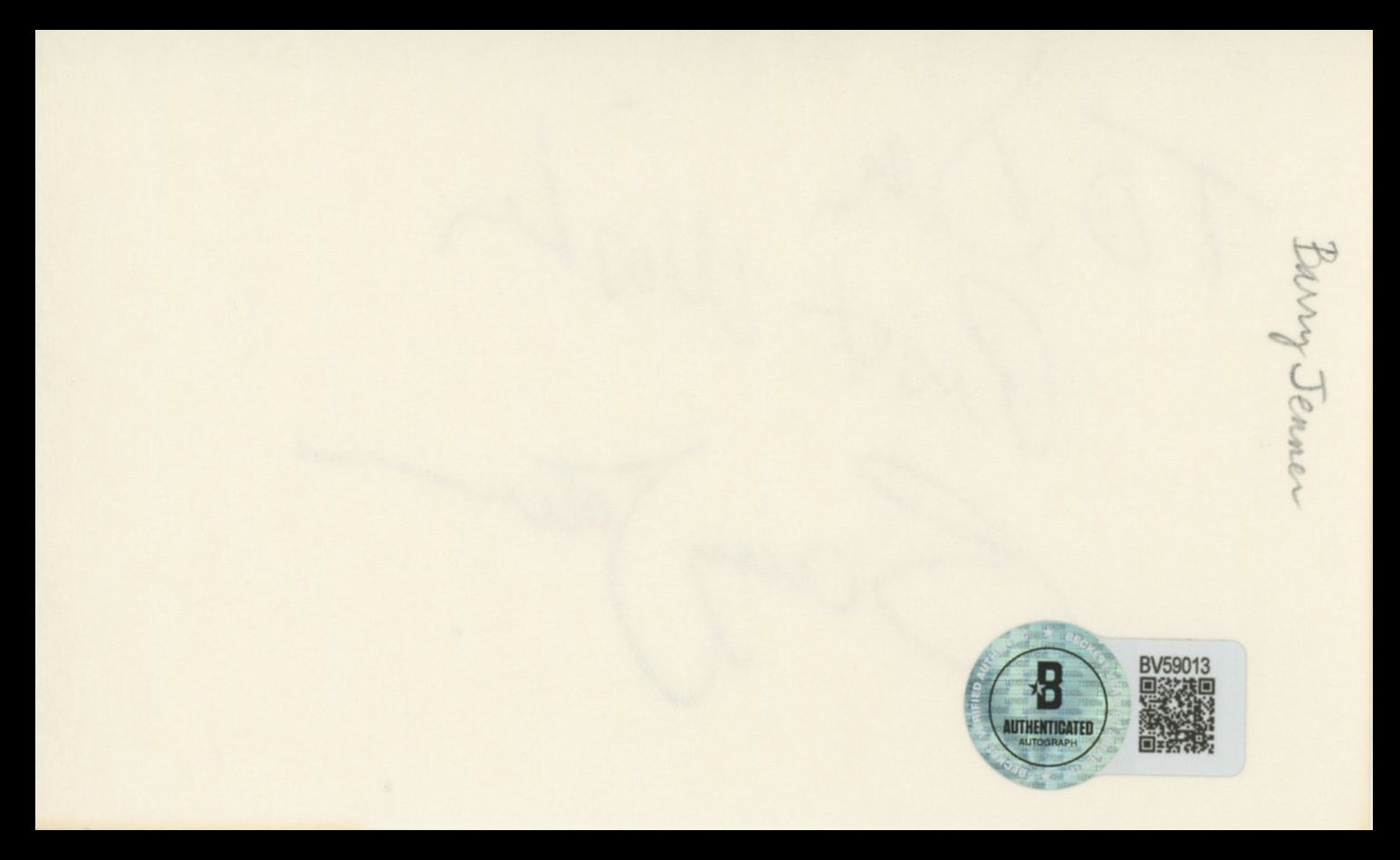 This Autographed 3x5 Index Card with the inscription of "Don, Best Wishes" has been Personally Signed by Barry Jenner of Star Trek: Deep Space Nine. This item is 100% Authentic to include a hologram by Beckett Authentication Services. This item will come with an affixed Beckett Authentication Services (BAS) authentication sticker, which includes a scannable QR code to verify authenticity. Please note that Beckett no longer provides serial-numbered COA cards, and the attached BAS sticker will serve as the complete authentication for this item. The authenticity can be verified on Beckett Authentication Services website.