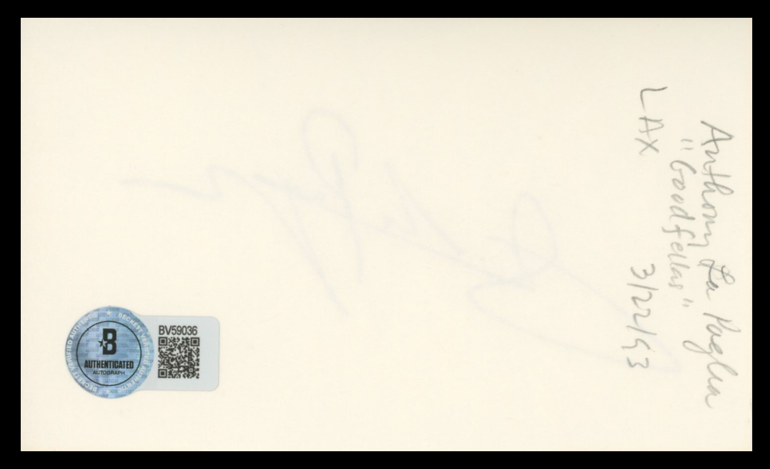 This Autographed 3x5 Index Card has been Personally Signed by Anthony LaPaglia of Without a Trace. This item is 100% Authentic to include a hologram by Beckett Authentication Services. This item will come with an affixed Beckett Authentication Services (BAS) authentication sticker, which includes a scannable QR code to verify authenticity. Please note that Beckett no longer provides serial-numbered COA cards, and the attached BAS sticker will serve as the complete authentication for this item. The authenticity can be verified on Beckett Authentication Services website.