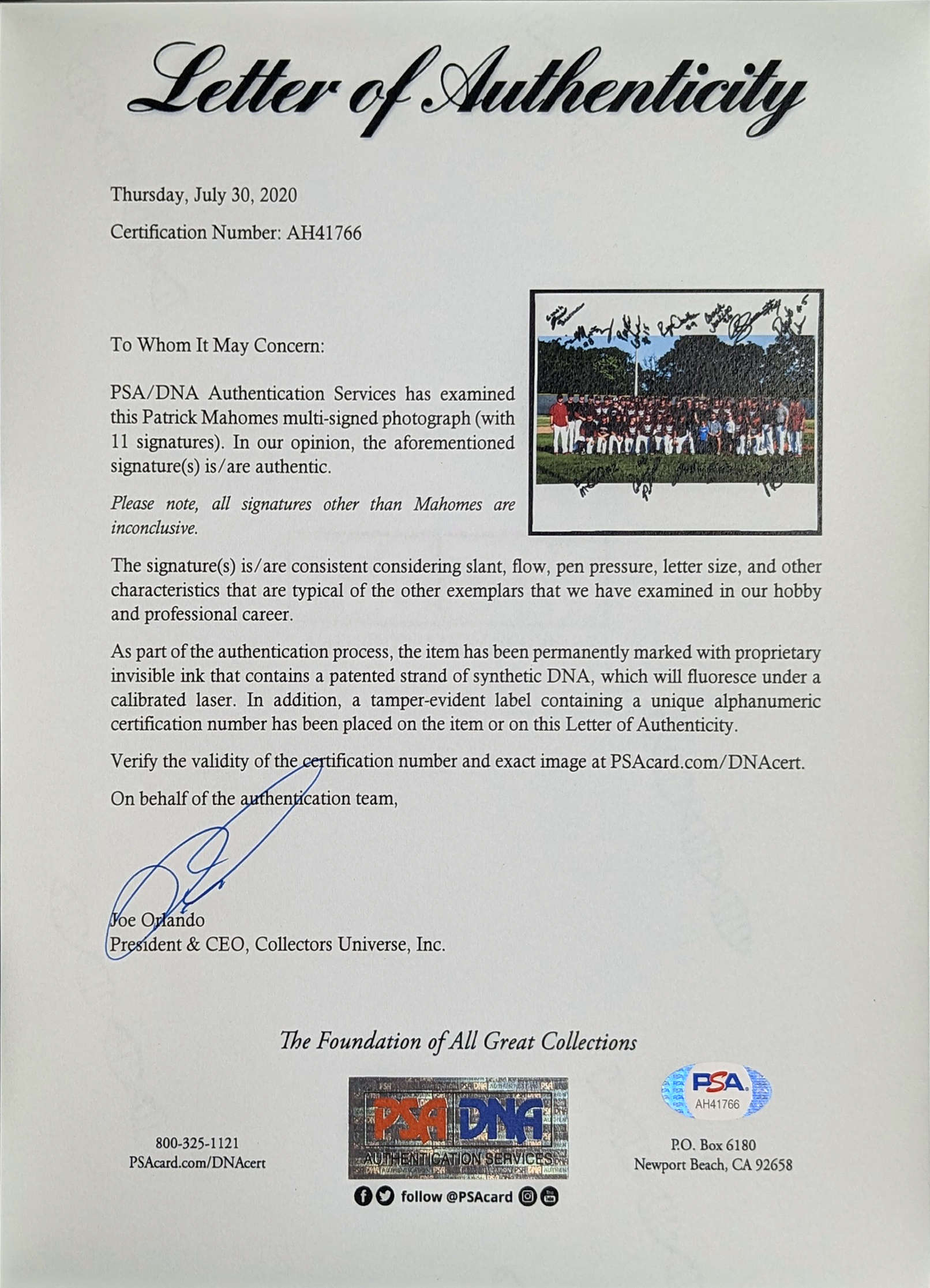 This Autographed 2013 High School Baseball Team 11x14 Photo has been Personally Signed by Patrick Mahomes of the Kansas City Chiefs. This item is 100% Authentic and comes with a PSA/DNA Certification Card and a matching numbered Hologram. The authenticity can be verified on Professional Sports Authenticator website.