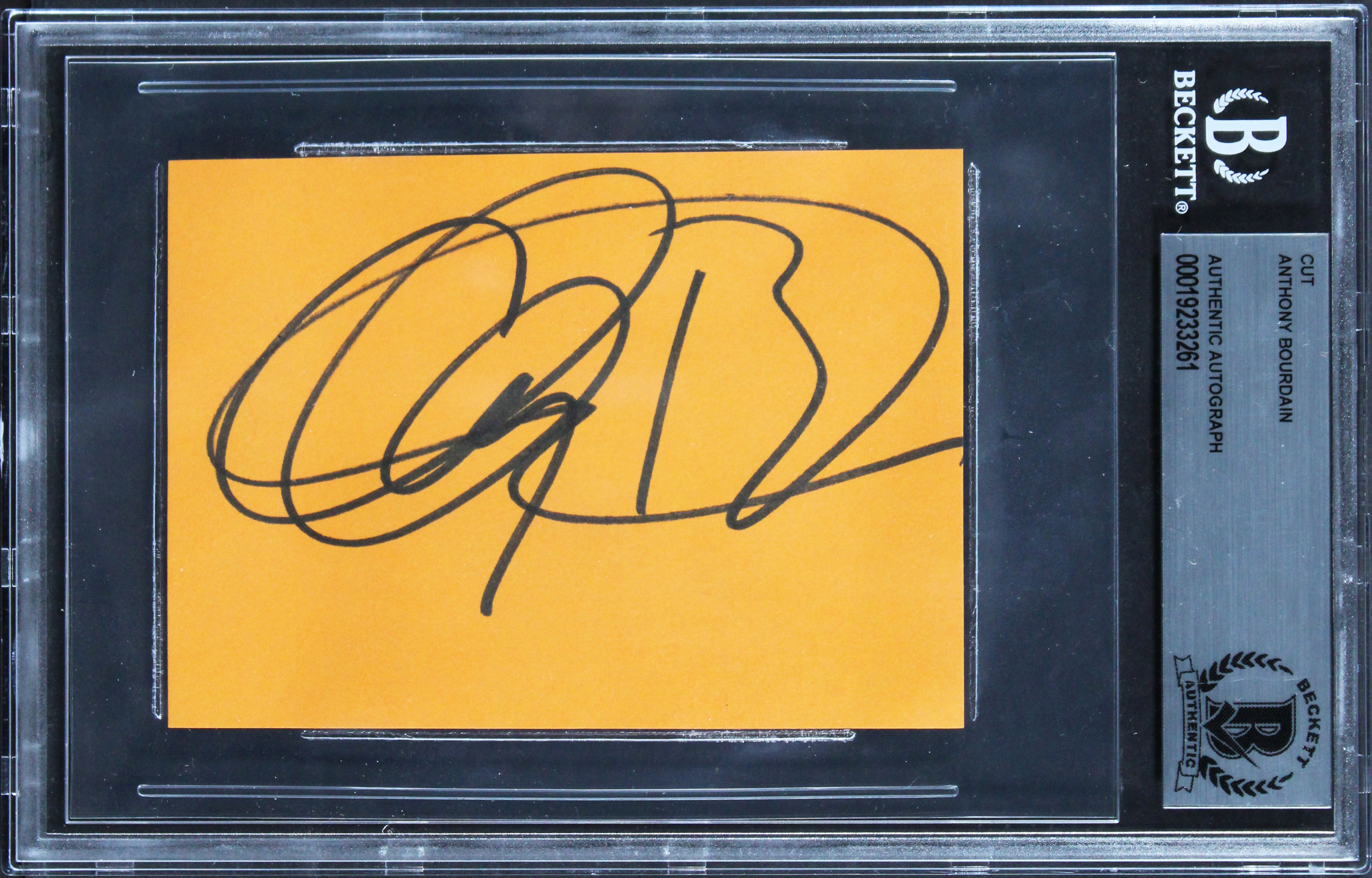 This Autographed 3x4.25 Cut Signature has been Personally Signed by Anthony Bourdain of No Reservations. This item is 100% Authentic, it comes slabbed and authenticated by Beckett Authentication Services. The authenticity can be verified on Beckett Authentication Services website.