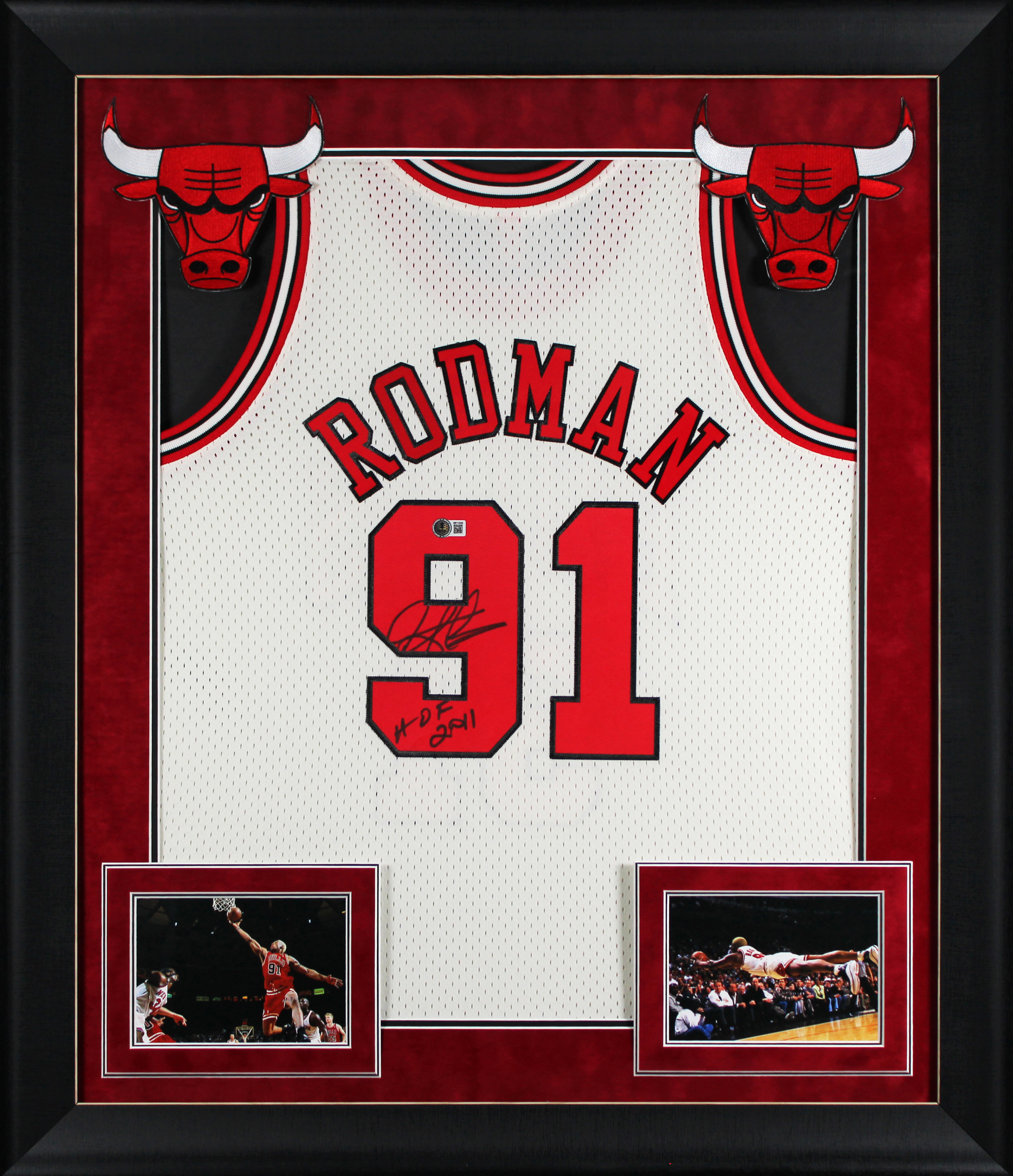 This Autographed Cream Mitchell & Ness Hardwood Classics Swingman Framed Jersey with the inscription of "HOF 2011" has been Personally Signed by Dennis Rodman of the Chicago Bulls. This item is 100% Authentic to include a hologram by Beckett Authentication Services. This item will come with an affixed Beckett Authentication Services (BAS) authentication sticker, which includes a scannable QR code to verify authenticity. Please note that Beckett no longer provides serial-numbered COA cards, and the attached BAS sticker will serve as the complete authentication for this item. This is a BAS Witnessed Protection Program item which means a Beckett Authentication Service representative was present when this item was being signed. We conducted an autograph signing with Dennis Rodman where multiples of the same item were signed. While the photographs are representative of this item, the size, placement and strength of the signature may vary. Each item is hand signed, therefore, each autograph is unique. This item can be verified through BAS Witnessed. This item has been professionally framed to overall dimensions of approximately 32 x 37 inches. This jersey will be framed to order, it will take approximately 4-5 business days from purchase date for it to ship.