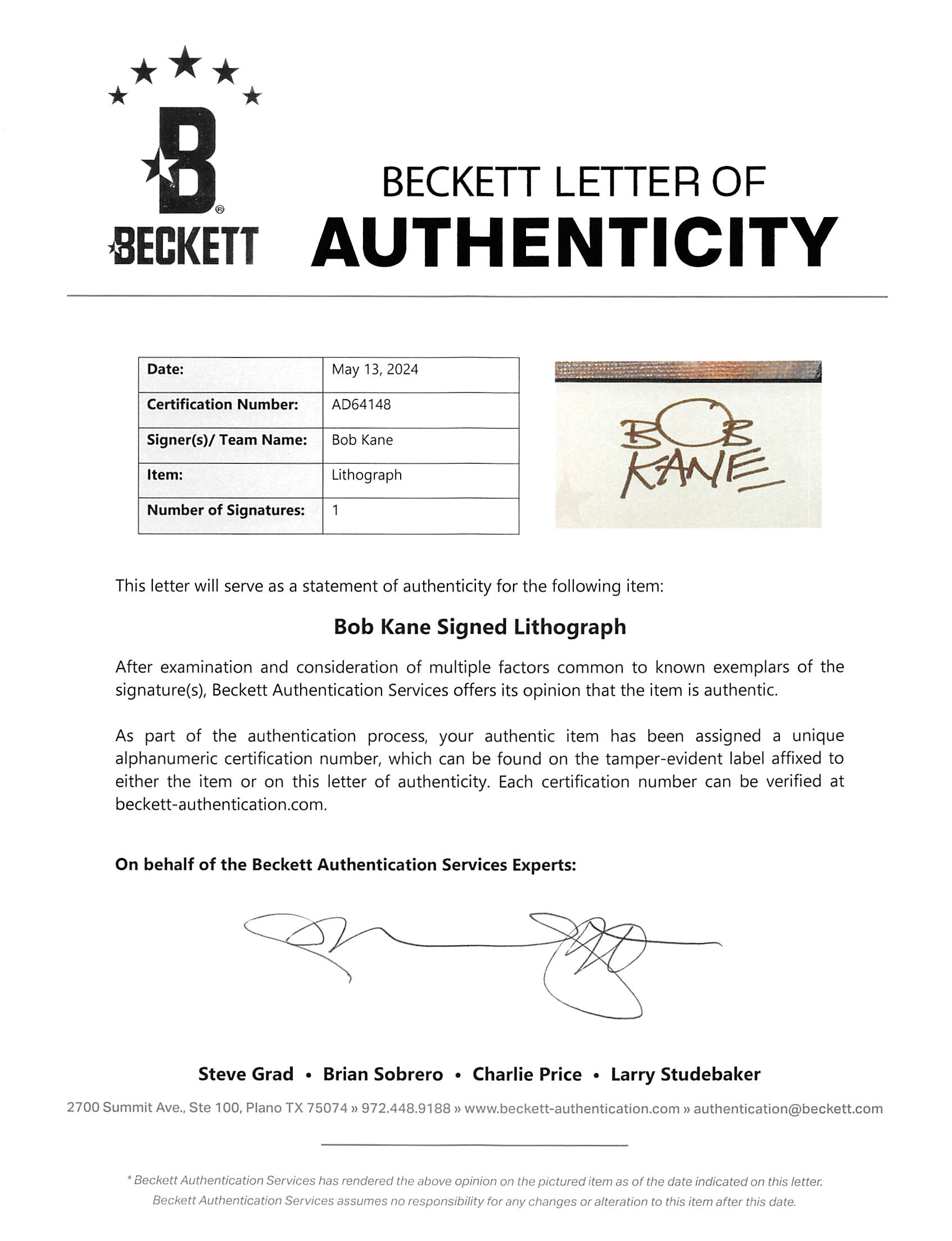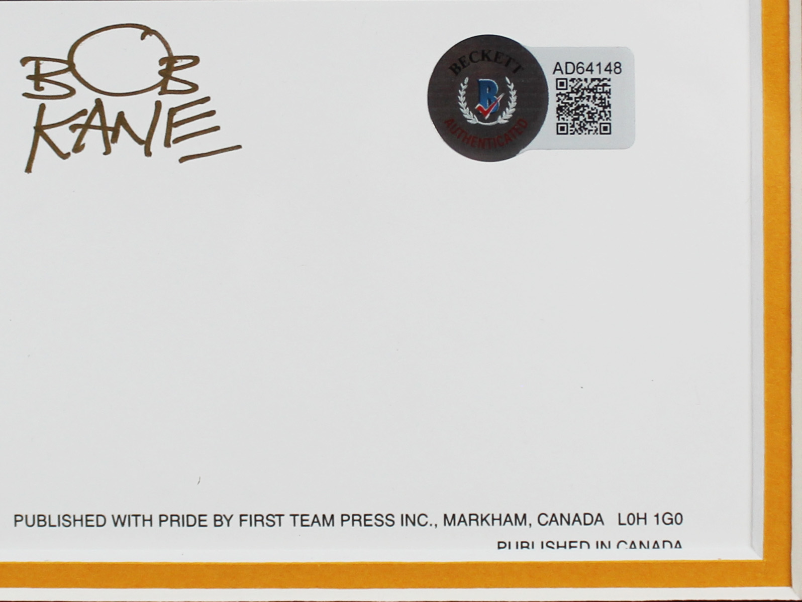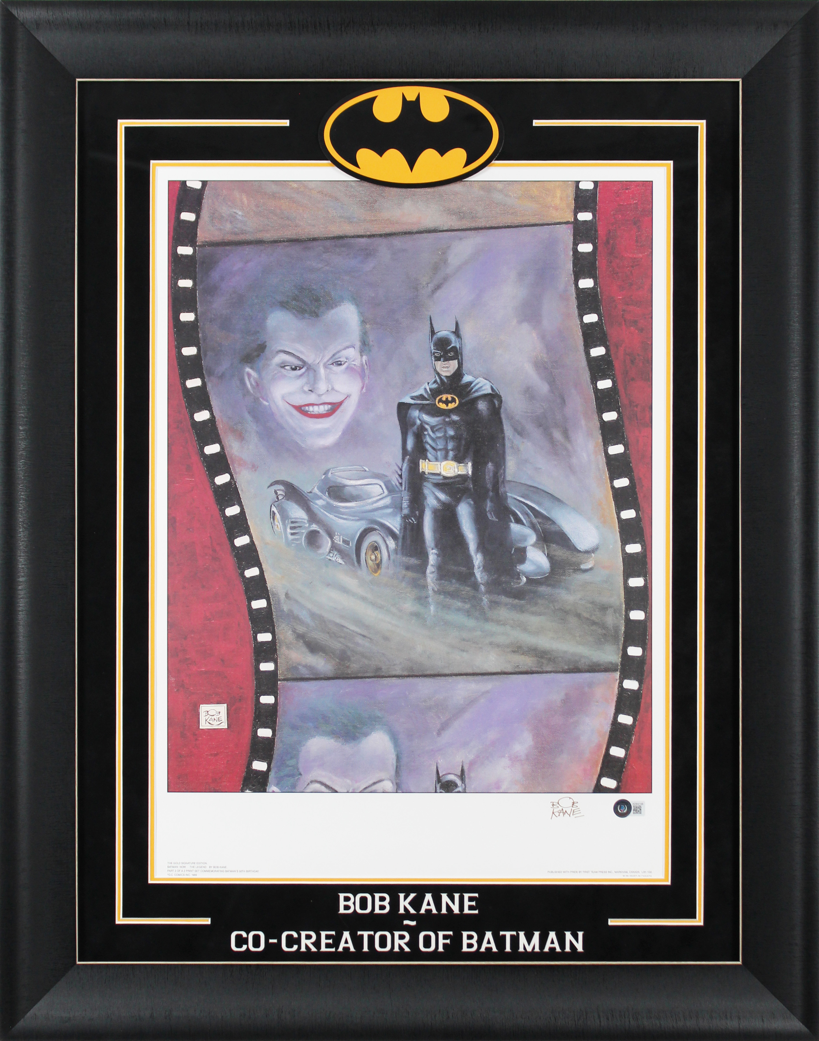 This Autographed & Framed 20.5x24.5 Lithograph has been Personally Signed by Bob Kane of Batman. This item is 100% Authentic to include a Certificate of Authenticity (COA) / hologram by Beckett Authentication Services. The authenticity can be verified on Beckett Authentication Services website. This item has been professionally framed to overall dimensions of approximately 26.5 x 33.5 inches.