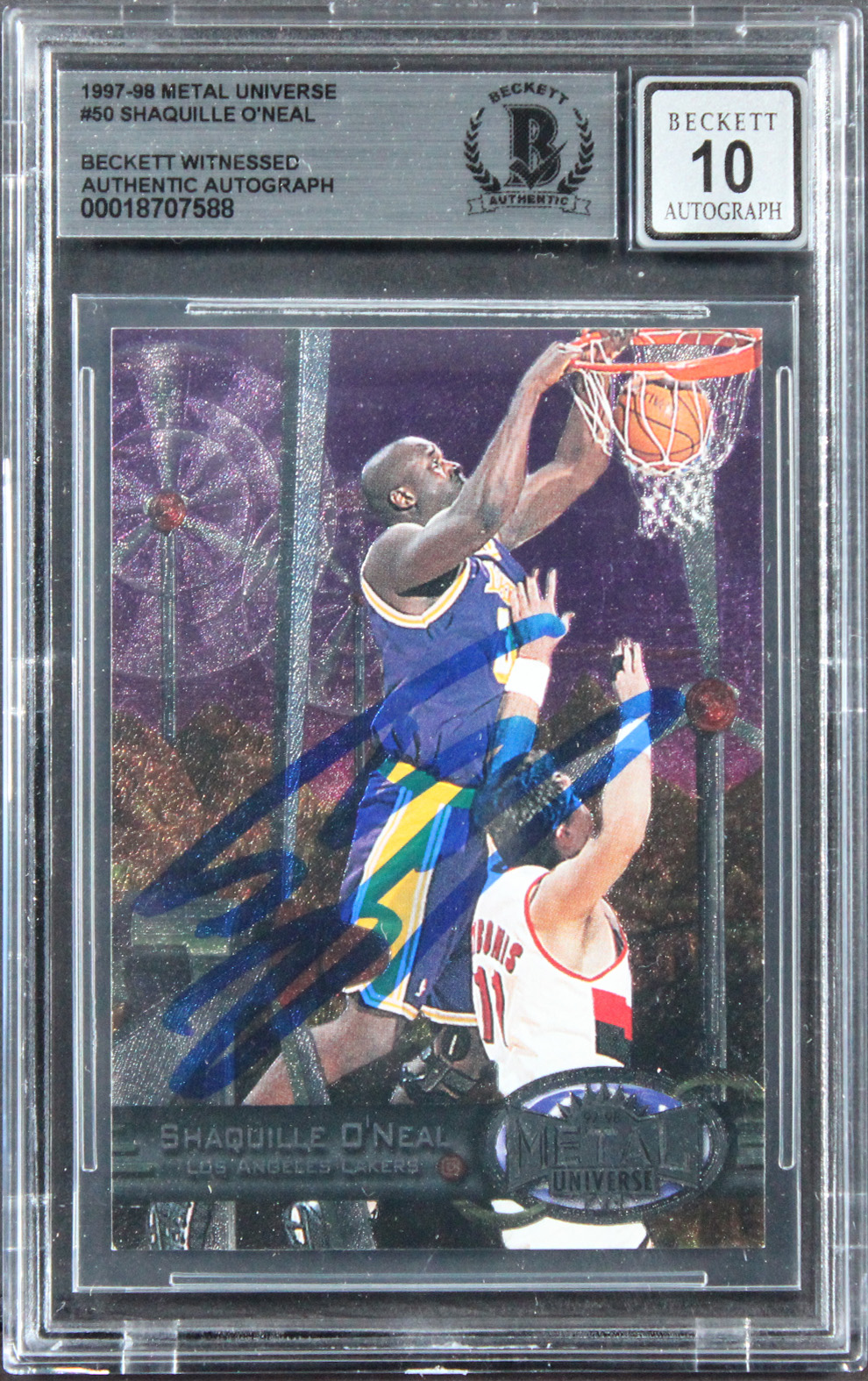 This Autographed Auto Grade Gem Mint 10! 1997 Metal Universe #50 Card has been Personally Signed by Shaquille O'Neal of the Los Angeles Lakers. This item is 100% Authentic, it comes slabbed and authenticated by Beckett Authentication Services. We conducted an autograph signing with Shaquille O'Neal where multiples of the same item were signed. While the photographs are representative of this item, the size, placement and strength of the signature may vary. Each item is hand signed, therefore, each autograph is unique. This item can be verified through BAS Slabbed.
