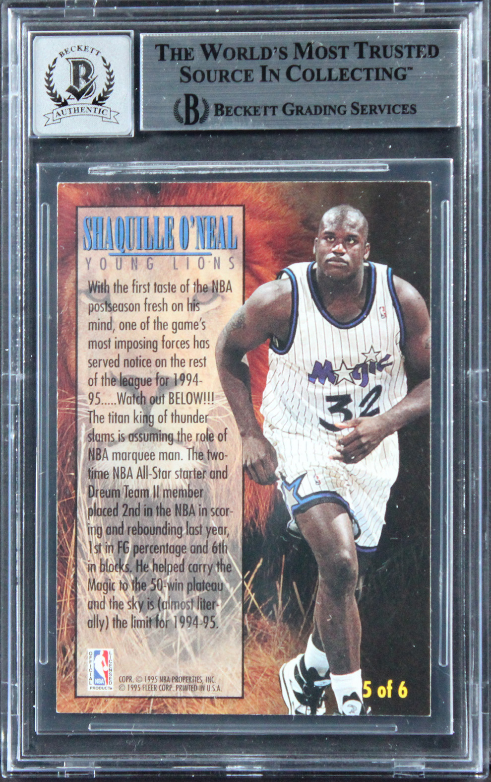 This Autographed Auto Grade Gem Mint 10! 1994 Fleer Young Guns #5 Card has been Personally Signed by Shaquille O'Neal of the Orlando Magic. This item is 100% Authentic, it comes slabbed and authenticated by Beckett Authentication Services. We conducted an autograph signing with Shaquille O'Neal where multiples of the same item were signed. While the photographs are representative of this item, the size, placement and strength of the signature may vary. Each item is hand signed, therefore, each autograph is unique. This item can be verified through BAS Slabbed.