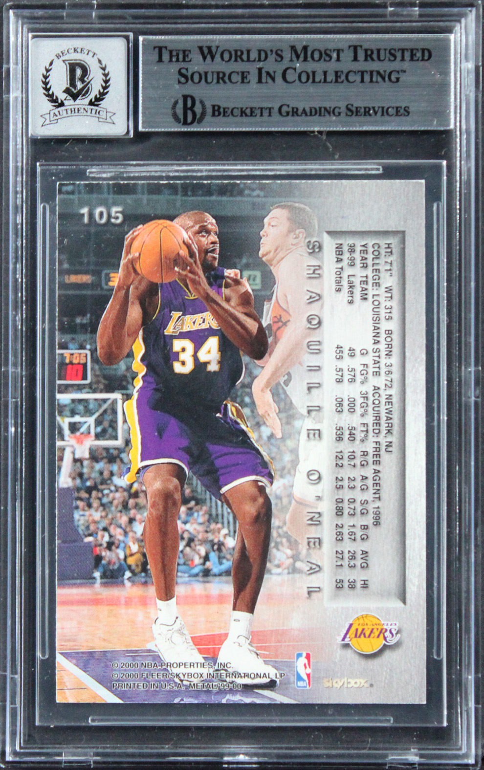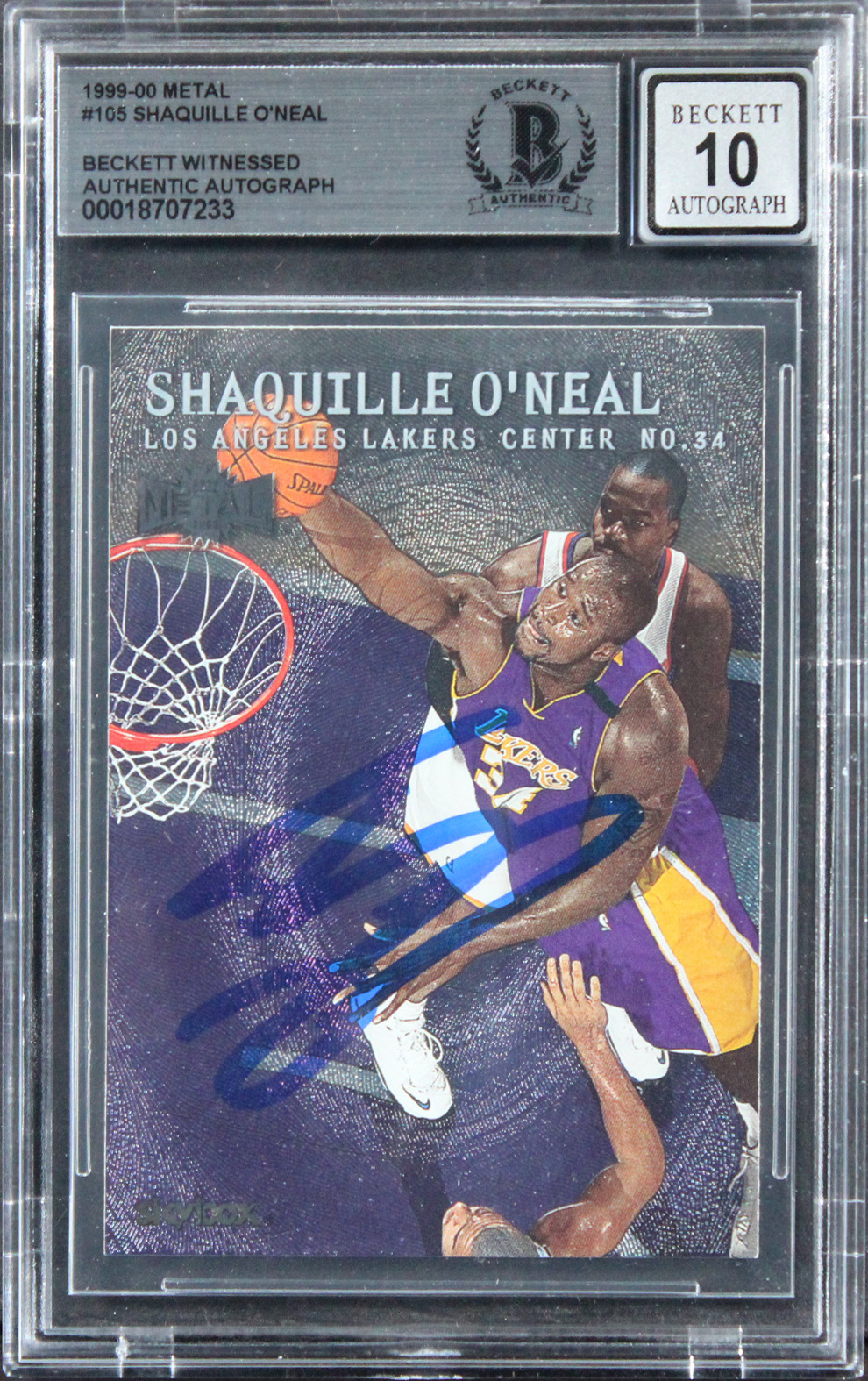 This Autographed Auto Grade Gem Mint 10! 1999 Metal #105 Card has been Personally Signed by Shaquille O'Neal of the Los Angeles Lakers. This item is 100% Authentic, it comes slabbed and authenticated by Beckett Authentication Services. We conducted an autograph signing with Shaquille O'Neal where multiples of the same item were signed. While the photographs are representative of this item, the size, placement and strength of the signature may vary. Each item is hand signed, therefore, each autograph is unique. This item can be verified through BAS Slabbed.