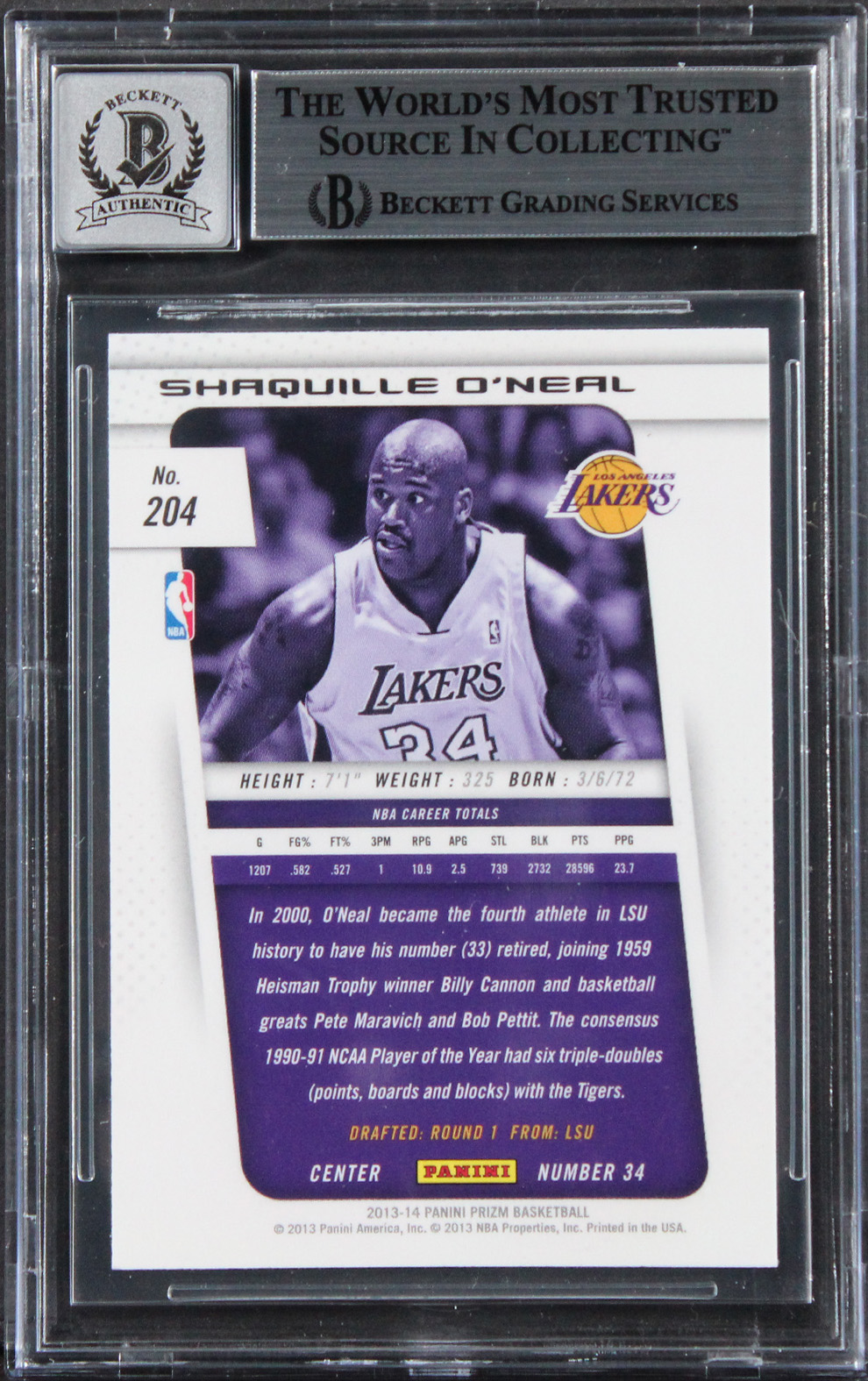 This Autographed Auto Grade Gem Mint 10! 2013 Panini Prizm #204 Card has been Personally Signed by Shaquille O'Neal of the Los Angeles Lakers. This item is 100% Authentic, it comes slabbed and authenticated by Beckett Authentication Services. We conducted an autograph signing with Shaquille O'Neal where multiples of the same item were signed. While the photographs are representative of this item, the size, placement and strength of the signature may vary. Each item is hand signed, therefore, each autograph is unique. This item can be verified through BAS Slabbed.
