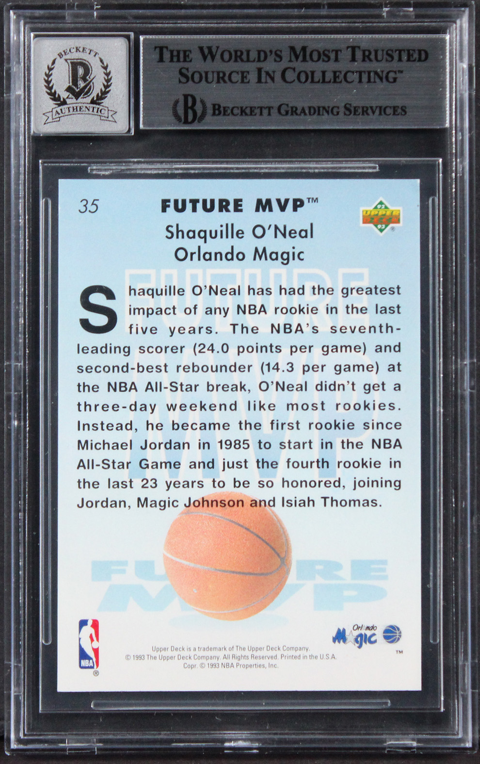 This Autographed Auto Grade Gem Mint 10! 1992 Upper Deck MVP Holograms #35 Rookie Card has been Personally Signed by Shaquille O'Neal of the Orlando Magic. This item is 100% Authentic, it comes slabbed and authenticated by Beckett Authentication Services. We conducted an autograph signing with Shaquille O'Neal where multiples of the same item were signed. While the photographs are representative of this item, the size, placement and strength of the signature may vary. Each item is hand signed, therefore, each autograph is unique. This item can be verified through BAS Slabbed.