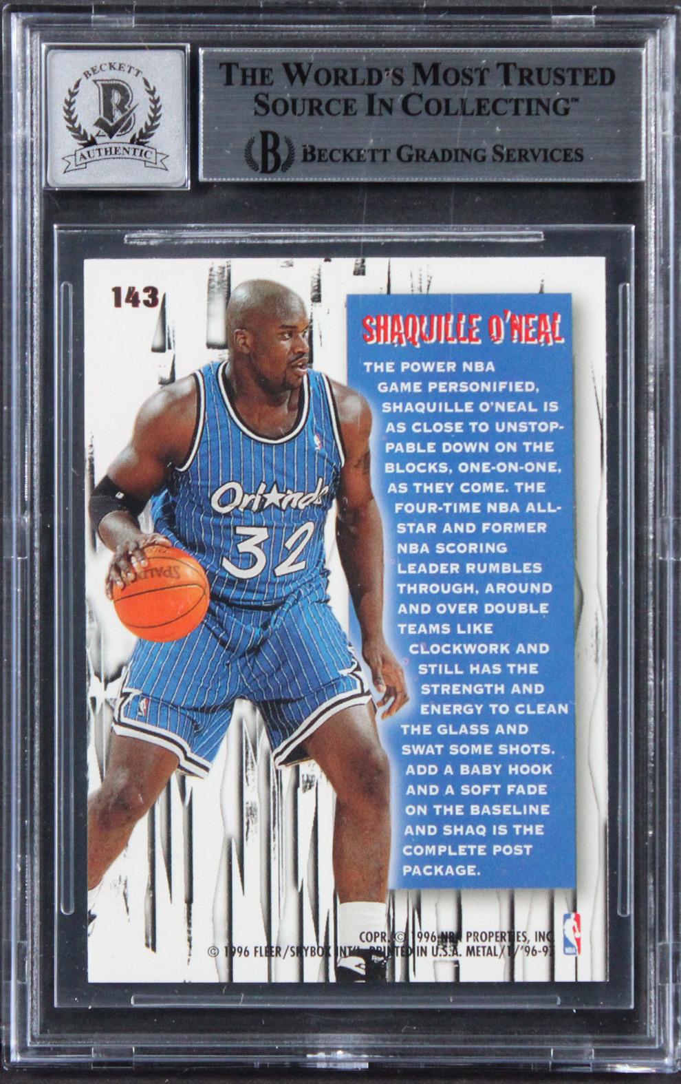 This Autographed Auto Grade Gem Mint 10! 1996 Metal #143 Card has been Personally Signed by Shaquille O'Neal of the Orlando Magic. This item is 100% Authentic, it comes slabbed and authenticated by Beckett Authentication Services. We conducted an autograph signing with Shaquille O'Neal where multiples of the same item were signed. While the photographs are representative of this item, the size, placement and strength of the signature may vary. Each item is hand signed, therefore, each autograph is unique. This item can be verified through BAS Slabbed.