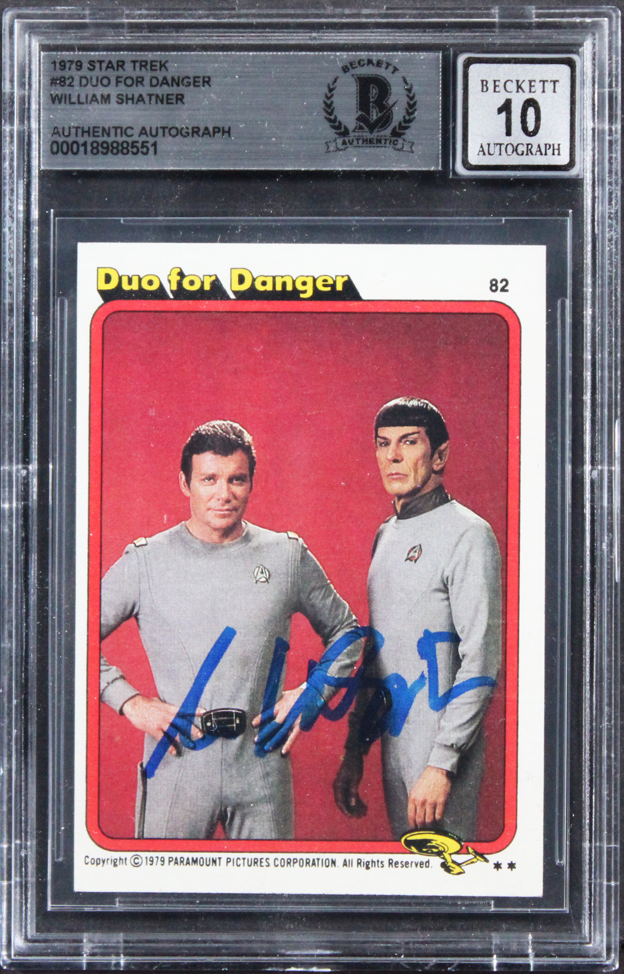 This Autographed 1979 Star Trek #82 Duo For Danger Auto Grade Gem Mint 10! Card has been Personally Signed by William Shatner of Star Trek. This item is 100% Authentic, it comes slabbed and authenticated by Beckett Authentication Services. We have multiples of this same item. While the photographs are representative of this item, the size, placement and strength of the signature may vary. Each item is hand signed, therefore, each autograph is unique.