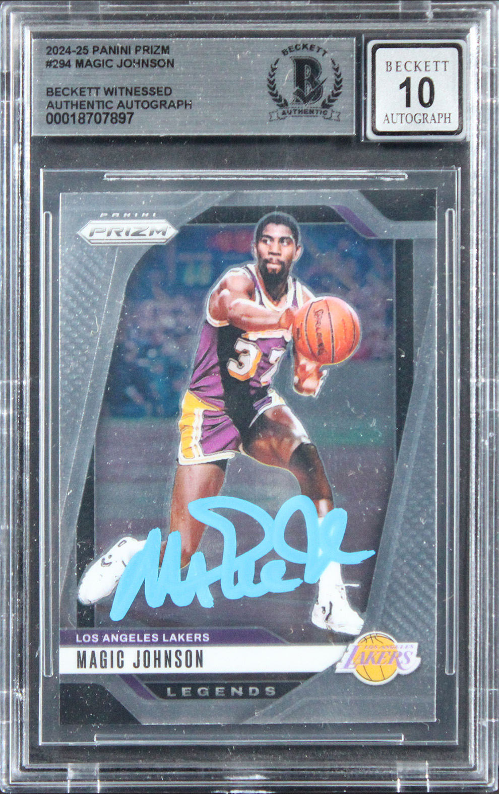 This Autographed Auto Grade Gem Mint 10! 2024 Panini Prizm #294 Card has been Personally Signed by Magic Johnson of the Los Angeles Lakers. This item is 100% Authentic, it comes slabbed and authenticated by Beckett Authentication Services. We conducted an autograph signing with Magic Johnson where multiples of the same item were signed. While the photographs are representative of this item, the size, placement and strength of the signature may vary. Each item is hand signed, therefore, each autograph is unique. This item can be verified through BAS Slabbed.