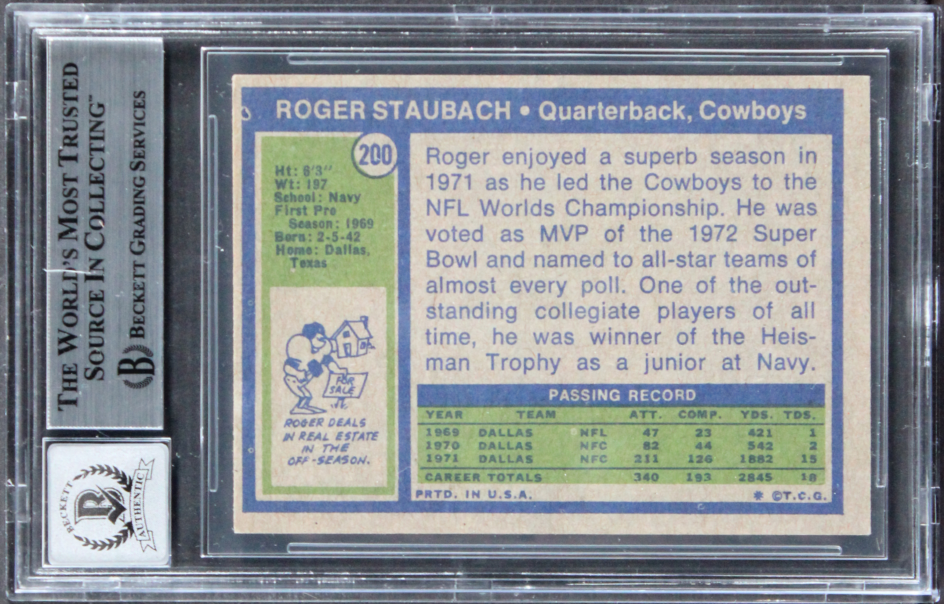 This Autographed Auto Grade Gem Mint 10! 1972 Topps #200 Card with the inscription of "HOF 85" has been Personally Signed by Roger Staubach of the Dallas Cowboys. This item is 100% Authentic, it comes slabbed and authenticated by Beckett Authentication Services. We have multiples of this same item. While the photographs are representative of this item, the size, placement and strength of the signature may vary. Each item is hand signed, therefore, each autograph is unique. The card is not graded and the centering and corners will vary. Please reach out prior to purchase about card condition.