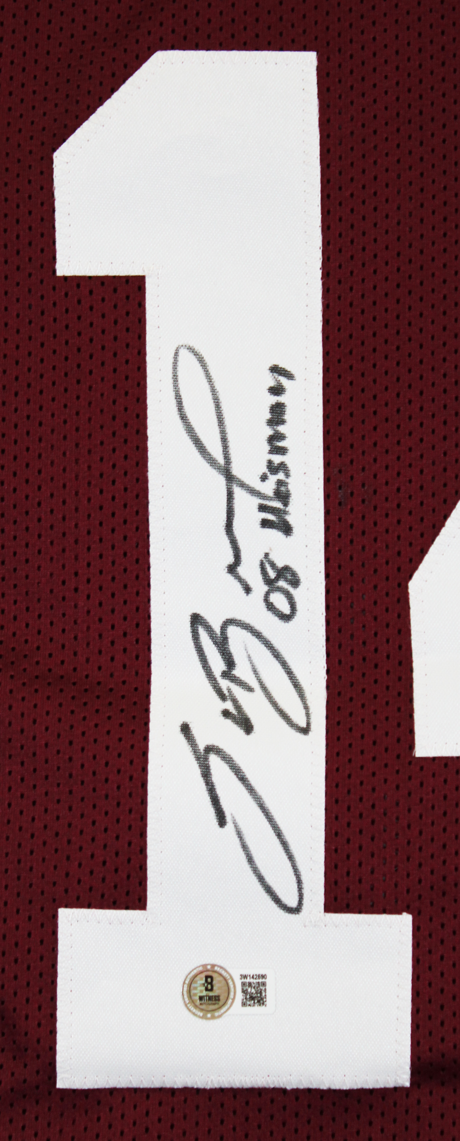 This Autographed Maroon Pro Style Framed Jersey with the inscription of "2008 Heisman" has been Personally Signed by Sam Bradford of the Oklahoma Sooners. This item is 100% Authentic to include a hologram by Beckett Authentication Services. This item will come with an affixed Beckett Authentication Services (BAS) authentication sticker, which includes a scannable QR code to verify authenticity. Please note that Beckett no longer provides serial-numbered COA cards, and the attached BAS sticker will serve as the complete authentication for this item. This is a BAS Witnessed Protection Program item which means a Beckett Authentication Service representative was present when this item was being signed. We conducted an autograph signing with Sam Bradford where multiples of the same item were signed. While the photographs are representative of this item, the size, placement and strength of the signature may vary. Each item is hand signed, therefore, each autograph is unique. This item can be verified through BAS Witnessed. This item has been professionally framed to overall dimensions of approximately 32 x 37 inches. This is a X-Large sized, non-branded, custom-stitched Framed Jersey. This jersey will be framed to order, it will take approximately 4-5 business days from purchase date for it to ship.