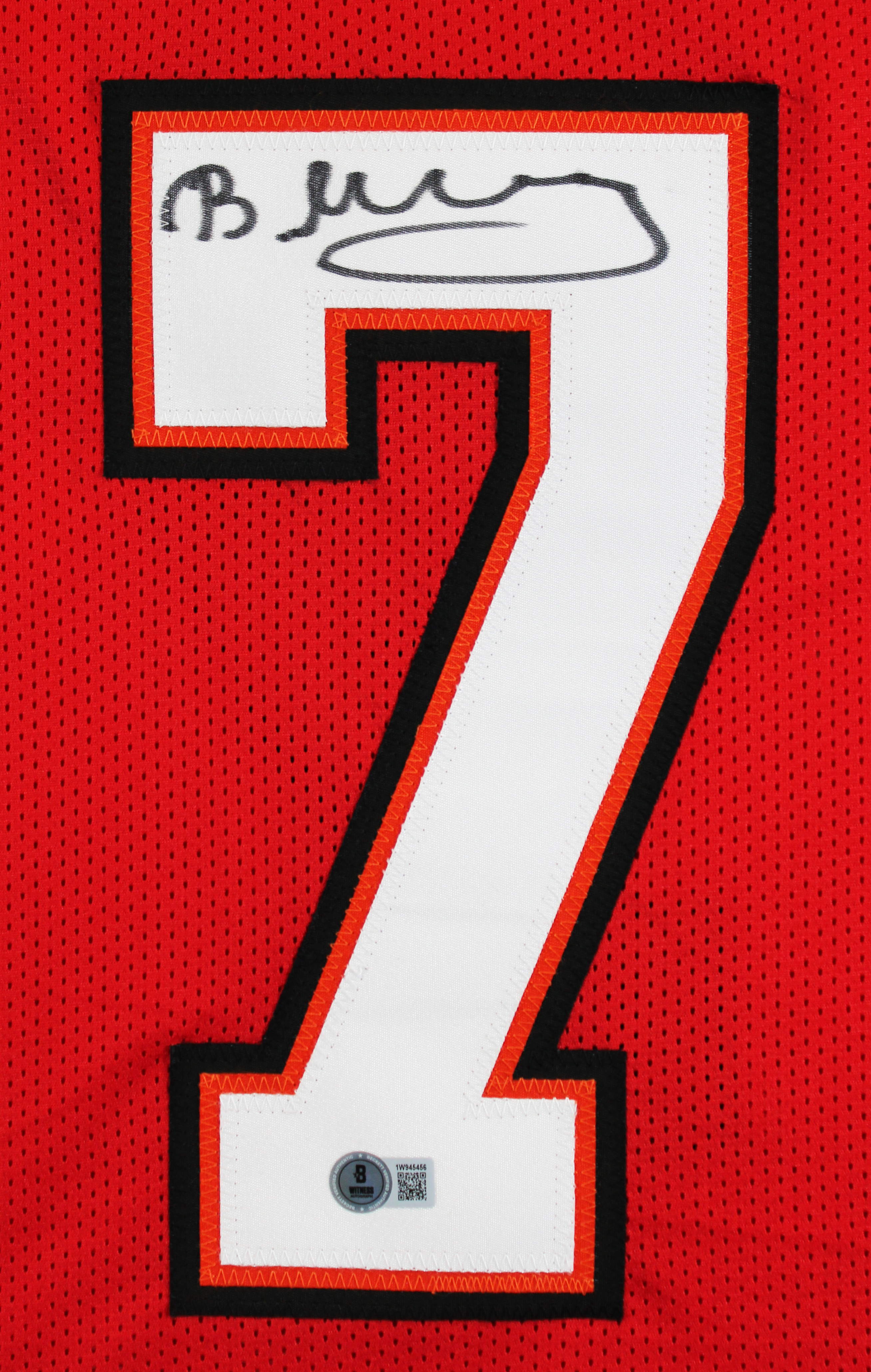 This Autographed Red Pro Style Framed Jersey has been Personally Signed by Bucky Irving of the Tampa Bay Buccaneers. This item is 100% Authentic to include a hologram by Beckett Authentication Services. This item will come with an affixed Beckett Authentication Services (BAS) authentication sticker, which includes a scannable QR code to verify authenticity. Please note that Beckett no longer provides serial-numbered COA cards, and the attached BAS sticker will serve as the complete authentication for this item. This is a BAS Witnessed Protection Program item which means a Beckett Authentication Service representative was present when this item was being signed. We conducted an autograph signing with Bucky Irving where multiples of the same item were signed. While the photographs are representative of this item, the size, placement and strength of the signature may vary. Each item is hand signed, therefore, each autograph is unique. This item can be verified through BAS Witnessed. This item has been professionally framed to overall dimensions of approximately 32 x 37 inches. This is a X-Large sized, non-branded, custom-stitched Framed Jersey. This jersey will be framed to order, it will take approximately 4-5 business days from purchase date for it to ship.