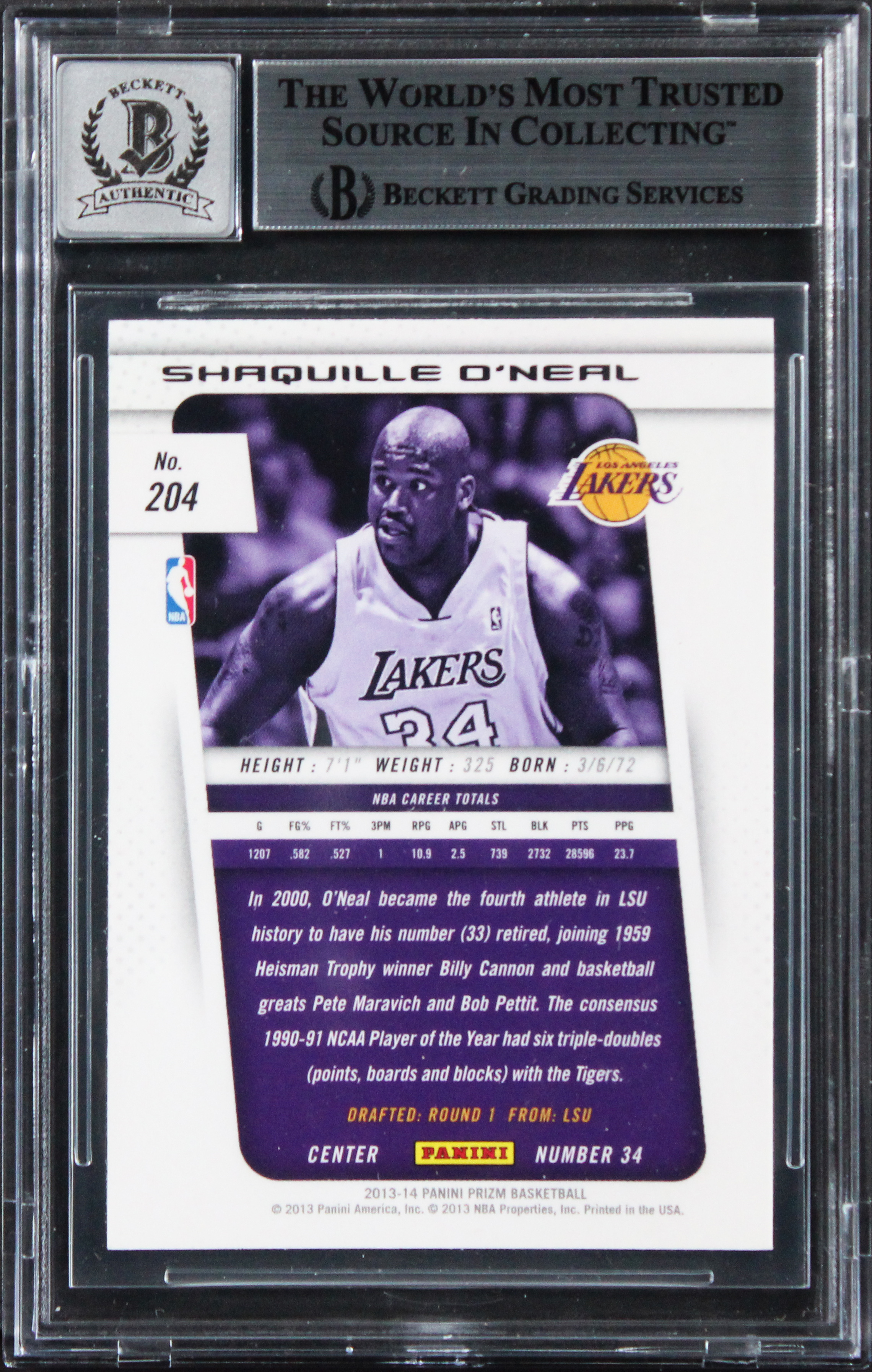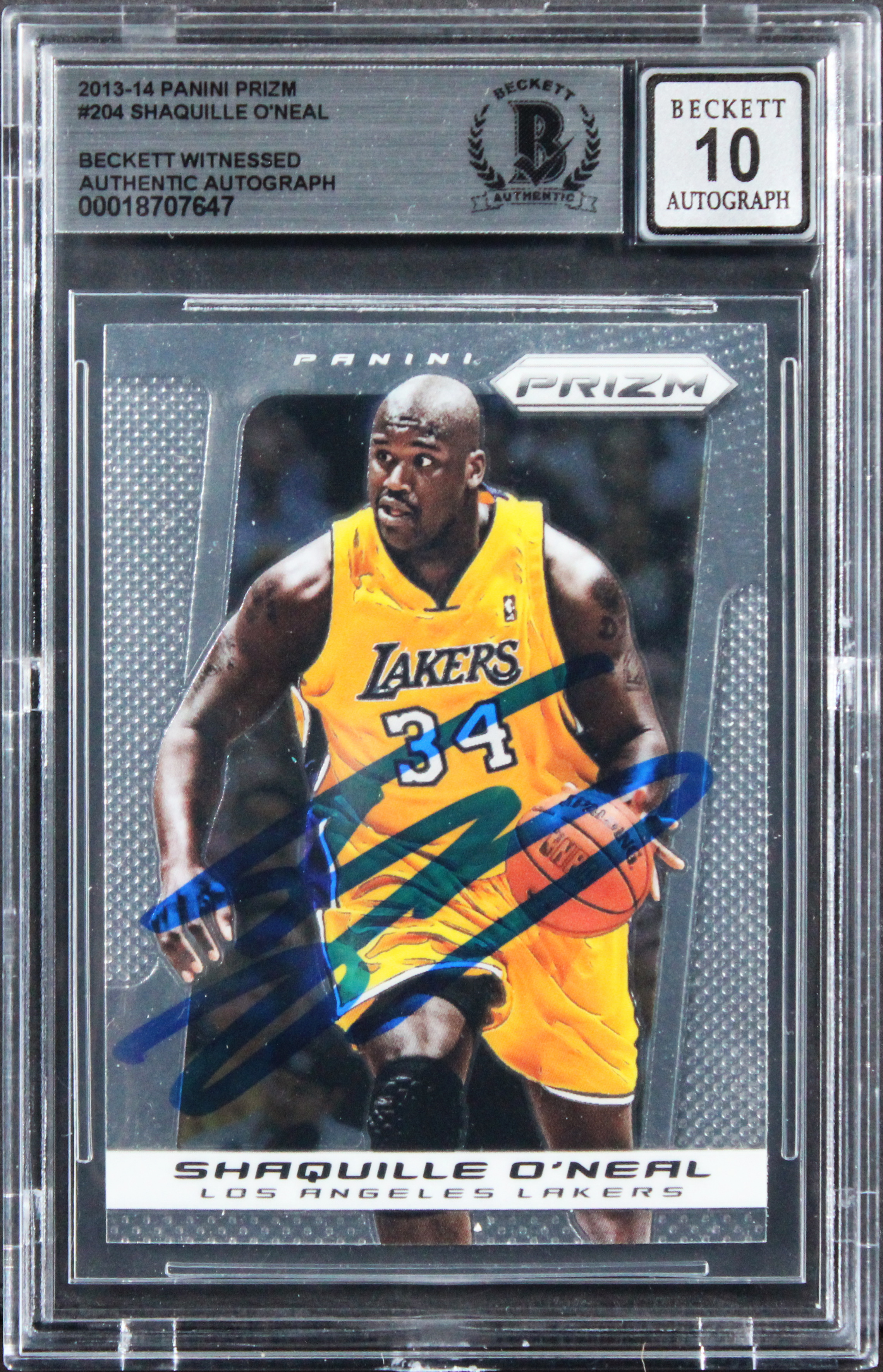 This Autographed Auto Grade Gem Mint 10! 2013 Panini Prizm #204 Card has been Personally Signed by Shaquille O'Neal of the Los Angeles Lakers. This item is 100% Authentic, it comes slabbed and authenticated by Beckett Authentication Services. We have multiples of this same item. While the photographs are representative of this item, the size, placement and strength of the signature may vary. Each item is hand signed, therefore, each autograph is unique.
