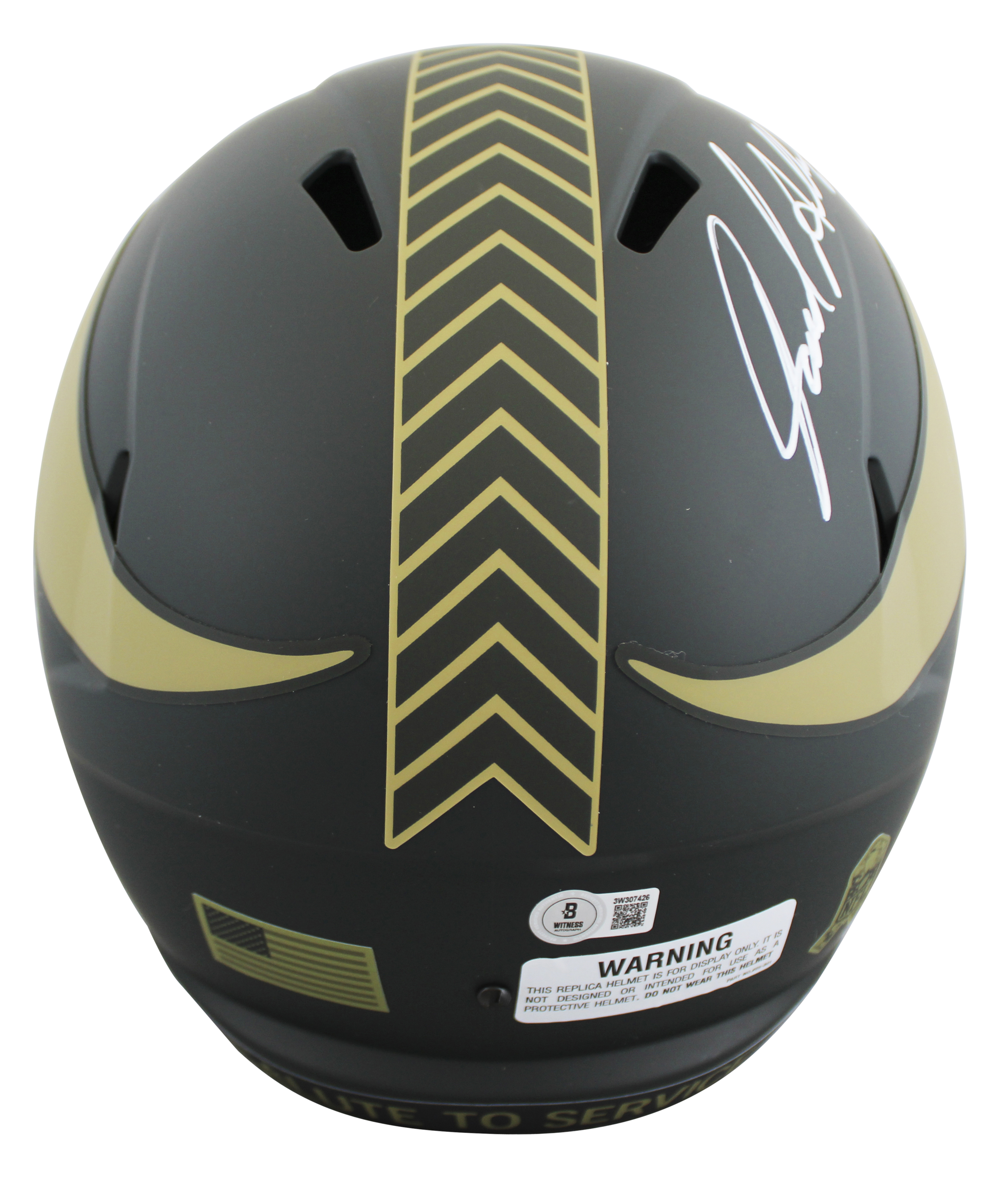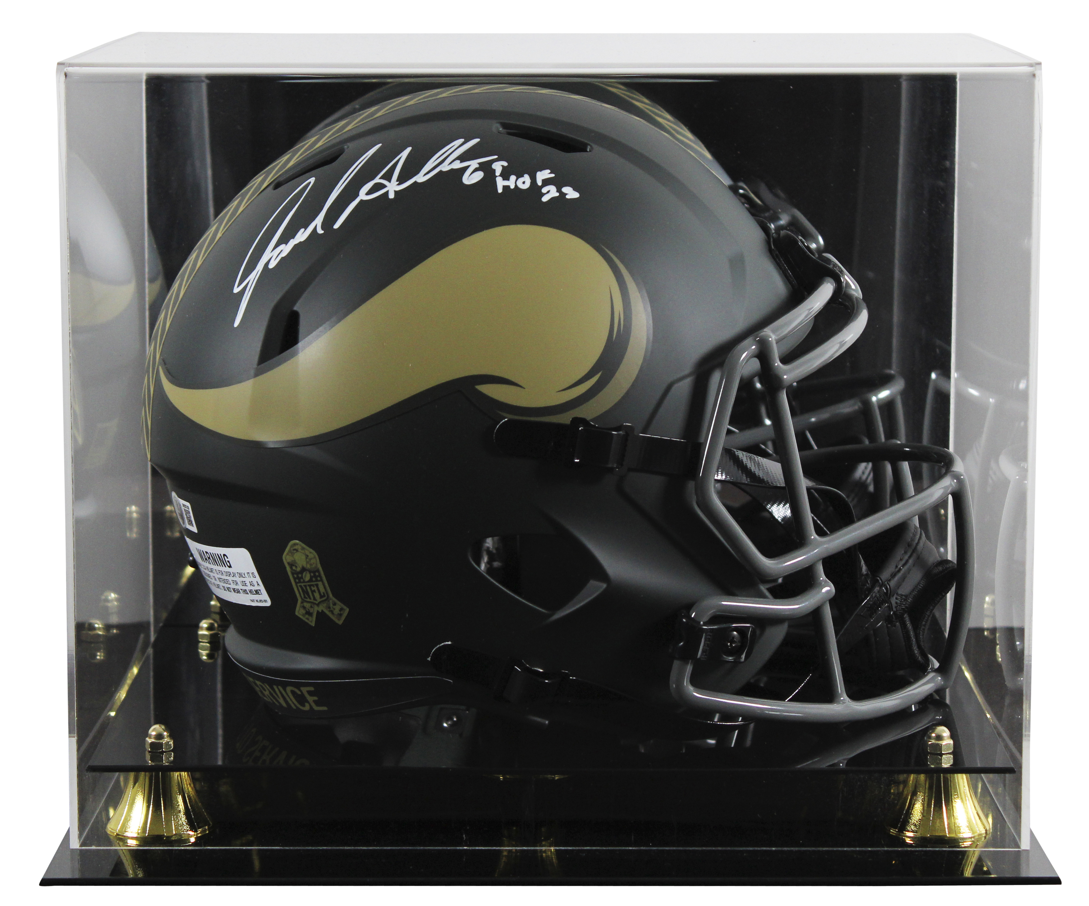 This Autographed Alternate 2025 Salute To Service IV Riddell Full Size Speed Rep Helmet W/ Uv Mirrored Back Acrylic Display Case with the inscription of "HOF 25" has been Personally Signed by Jared Allen of the Minnesota Vikings. This item is 100% Authentic to include a hologram by Beckett Authentication Services. This item will come with an affixed Beckett Authentication Services (BAS) authentication sticker, which includes a scannable QR code to verify authenticity. Please note that Beckett no longer provides serial-numbered COA cards, and the attached BAS sticker will serve as the complete authentication for this item. This is a BAS Witnessed Protection Program item which means a Beckett Authentication Service representative was present when this item was being signed. We conducted an autograph signing with Jared Allen where multiples of the same item were signed. While the photographs are representative of this item, the size, placement and strength of the signature may vary. Each item is hand signed, therefore, each autograph is unique. This item can be verified through BAS Witnessed.