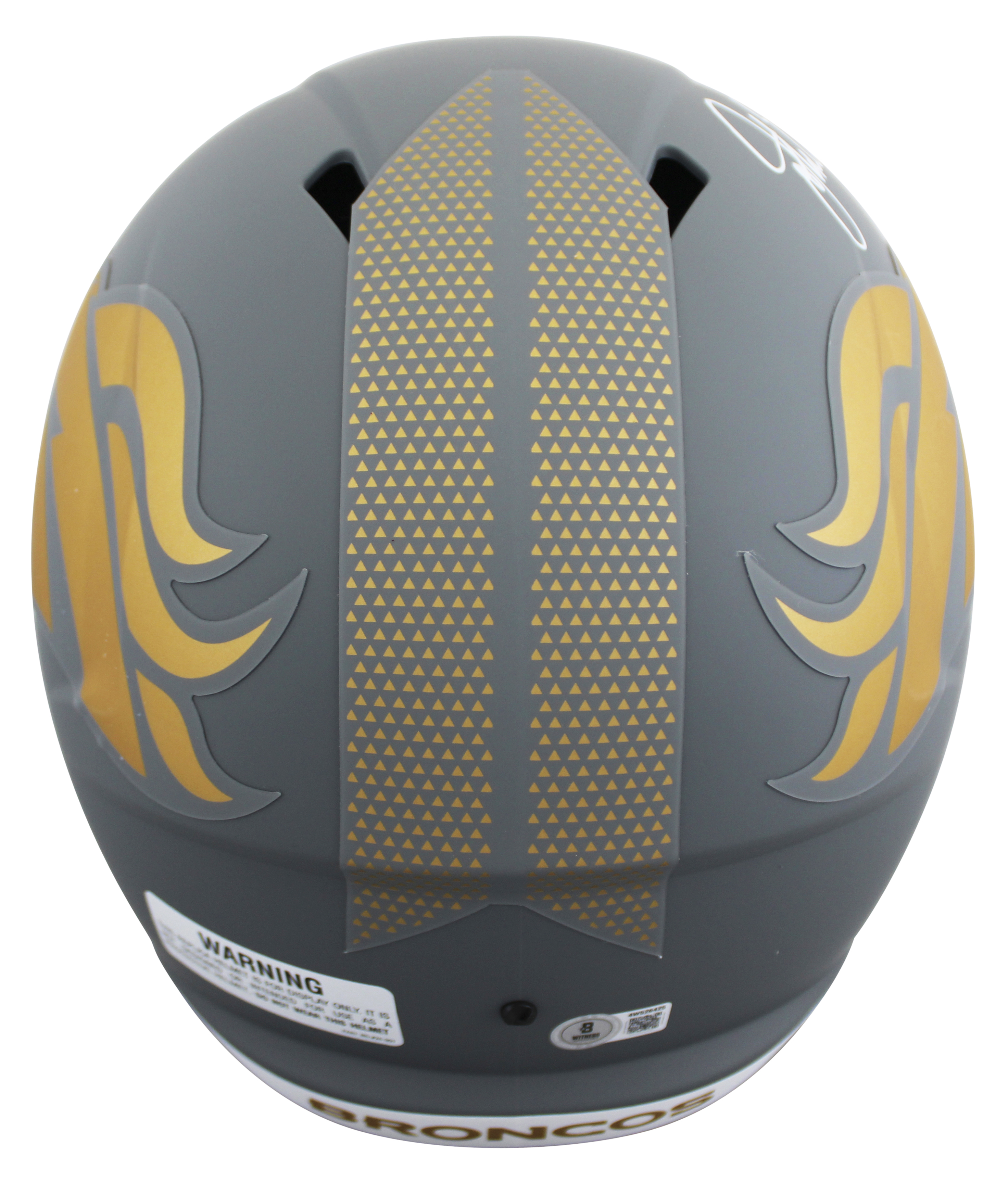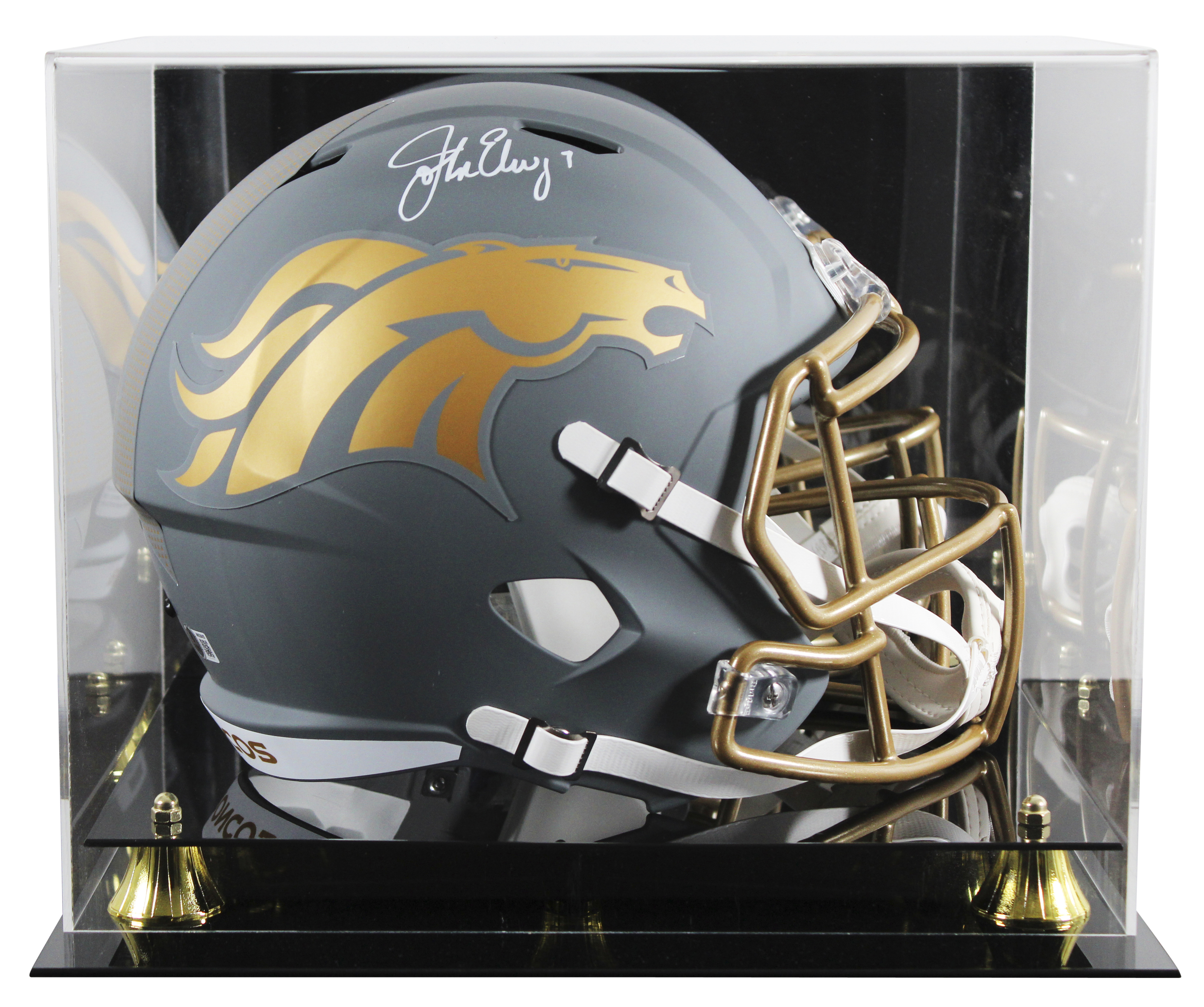 This Autographed Alternate Slate Riddell Full Size Speed Rep Helmet W/ Uv Mirrored Back Acrylic Display Case has been Personally Signed by John Elway of the Denver Broncos. This item is 100% Authentic to include a hologram by Beckett Authentication Services. This item will come with an affixed Beckett Authentication Services (BAS) authentication sticker, which includes a scannable QR code to verify authenticity. Please note that Beckett no longer provides serial-numbered COA cards, and the attached BAS sticker will serve as the complete authentication for this item. This is a BAS Witnessed Protection Program item which means a Beckett Authentication Service representative was present when this item was being signed. We conducted an autograph signing with John Elway where multiples of the same item were signed. While the photographs are representative of this item, the size, placement and strength of the signature may vary. Each item is hand signed, therefore, each autograph is unique. This item can be verified through BAS Witnessed.