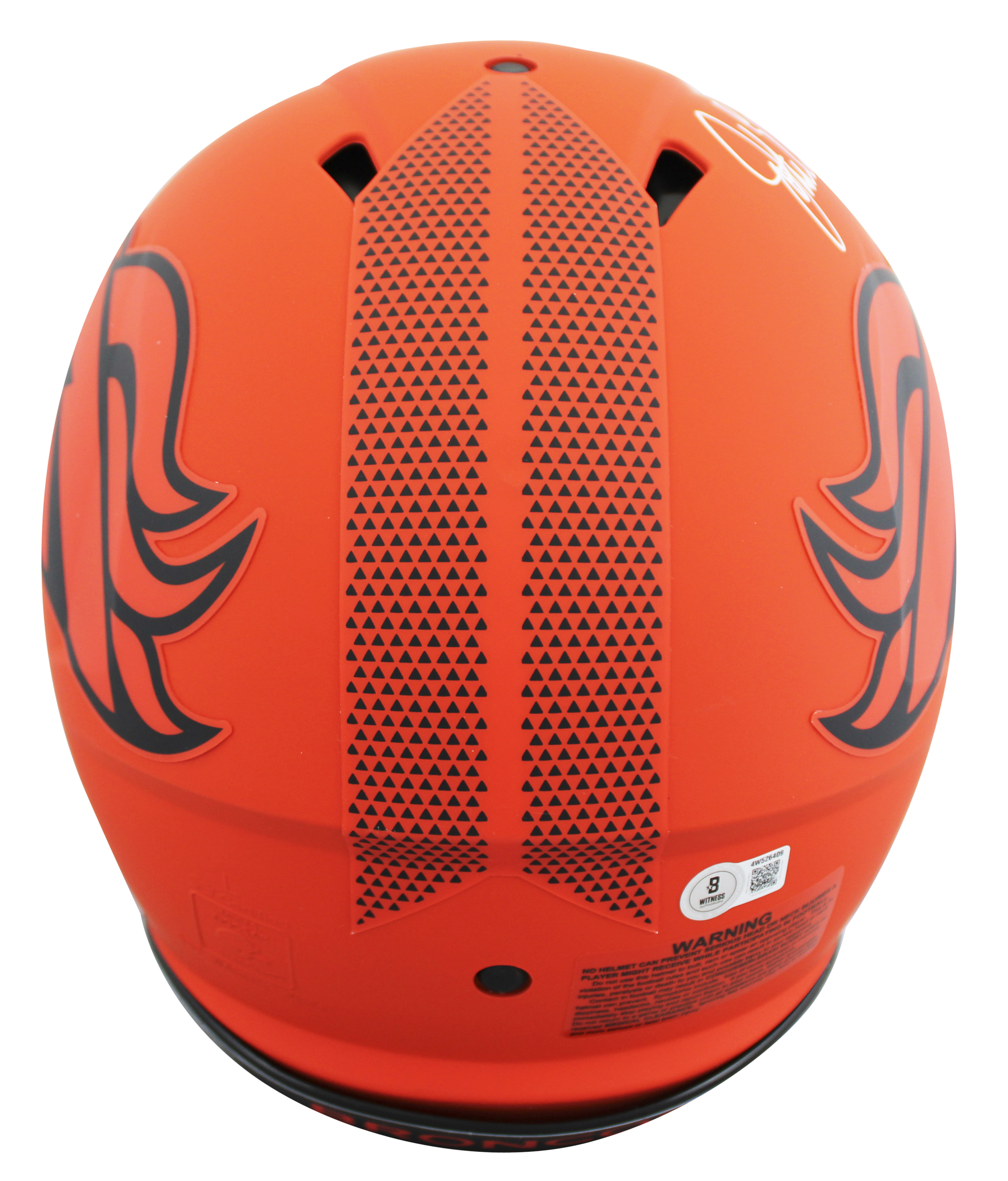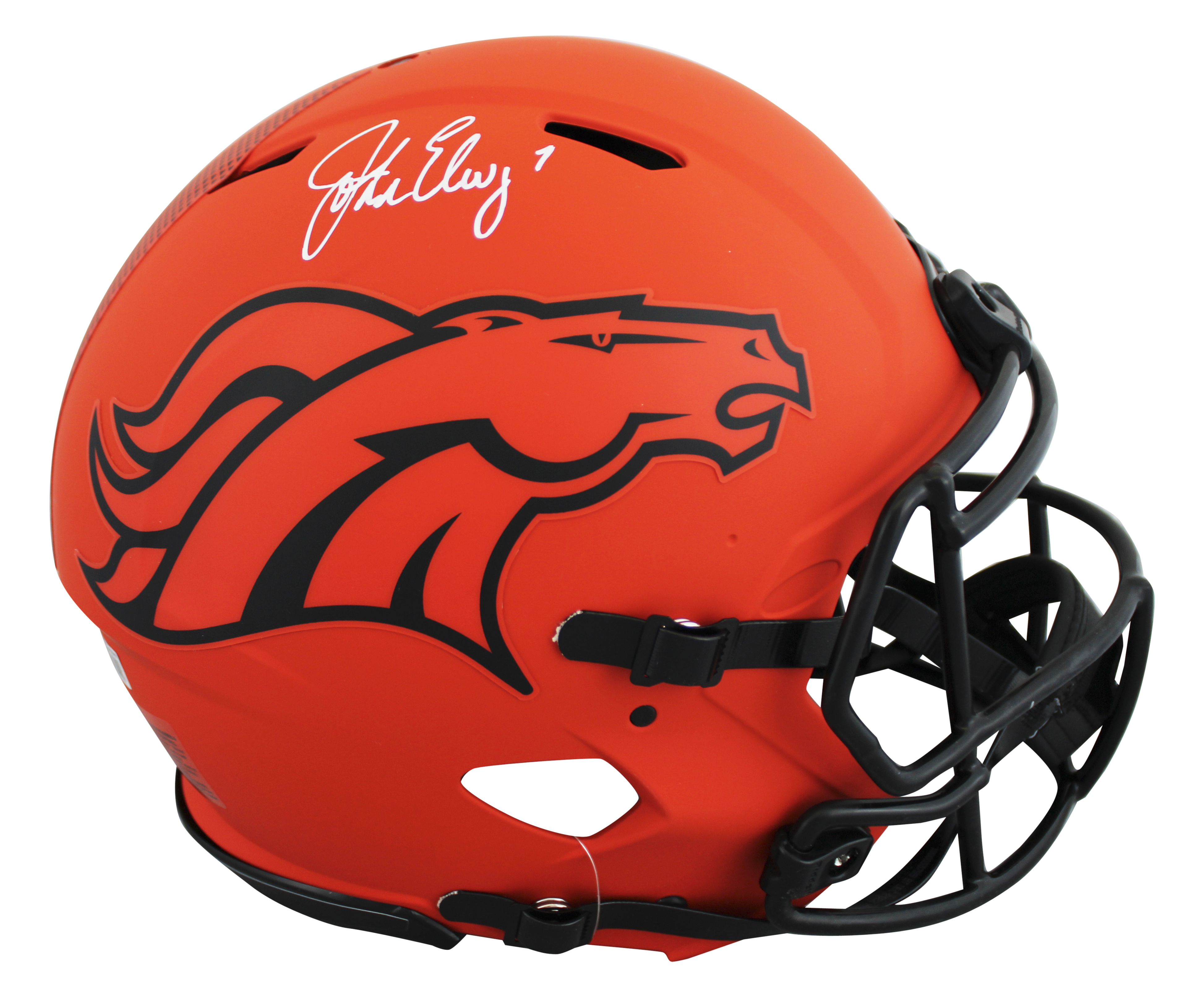 This Autographed Alternate Rave Riddell Authentic Full Size Speed Proline Helmet has been Personally Signed by John Elway of the Denver Broncos. This item is 100% Authentic to include a hologram by Beckett Authentication Services. This item will come with an affixed Beckett Authentication Services (BAS) authentication sticker, which includes a scannable QR code to verify authenticity. Please note that Beckett no longer provides serial-numbered COA cards, and the attached BAS sticker will serve as the complete authentication for this item. This is a BAS Witnessed Protection Program item which means a Beckett Authentication Service representative was present when this item was being signed. We conducted an autograph signing with John Elway where multiples of the same item were signed. While the photographs are representative of this item, the size, placement and strength of the signature may vary. Each item is hand signed, therefore, each autograph is unique. This item can be verified through BAS Witnessed.