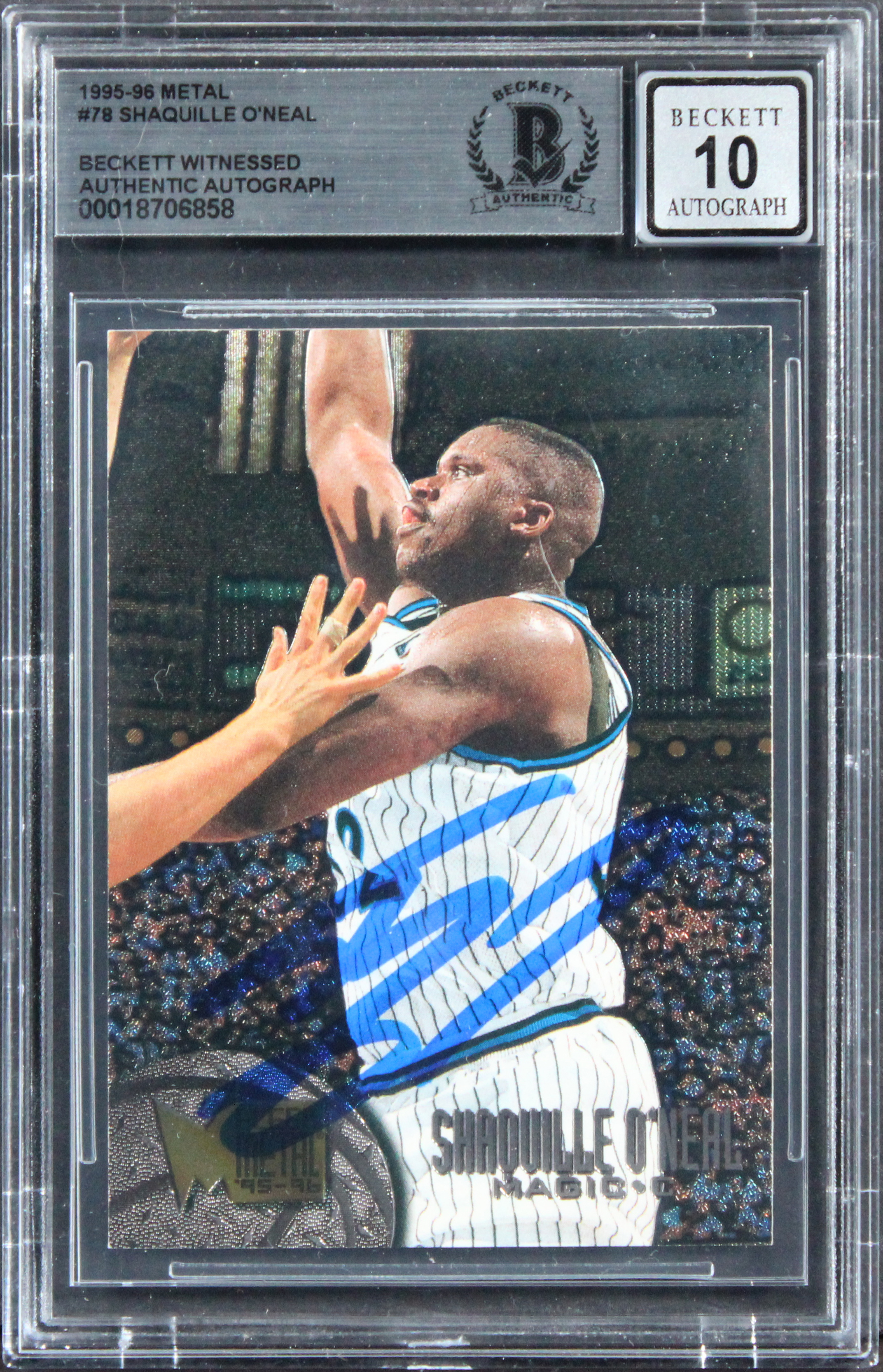 This Autographed Auto Grade Gem Mint 10! 1995 Metal #78 Card has been Personally Signed by Shaquille O'Neal of the Orlando Magic. This item is 100% Authentic, it comes slabbed and authenticated by Beckett Authentication Services. The authenticity can be verified on Beckett Authentication Services website.