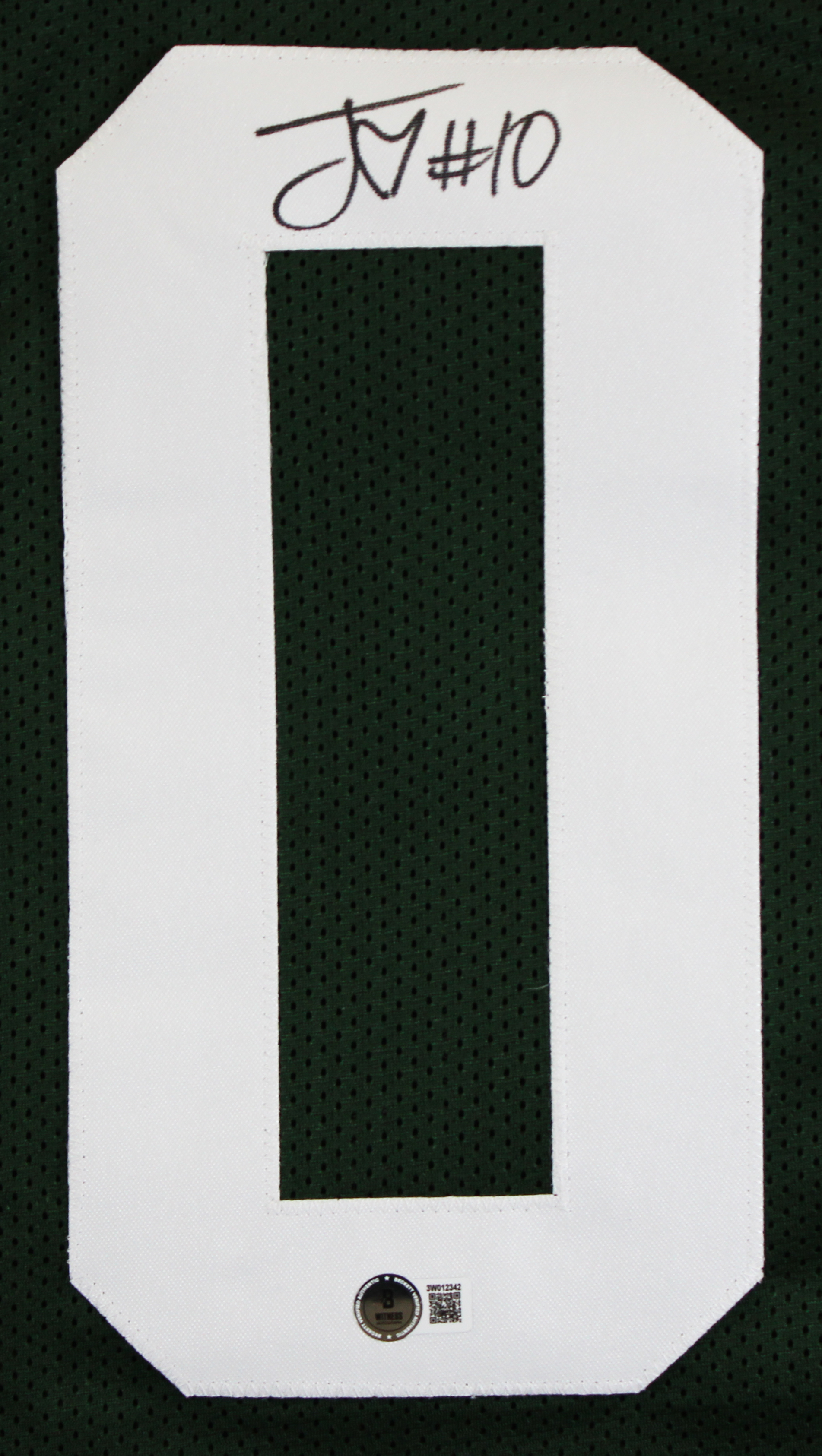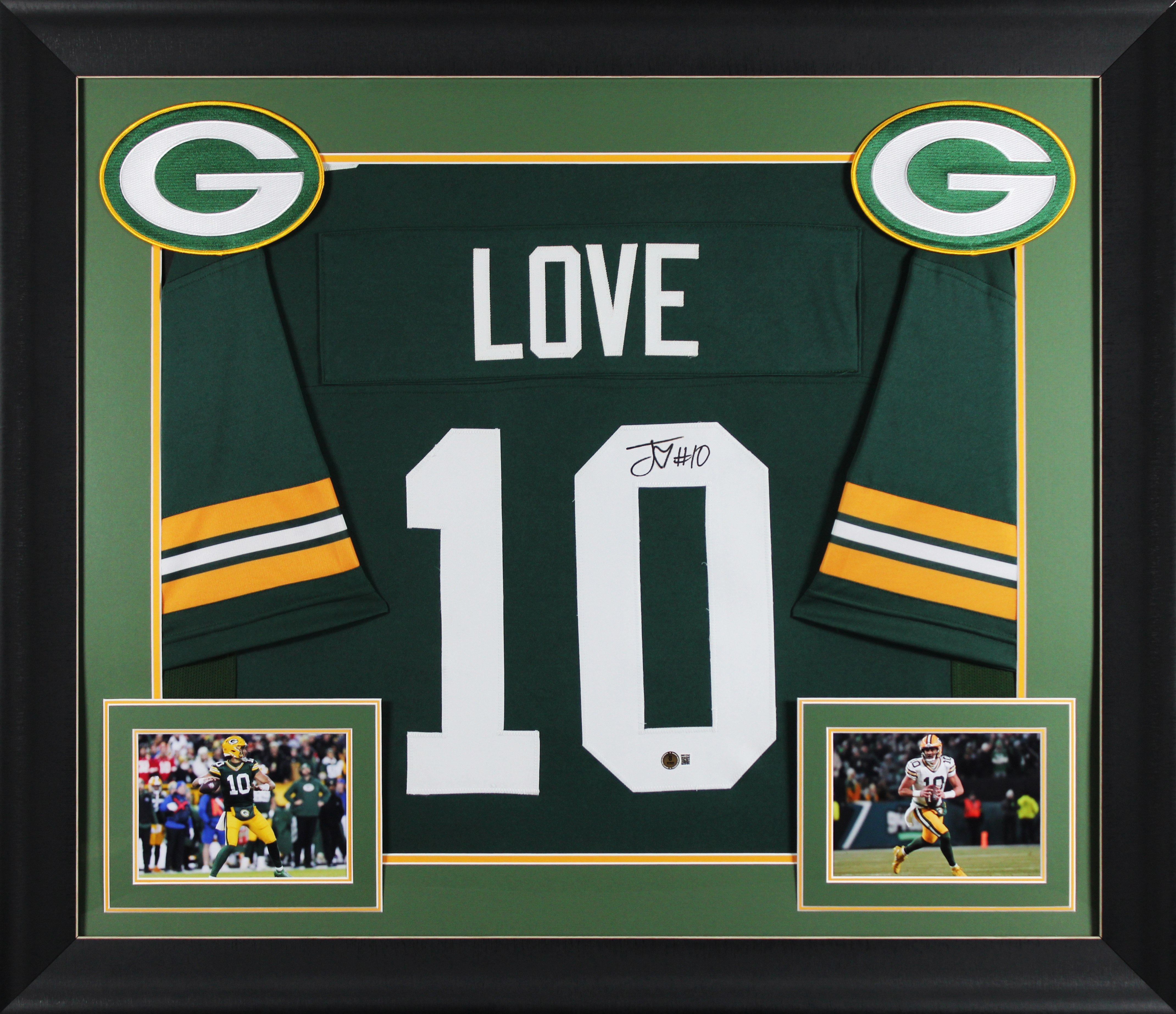 This Autographed Green Pro Style Framed Jersey has been Personally Signed by Jordan Love of the Green Bay Packers. This item is 100% Authentic to include a hologram by Beckett Authentication Services. This item will come with an affixed Beckett Authentication Services (BAS) authentication sticker, which includes a scannable QR code to verify authenticity. Please note that Beckett no longer provides serial-numbered COA cards, and the attached BAS sticker will serve as the complete authentication for this item. This is a BAS Witnessed Protection Program item which means a Beckett Authentication Service representative was present when this item was being signed. We conducted an autograph signing with Jordan Love where multiples of the same item were signed. While the photographs are representative of this item, the size, placement and strength of the signature may vary. Each item is hand signed, therefore, each autograph is unique. This item can be verified through BAS Witnessed. This item has been professionally framed to overall dimensions of approximately 32 x 37 inches. This is a X-Large sized, non-branded, custom-stitched Framed Jersey. This jersey will be framed to order, it will take approximately 4-5 business days from purchase date for it to ship.