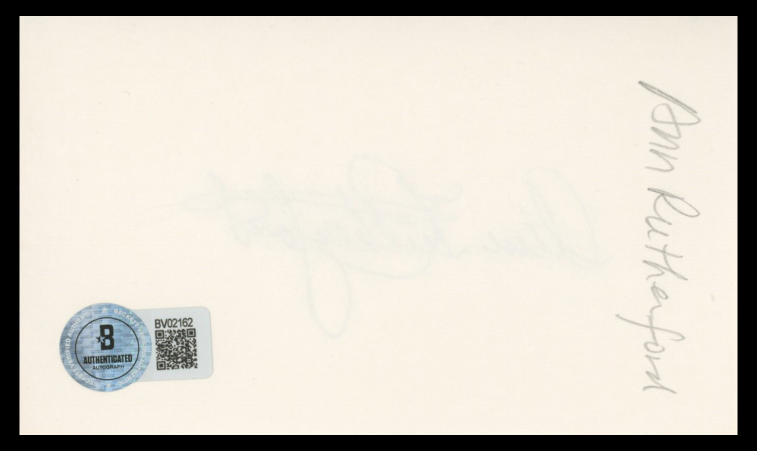 This Autographed 3x5 Index Card has been Personally Signed by Ann Rutherford of Gone with the Wind. This item is 100% Authentic to include a hologram by Beckett Authentication Services. This item will come with an affixed Beckett Authentication Services (BAS) authentication sticker, which includes a scannable QR code to verify authenticity. Please note that Beckett no longer provides serial-numbered COA cards, and the attached BAS sticker will serve as the complete authentication for this item. The authenticity can be verified on Beckett Authentication Services website.