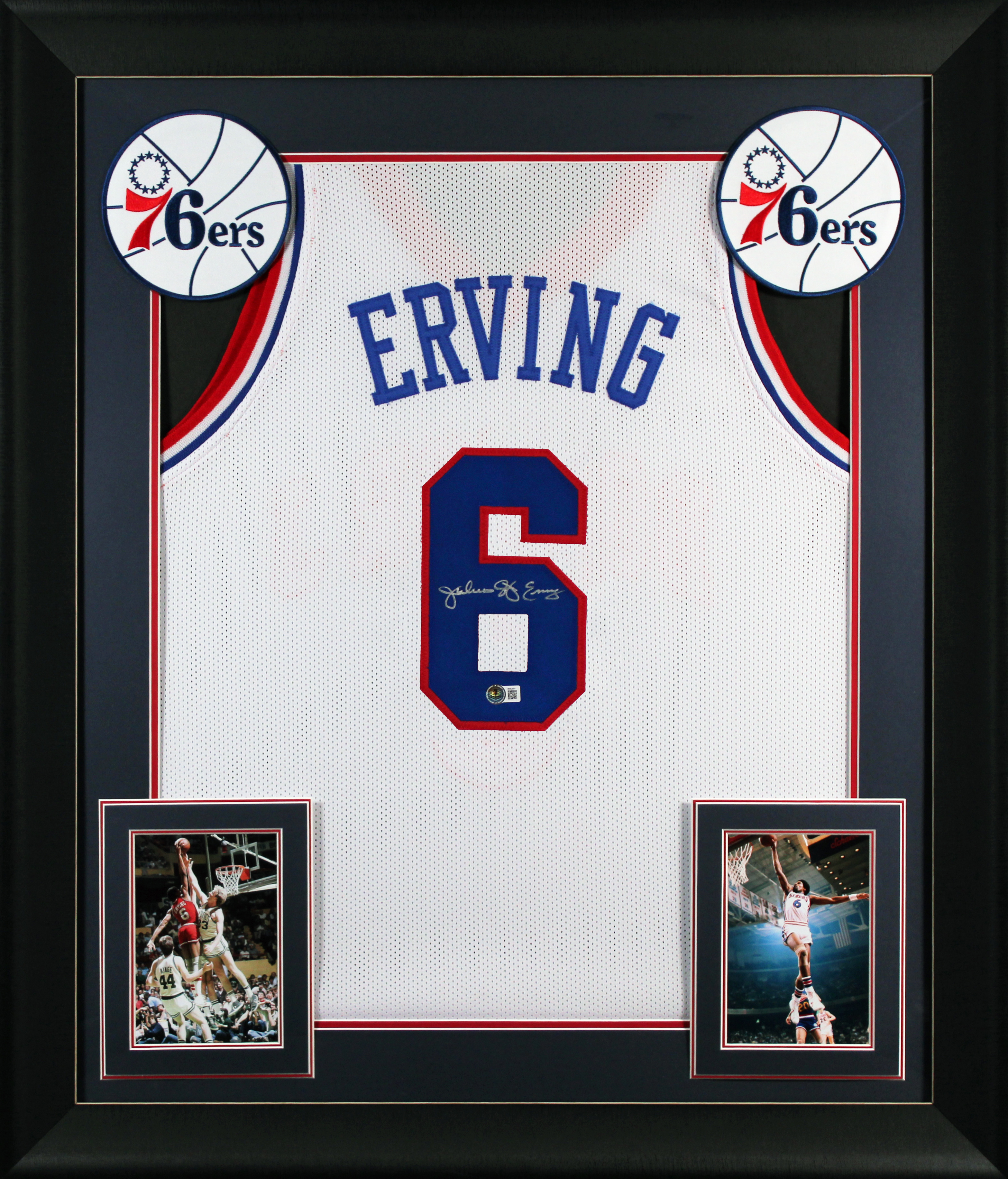This Autographed White Pro Style Framed Jersey has been Personally Signed by Julius "Dr. J" Erving of the Philadelphia 76ers. This item is 100% Authentic to include a hologram by Beckett Authentication Services. This item will come with an affixed Beckett Authentication Services (BAS) authentication sticker, which includes a scannable QR code to verify authenticity. Please note that Beckett no longer provides serial-numbered COA cards, and the attached BAS sticker will serve as the complete authentication for this item. We conducted an autograph signing with Julius "Dr. J" Erving where multiples of the same item were signed. While the photographs are representative of this item, the size, placement and strength of the signature may vary. Each item is hand signed, therefore, each autograph is unique. This item can be verified through BAS. This item has been professionally framed to overall dimensions of approximately 32 x 37 inches. This is a X-Large sized, non-branded, custom-stitched Framed Jersey. This jersey will be framed to order, it will take approximately 4-5 business days from purchase date for it to ship.