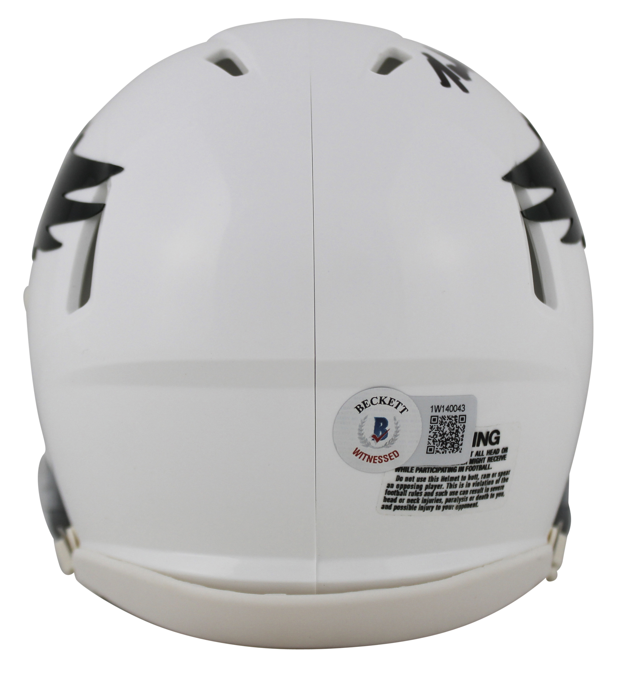 This Autographed 1969-73 Throwback Speed Mini Helmet has been Personally Signed by Randall Cunningham of the Philadelphia Eagles. This item is 100% Authentic to include a hologram by Beckett Authentication Services. This item will come with an affixed Beckett Authentication Services (BAS) authentication sticker, which includes a scannable QR code to verify authenticity. Please note that Beckett no longer provides serial-numbered COA cards, and the attached BAS sticker will serve as the complete authentication for this item. This is a BAS Witnessed Protection Program item which means a Beckett Authentication Service representative was present when this item was being signed. We conducted an autograph signing with Randall Cunningham where multiples of the same item were signed. While the photographs are representative of this item, the size, placement and strength of the signature may vary. Each item is hand signed, therefore, each autograph is unique. This item can be verified through BAS Witnessed.