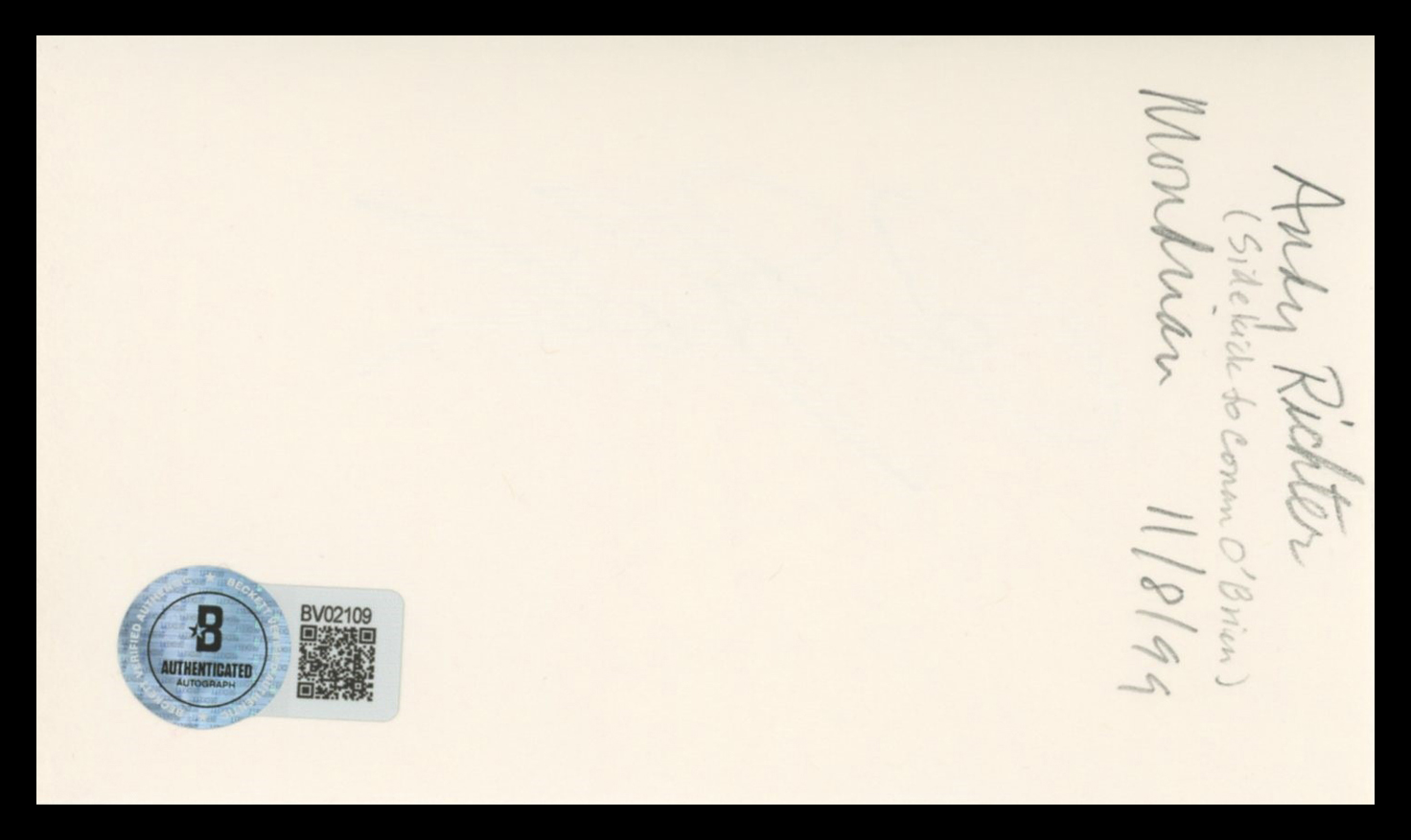 This Autographed 3x5 Index Card has been Personally Signed by Andy Richter of Conan. This item is 100% Authentic to include a hologram by Beckett Authentication Services. This item will come with an affixed Beckett Authentication Services (BAS) authentication sticker, which includes a scannable QR code to verify authenticity. Please note that Beckett no longer provides serial-numbered COA cards, and the attached BAS sticker will serve as the complete authentication for this item. The authenticity can be verified on Beckett Authentication Services website.