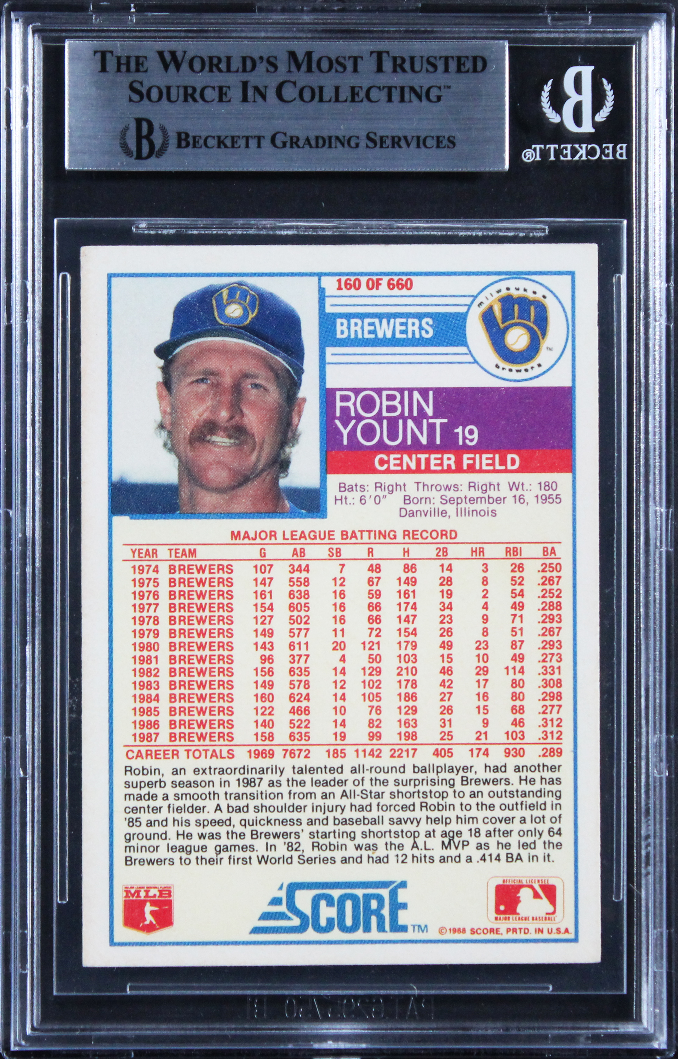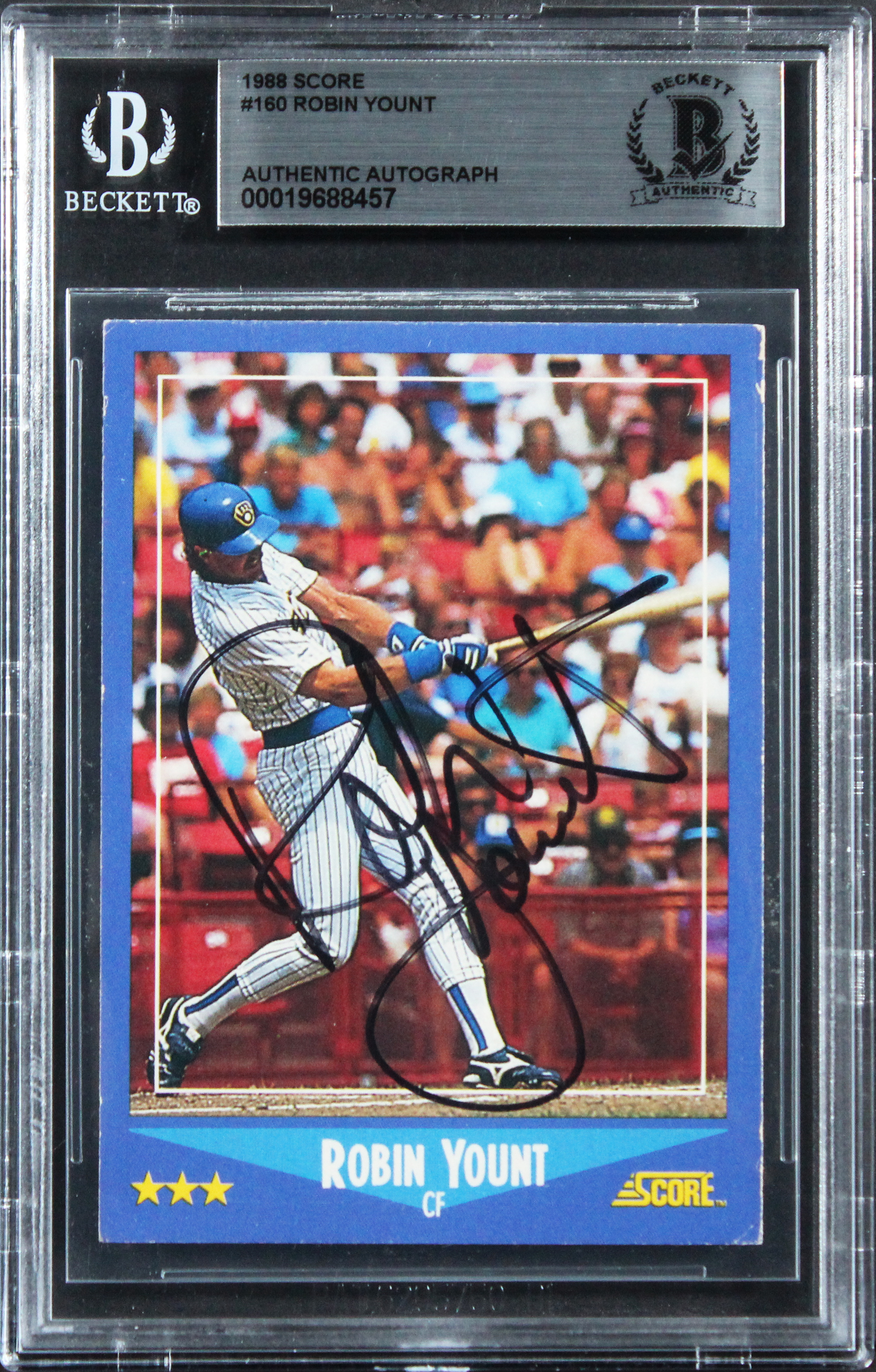 This Autographed 1988 Score #160 Card has been Personally Signed by Robin Yount of the Milwaukee Brewers. This item is 100% Authentic, it comes slabbed and authenticated by Beckett Authentication Services. The authenticity can be verified on Beckett Authentication Services website.