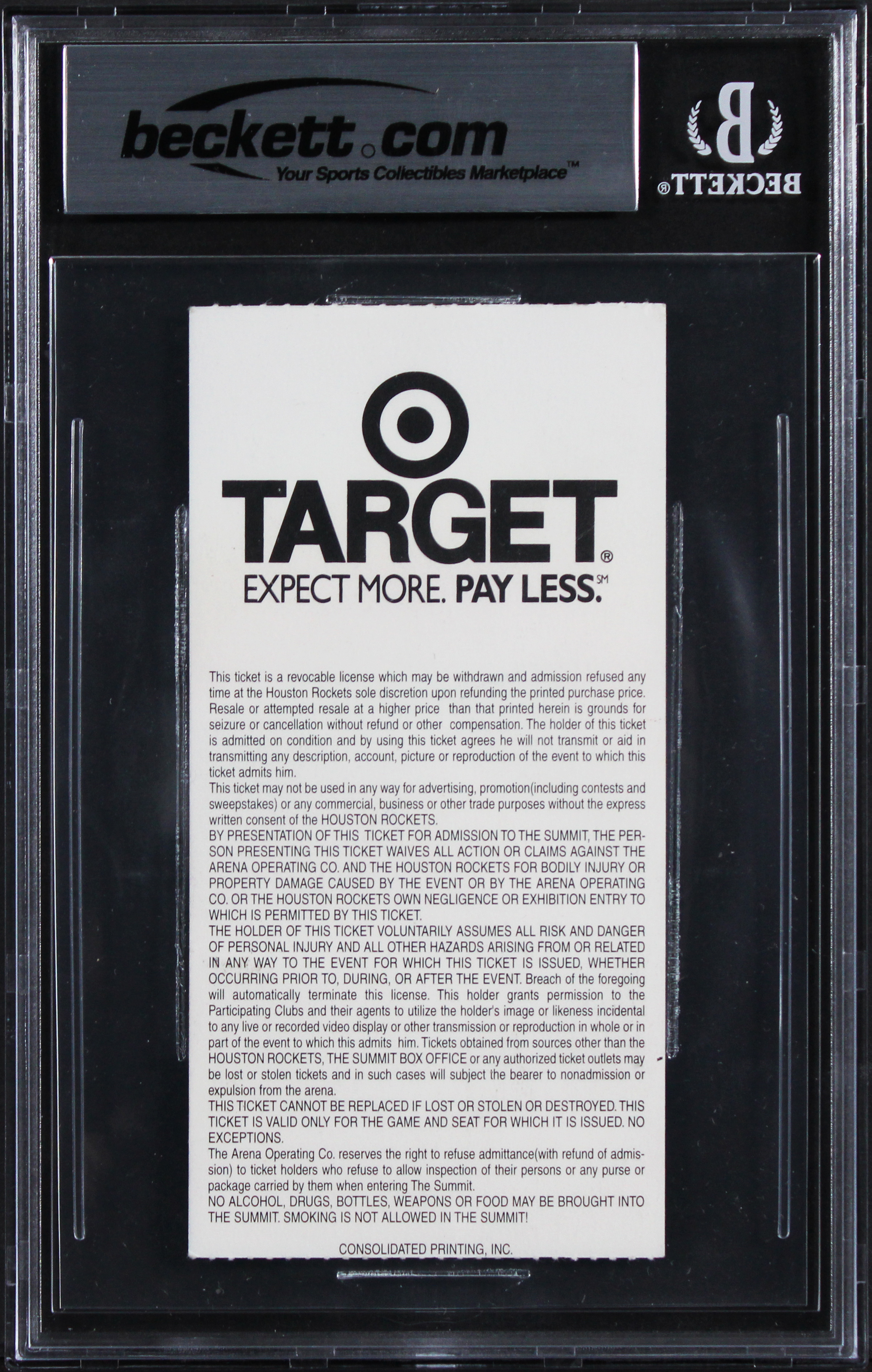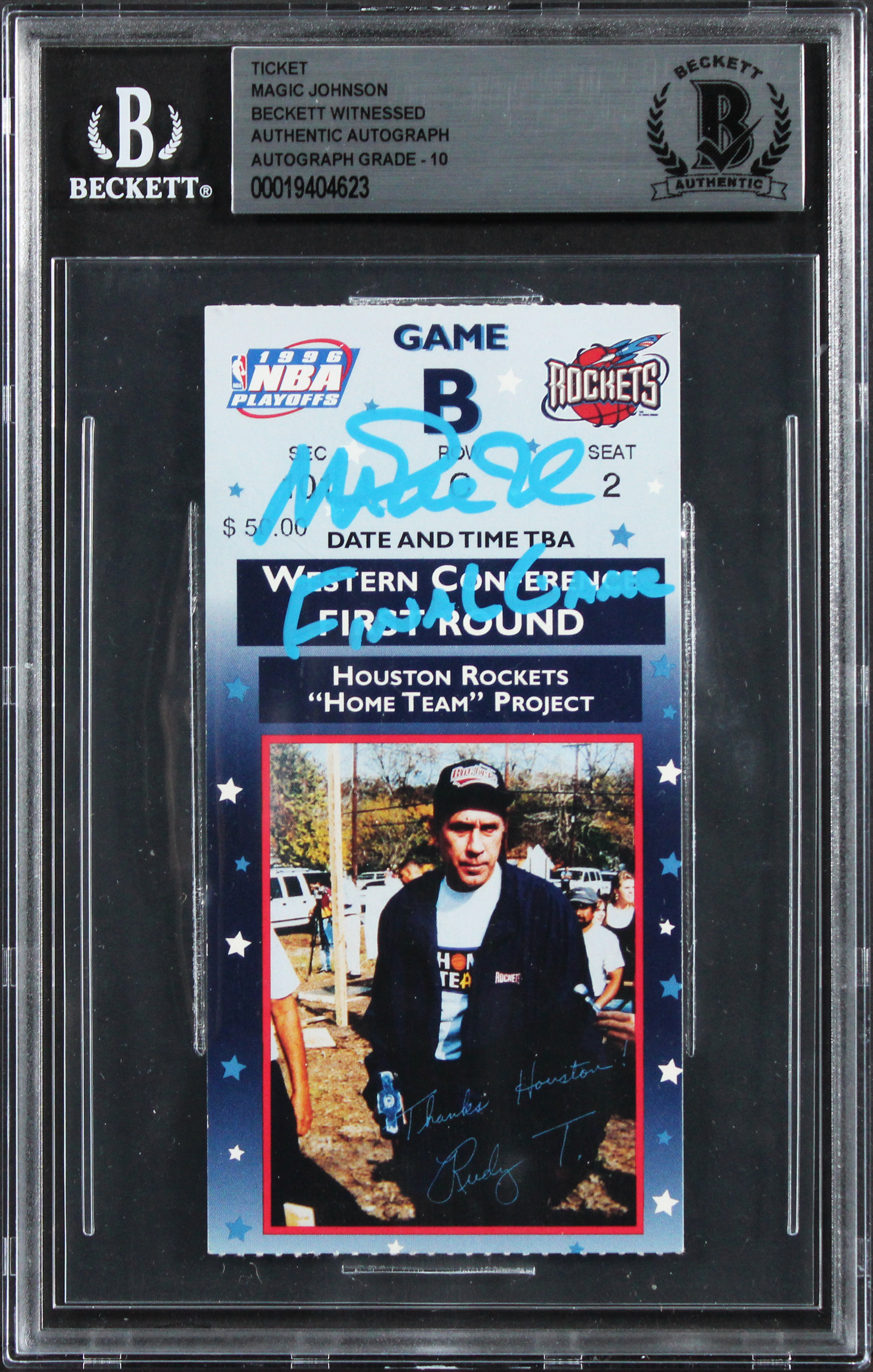 This Autographed Auto Graded Gem Mint 10! May 2, 1996 Lakers vs. Rockets Ticket Stub with the inscription of "Final Game" has been Personally Signed by Magic Johnson of the Los Angeles Lakers. This item is 100% Authentic, it comes slabbed and authenticated by Beckett Authentication Services. The authenticity can be verified on Beckett Authentication Services website.