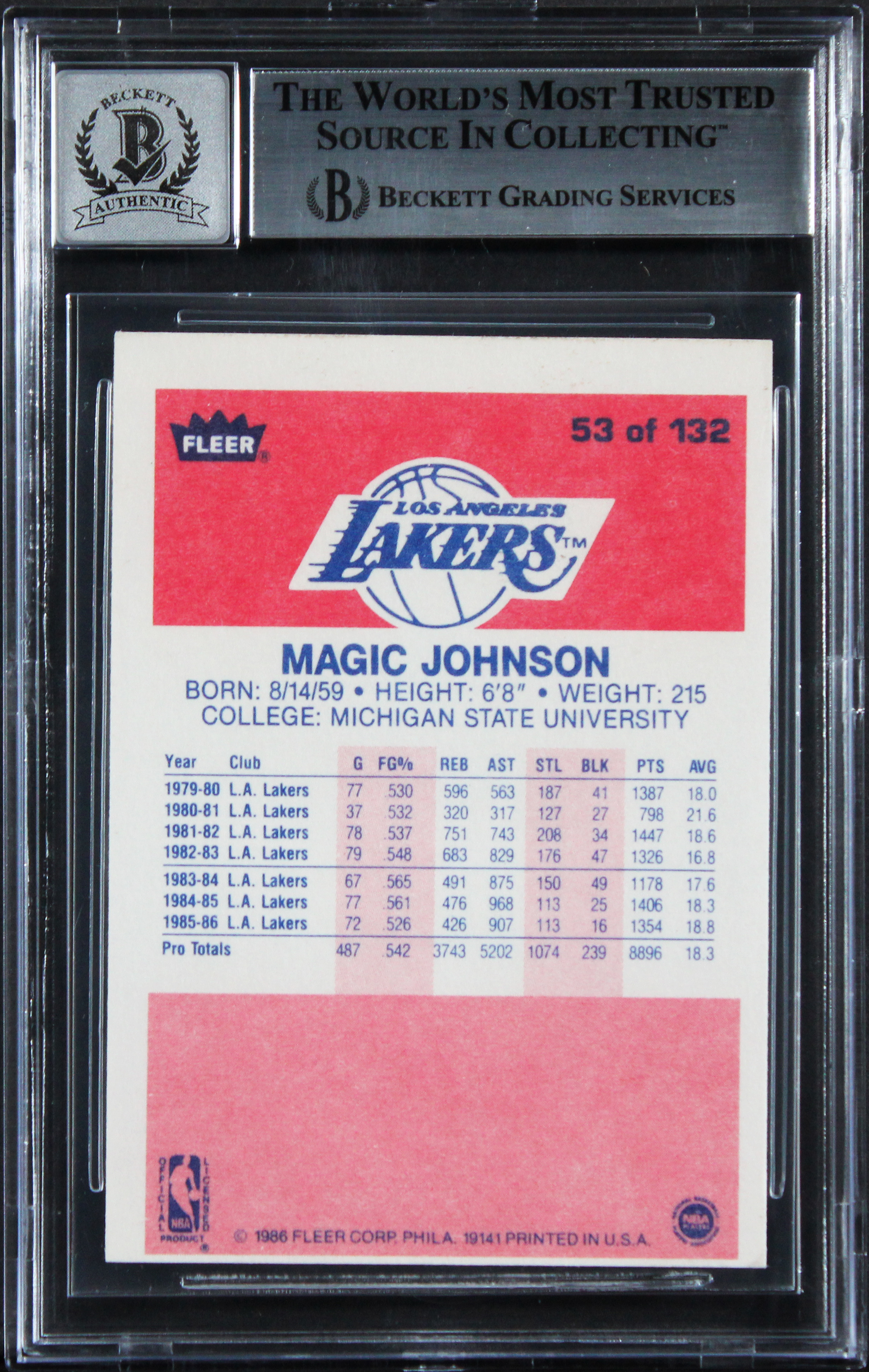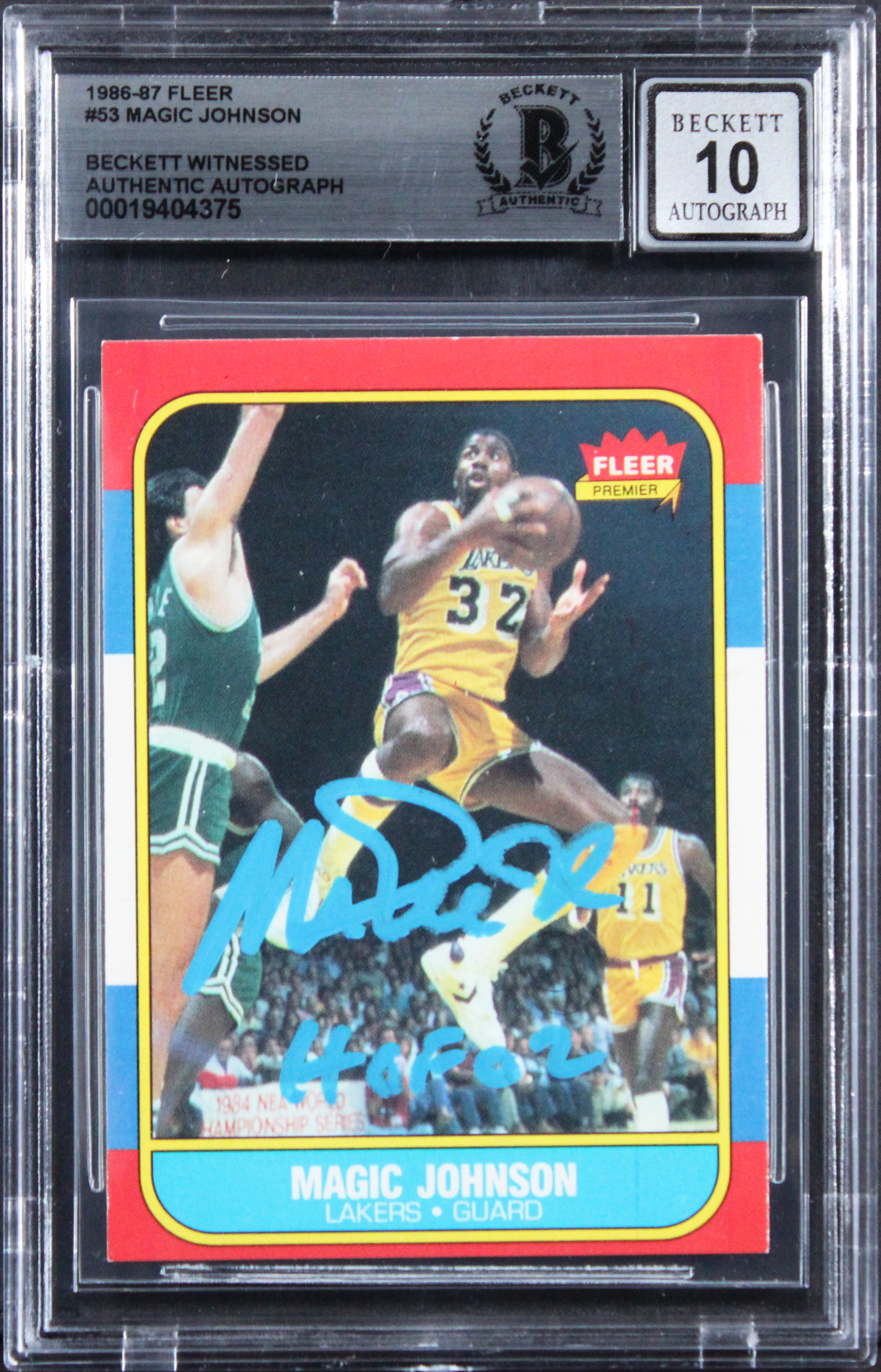 This Autographed Auto Graded Gem Mint 10! 1986 Fleer #53 Card with the inscription of "HOF 02" has been Personally Signed by Magic Johnson of the Los Angeles Lakers. This item is 100% Authentic, it comes slabbed and authenticated by Beckett Authentication Services. The authenticity can be verified on Beckett Authentication Services website.