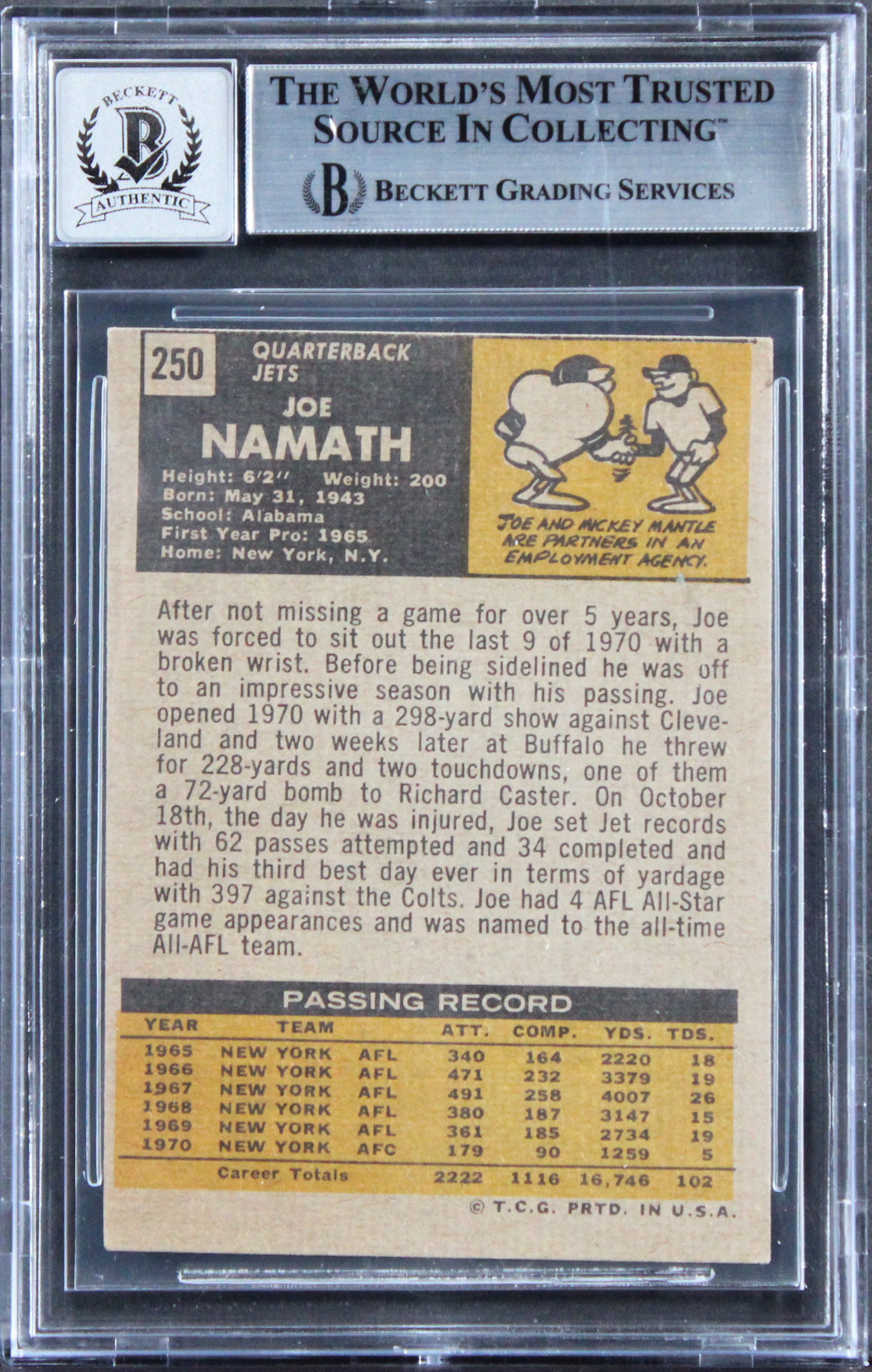 This Autographed Auto Graded Gem Mint 10! 1971 Topps #250 Card has been Personally Signed by Joe Namath of the New York Jets. This item is 100% Authentic, it comes slabbed and authenticated by Beckett Authentication Services. The authenticity can be verified on Beckett Authentication Services website.