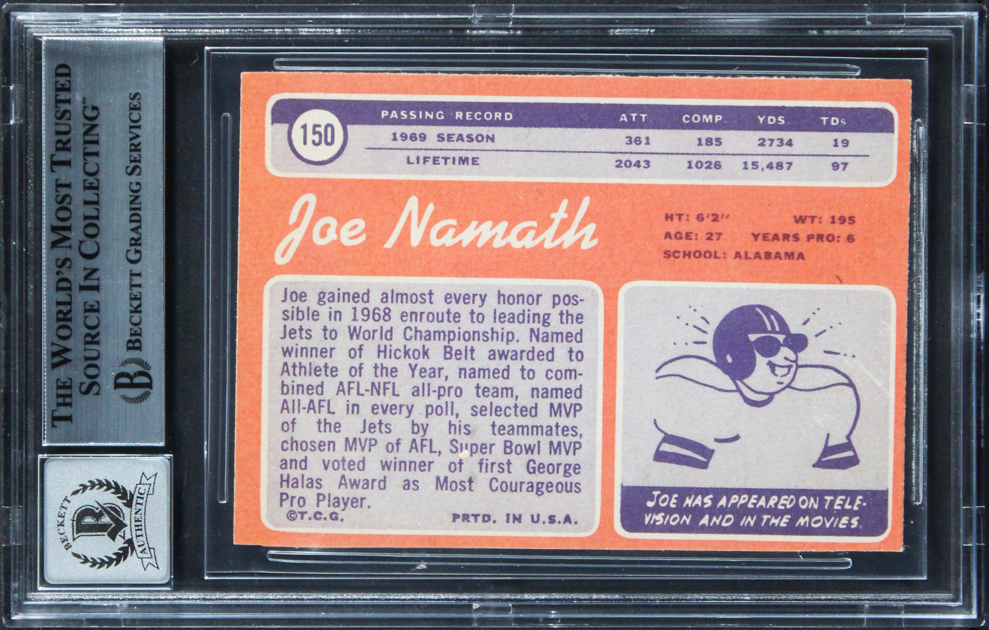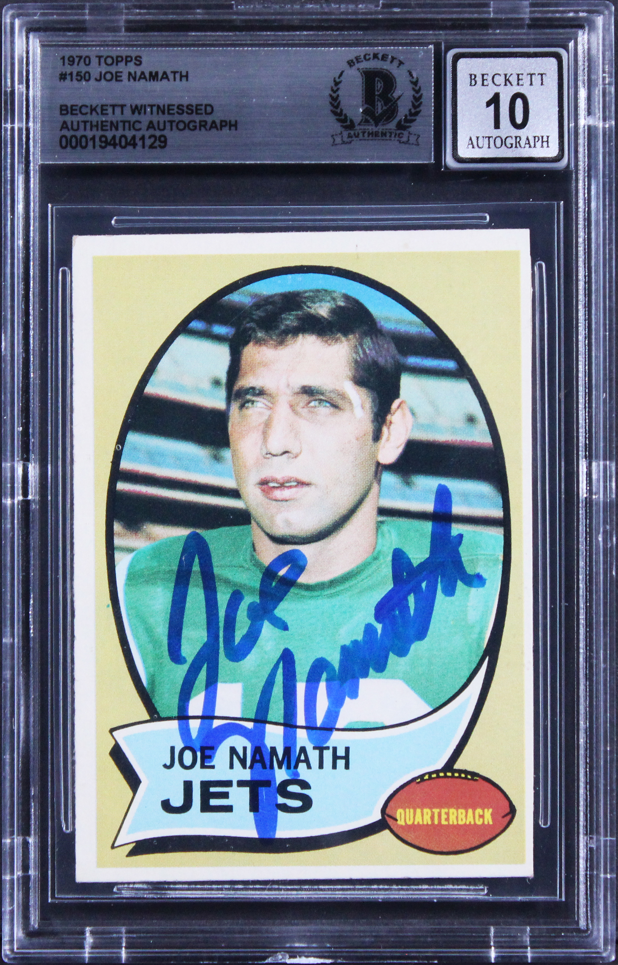 This Autographed Auto Graded Gem Mint 10! 1970 Topps #150 Card has been Personally Signed by Joe Namath of the New York Jets. This item is 100% Authentic, it comes slabbed and authenticated by Beckett Authentication Services. The authenticity can be verified on Beckett Authentication Services website.